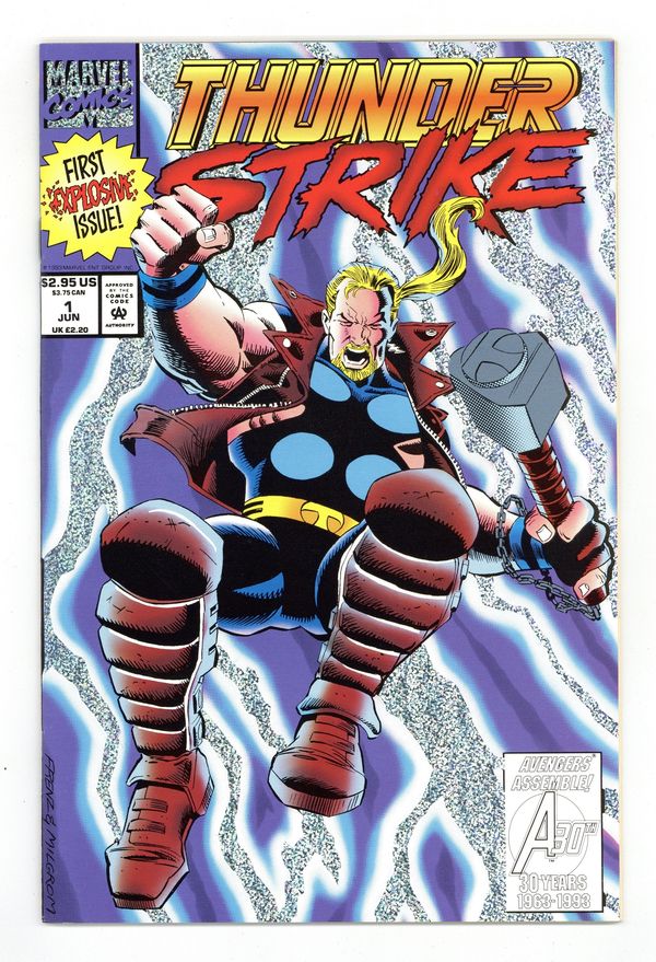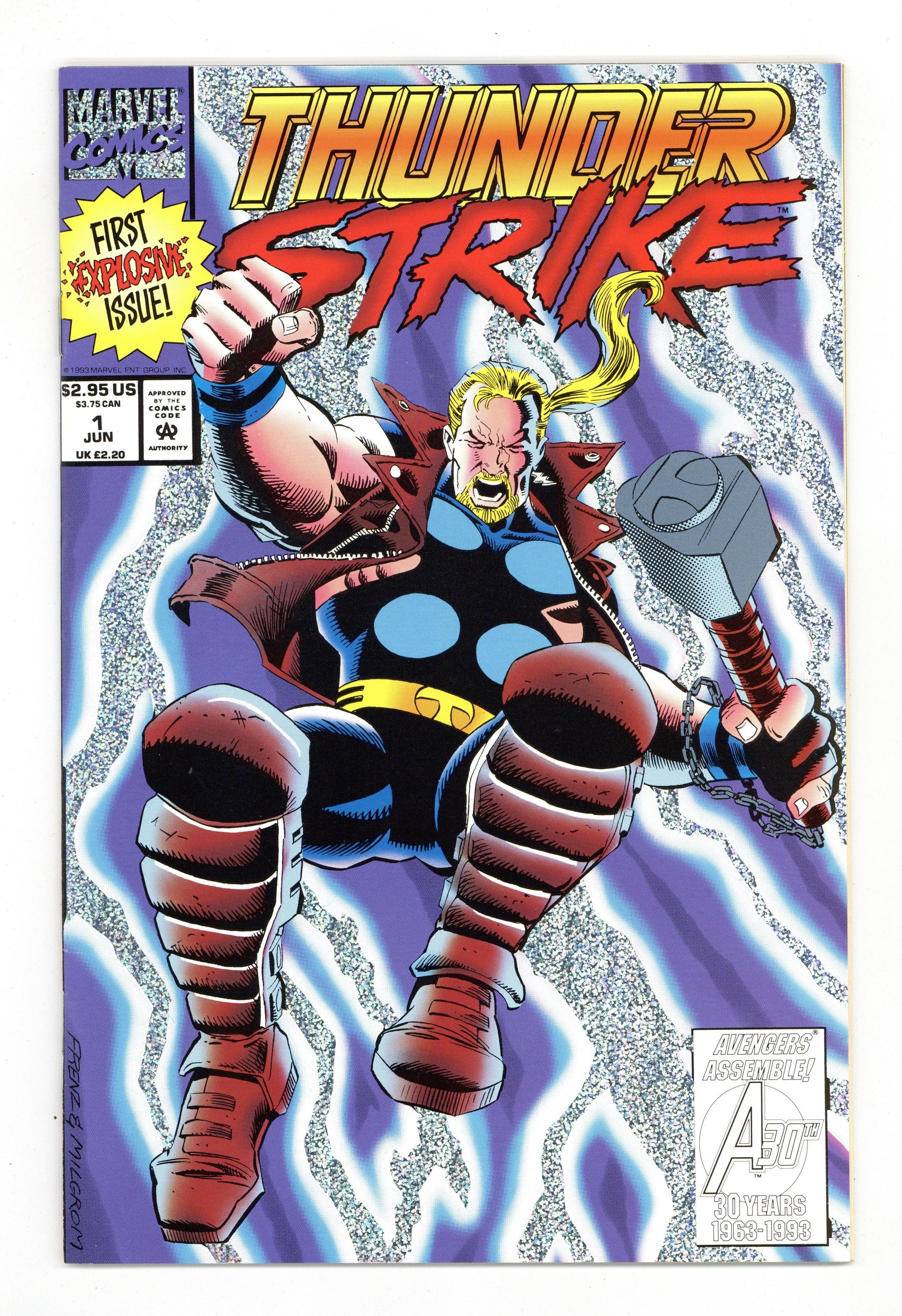 Cover by Ron Frenz and Al Milgrom. Blood Without Glory!, script by Tom DeFalco and Ron Frenz, art by Ron Frenz and Al Milgrom; A rash of carjackings in the city brings Eric Masterson and Bloodaxe to a head, with Bloodaxe coming out the victor; Determined to establish his own name and reputation, Eric changes costumes and names – Thunderstrike; During their next battle, Thunderstrike manages to disarm Bloodaxe and give him his own defeat. Silver Glitter Foil cover. 52 pgs., full color. $2.95. Cover price $2.95.