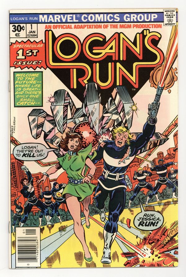 $8.00Cover by George Perez and Al Milgrom. "Logan's Run, Part 1". Part 1 of 5. Story by Gerry Conway (from the screenplay by David Zelag Goodman which was based on the novel by George Clayton Johnson and William F. Nolan). Pencils by George Perez. Inks by Klaus Janson. Welcome to the 23rd century, where life is perfect. There's just one catch. At birth everyone is implanted with a life jewel in their palm. When they reach the age of thirty, the jewel informs them they must report for termination. Not everyone accepts this however. Some choose to run. That's where Logan comes in. Logan is a Sandman, charged with terminating those who do not submit willingly. Everything changes when Logan meets Jessica and learns the secret of the Ankh she wears. This leads him to be assigned to find Sanctuary, the destination of all runners. To accomplish this task, he must become a runner himself. 32 pages. Full color. Cover price $0.30.