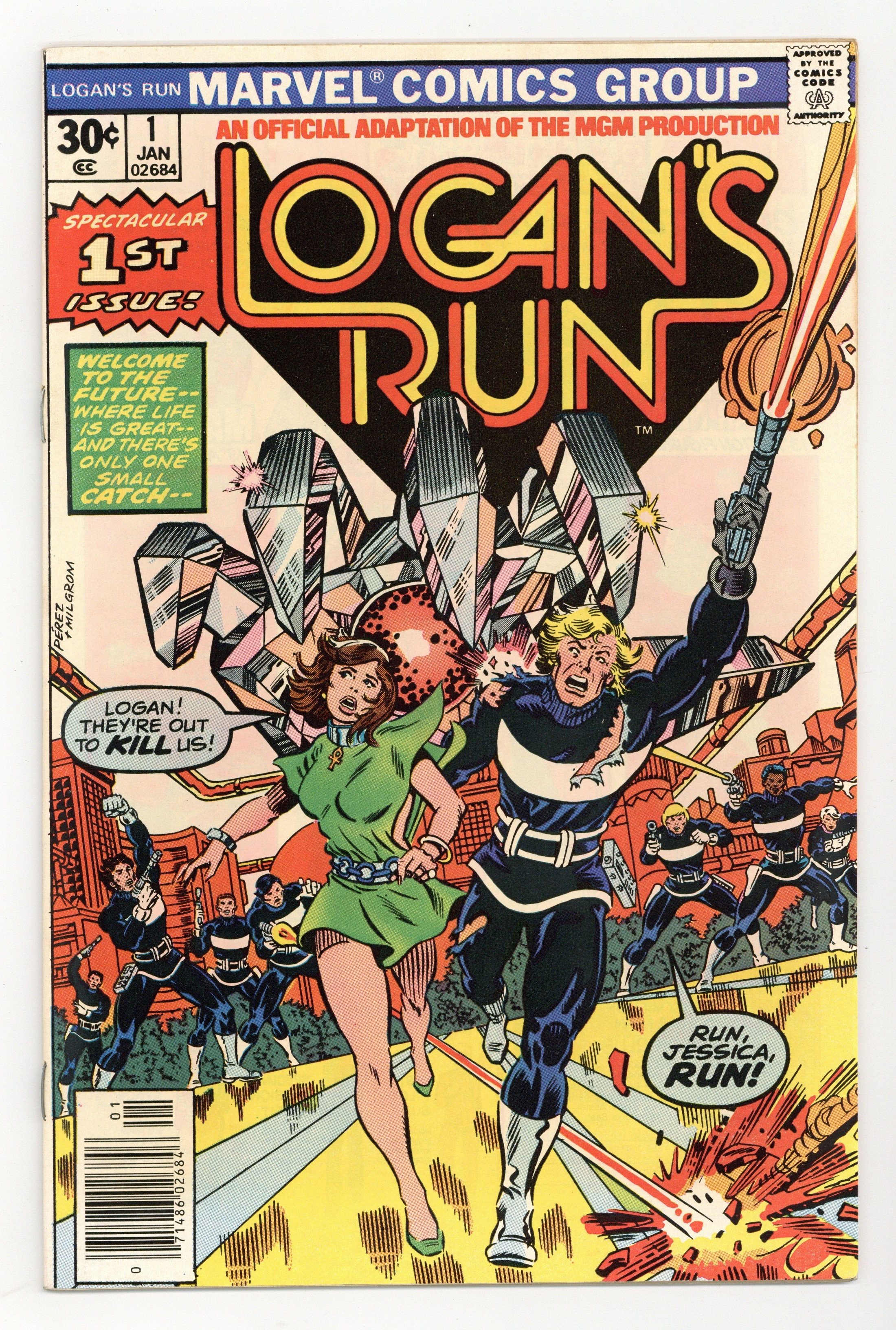 Cover by George Perez and Al Milgrom. "Logan's Run, Part 1". Part 1 of 5. Story by Gerry Conway (from the screenplay by David Zelag Goodman which was based on the novel by George Clayton Johnson and William F. Nolan). Pencils by George Perez. Inks by Klaus Janson. Welcome to the 23rd century, where life is perfect. There's just one catch. At birth everyone is implanted with a life jewel in their palm. When they reach the age of thirty, the jewel informs them they must report for termination. Not everyone accepts this however. Some choose to run. That's where Logan comes in. Logan is a Sandman, charged with terminating those who do not submit willingly. Everything changes when Logan meets Jessica and learns the secret of the Ankh she wears. This leads him to be assigned to find Sanctuary, the destination of all runners. To accomplish this task, he must become a runner himself. 32 pages. Full color. Cover price $0.30.