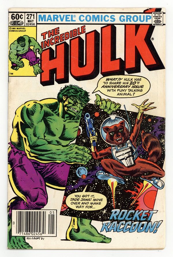 Tags: Marvel Legacy Numbering: Hulk (part 271), Hulk$90.00Newsstand Edition. 2nd appearance of Rocket Raccoon (see Marvel Preview #7 for 1st appearance). Story by Bill Mantlo. Art by Sal Buscema. The Hulk celebrates his 20th Anniversary with one of the most offbeat stories of all. Following the events of last issue, Hulk hurtles through the void only to run into the marvelous Rocket Raccoon and his band of colorful friends. Can the Hulk aid Rocket and his crew against the machiavellian Judson Jakes and his sinister scientist, the tortoise Uncle Pyko? 36 pages. Cover price $0.60.