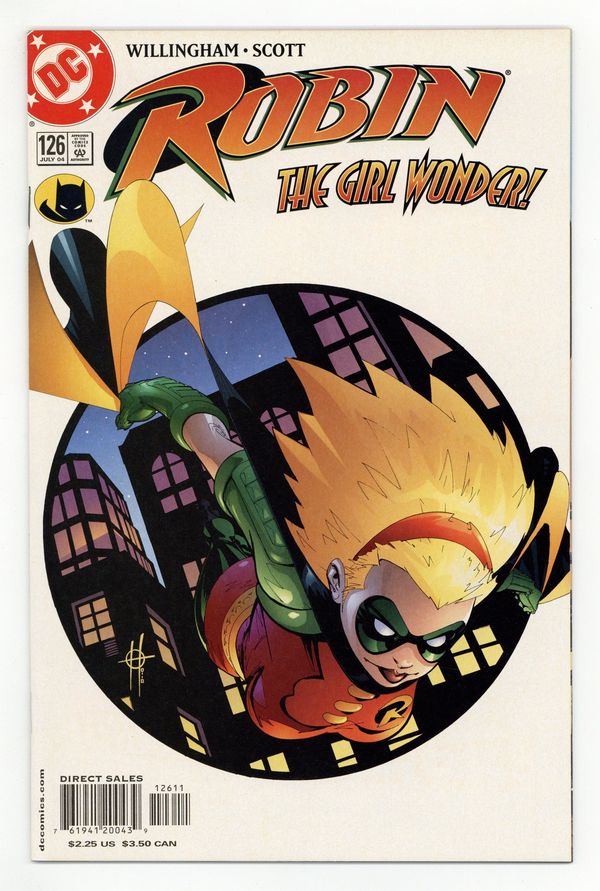 1st Full appearance of Stephanie Brown aka The Spoiler as Robin. Batman guests. Tim Drake has relinquished the cape and mask. Now, Batman must name a successor ? and his new Robin isn't a Boy Wonder at all... The Girl Wonder makes her startling debut in ROBIN #126, written by Bill Willingham (FABLES)! This landmark issue ? a perfect jumping-on point for new readers ? also features the debut of new series artist Damion Scott (BATGIRL)! In the wake of the startling events of ROBIN #125, in which Tim Drake gave up the mantle of Robin, Batman must find a new teen hero to fill the void as his faithful apprentice. But you won't get the full story here. You'll just have to pick up the issue to discover the identity of the first female to take on the role of Robin in official continuity! Batman's choice will have repercussions throughout the DC Universe...and this story gets the ball rolling for much bigger events coming later in 2004. Get in on the ground floor of history in the making with ROBIN #126! ROBIN is an ongoing series edited by Michael Wright. The 32-page issue #126 arrives in comic-book stores May 19 with a cover price of $2.25 U.S. Cover price $2.25.