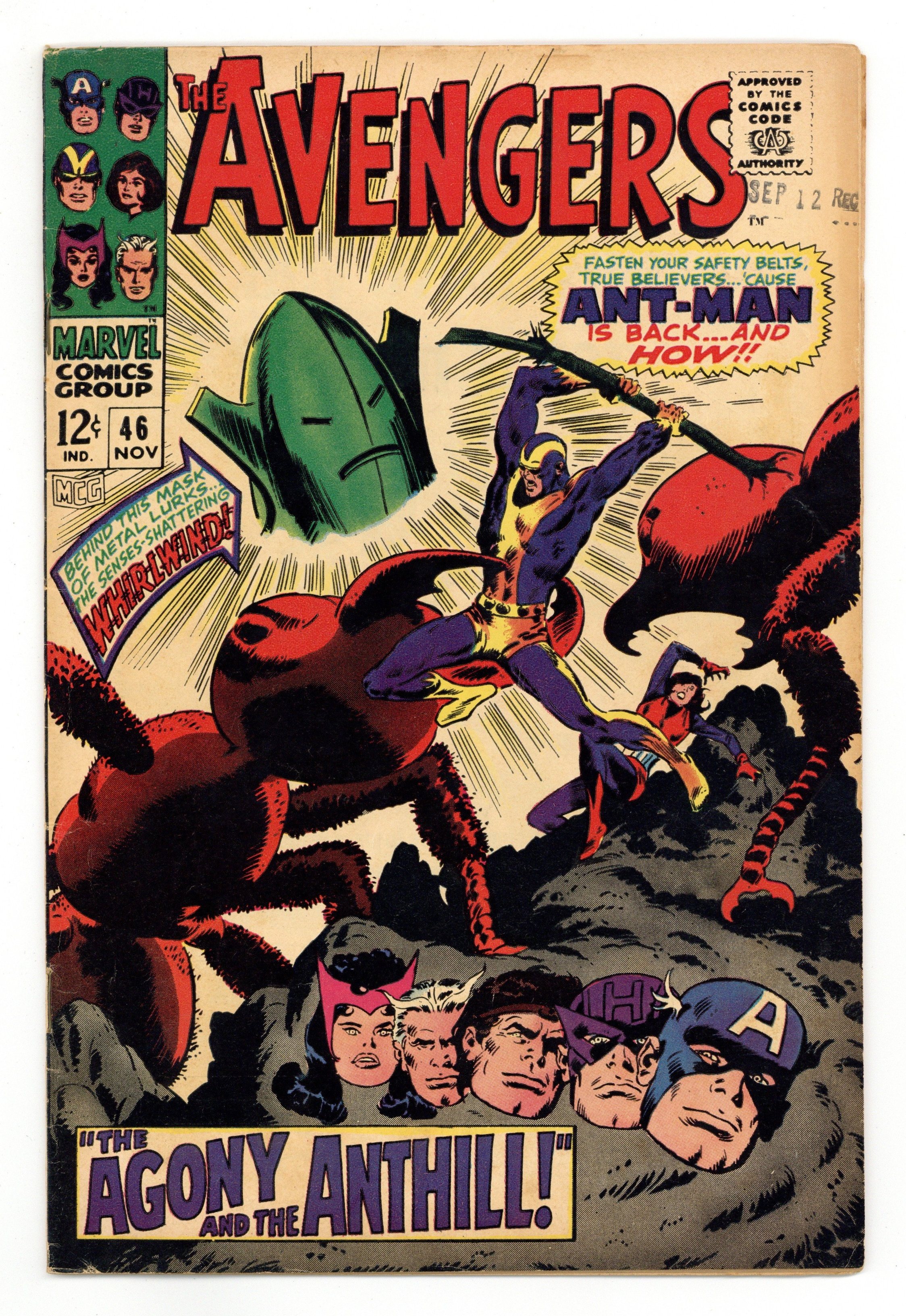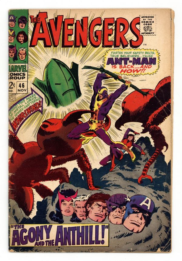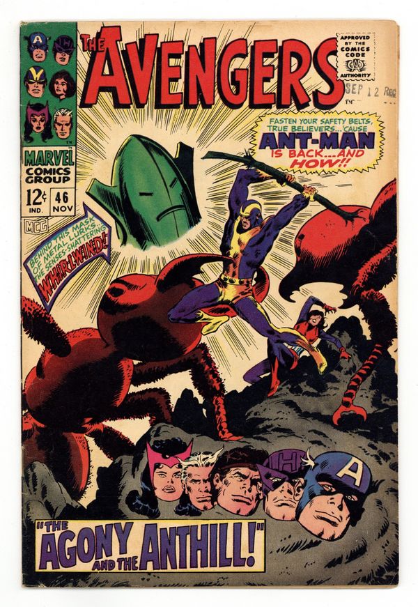 "The Agony and the Anthill!" Script by Roy Thomas. Pencils by John Buscema. Inks by Vince Colletta. Cover by John Buscema. After several busy days, the Avengers briefly convene at their Fifth Avenue mansion before going their separate ways for rest and relaxation. However Hank Pym andJanet van Dyne decide to remain at the mansion to work on a new experiment involving red ants. But the dramatic appearance of the Whirlwind (formerly known as the Human Top) interrupts their work! Goliath and the Wasp havedefeated him in the past. However the Whirlwind scouted Avengers Mansion earlier in the day (as Jan's chauffer) -- and he blasts them with a reducing ray! Then the Whirlwind throws the pair into Hank's ant farm without their cybernetic equipment. So Hank and Jan cannot talk to the ants! And the ants are very hungry! The situation looks grim...and becomes even grimmer when the Whirlwind plants a bomb inside the mansion to kill the remaining avengers. How can Earth's Mightiest Heroes turn their plight around...andavoid reaping the whirlwind? Cameo appearance by the Black Widow. Avengers Lineup: Captain America, Goliath, Hawkeye, Hercules, Quicksilver, Scarlet Witch, and the Wasp. (Note: This story was reprinted in Marvel Triple Action #38.) 36 pages. Cover price $0.12.