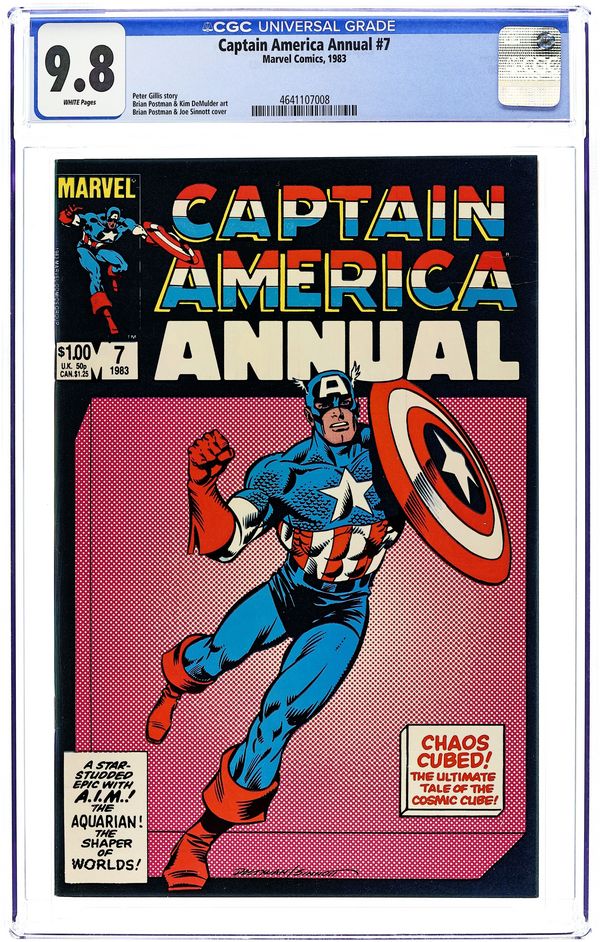 "The Last Enchantment!" Guest-starring the Aquarian. Script by Peter Gillis. Pencils by Brian Postman. Inks by Kim DeMulder. Cover by Brian Postman and Joe Sinnott. The cosmic cube comes back to life in the bowels of Project Pegasus! And anybody and everybody wants a piece of it! Advanced Idea Mechanics, the Shaper of Worlds, the Sentinel of Liberty, and Wundarr the Aquarian rush to upstate New York to grab the cube! But unfortunately A.I.M. is the one that successfully snares the cubic prize! What are the twisted scientists planning to do with the reality altering object? Simply overthrow every government on Earth and create a new world order! However Wundarr and the star-spangled avenger have their own plan to corner the cube! With help from the extra terrestrial shaper, can the Living Legend and the Aquarian take (down) A.I.M.? Updated origin of the cosmic cube. Cameo appearance by the Supreme Intelligence. Flashback cameos by Thanos, Rick Jones, Captain Marvel, Modok, and the Red Skull to recap the history of the cosmic cube. (Notes: The previous saga involving Project Pegasus, the cosmic cube, and Wundarr took place in Marvel Two-in-One 53 thru 58. The Shaper of Worlds appears next in Fantastic Four 319. This issue includes full-page ads for both the Hawkeye Limited Series (1984) and the upcoming Deathlok story in the Captain America title.) 52 pgs., $1.00 Cover price $1.00.
