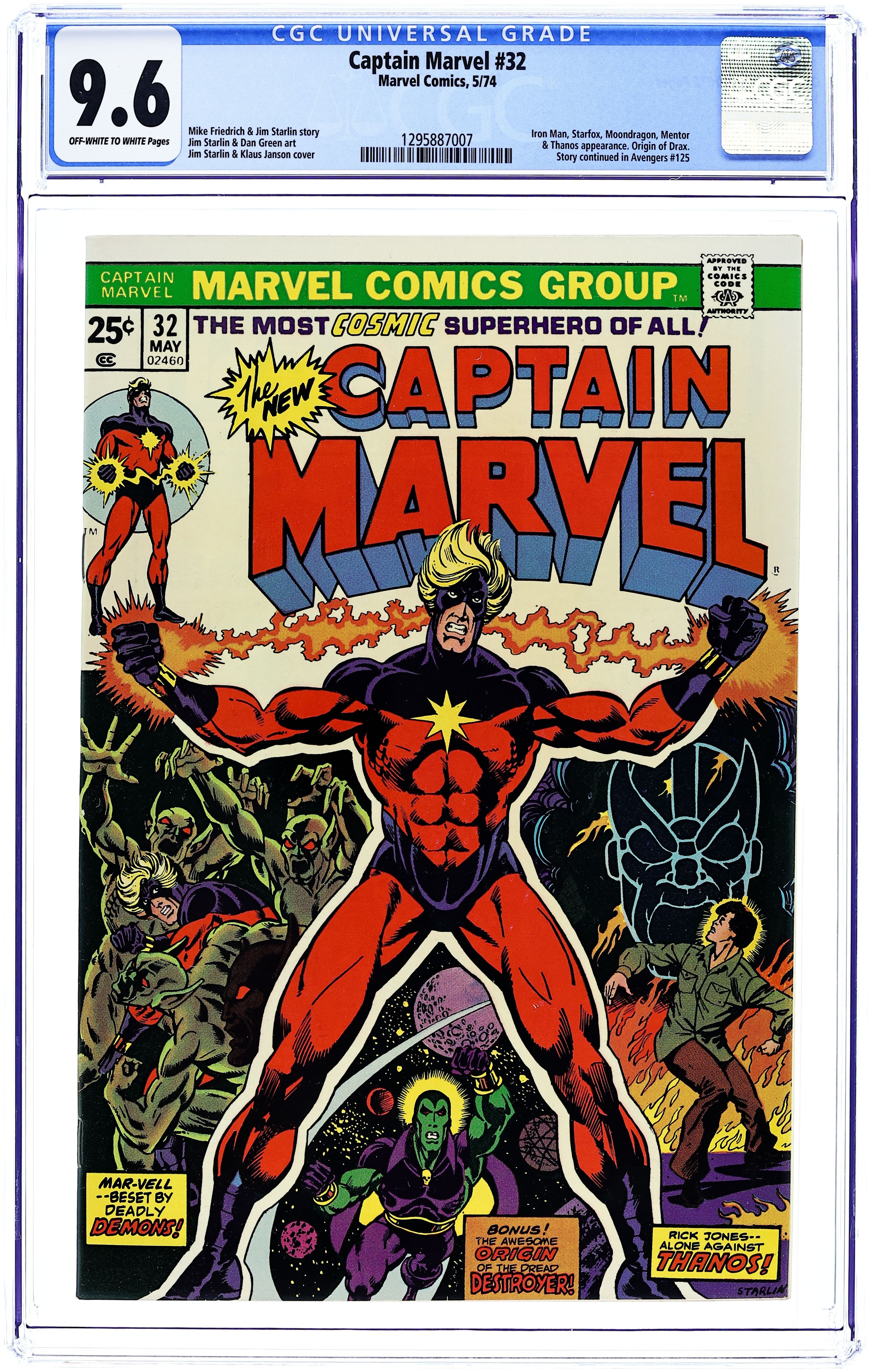 "Thanos the Insane God!" Guest-starring Iron Man. Origin of Drax the Destroyer. Script by Jim Starlin and Mike Friedrich (writing assist). Pencils by Jim Starlin. Inks by Dan Green. Cover by Jim Starlin and Klaus Janson. Incredibly the powerful Thanos has ascended to godhood! But the awesome battle rages on! While Captain Marvel and Iron Man fight Thanos' minions on Titan, the enraged Drax the Destroyer attacks Thanos in outer space! Thanos the man was already difficult to beat. What chance is there against Thanos the god? Meanwhile, the mad Titan's alien armada zooms towards Earth! But the Mighty Avengers are ready and waiting for their close encounter with Thanos' kind! Story continues in Avengers 125. Cameo appearances by the Avengers, Death, ISAAC, Lou-Ann Savannah, Rick Jones, Mentor, Moondragon, and Eros. First 25¢ issue. (Notes: The letters page includes a half-page map of Titan. The letters page also contains Marvel Value Stamp series A #19 Hogun, Balder, and Fandral.) 32 pages Cover price $0.25.