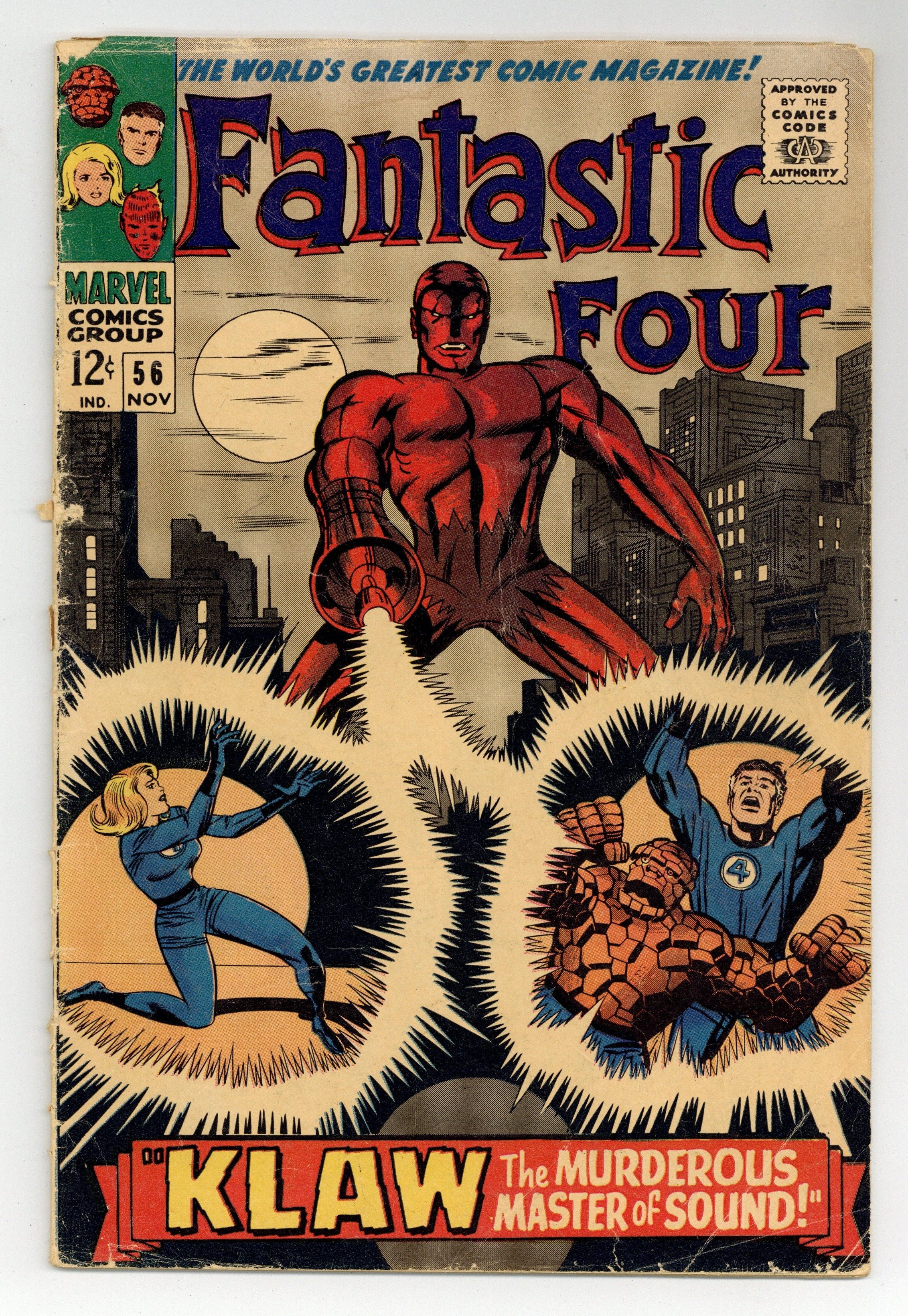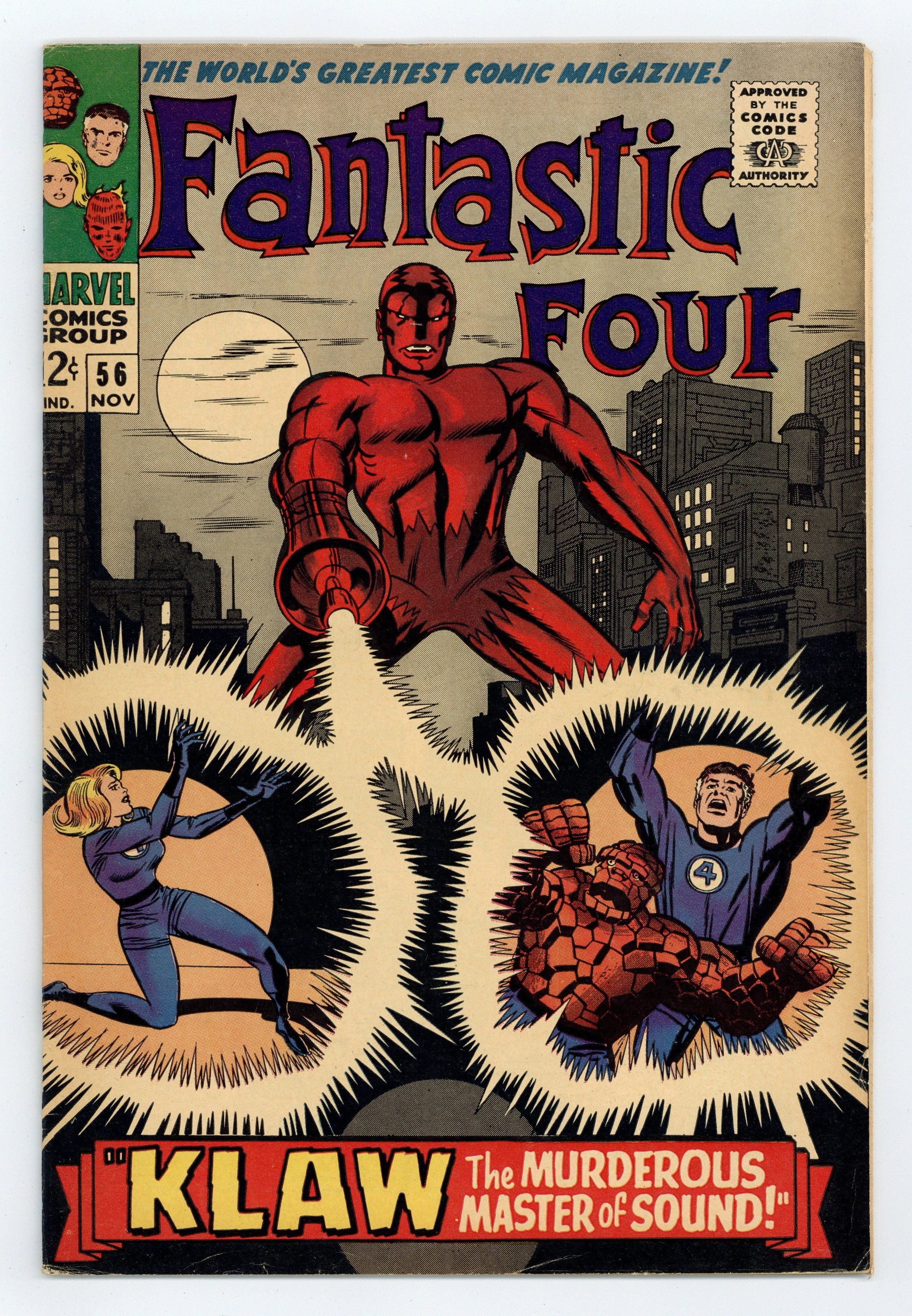 Cover pencils by Jack Kirby, inks by Joe Sinnott. Klaw The Murderous Master of Sound!, script by Stan Lee, pencils by Jack Kirby, inks by Joe Sinnott; Klaw attacks the Baxter Building. The Silver Surfer, the Inhumans, Doctor Doom, and the Black Panther all have brief appearances. 36 pgs. $0.12. Cover price $0.12.