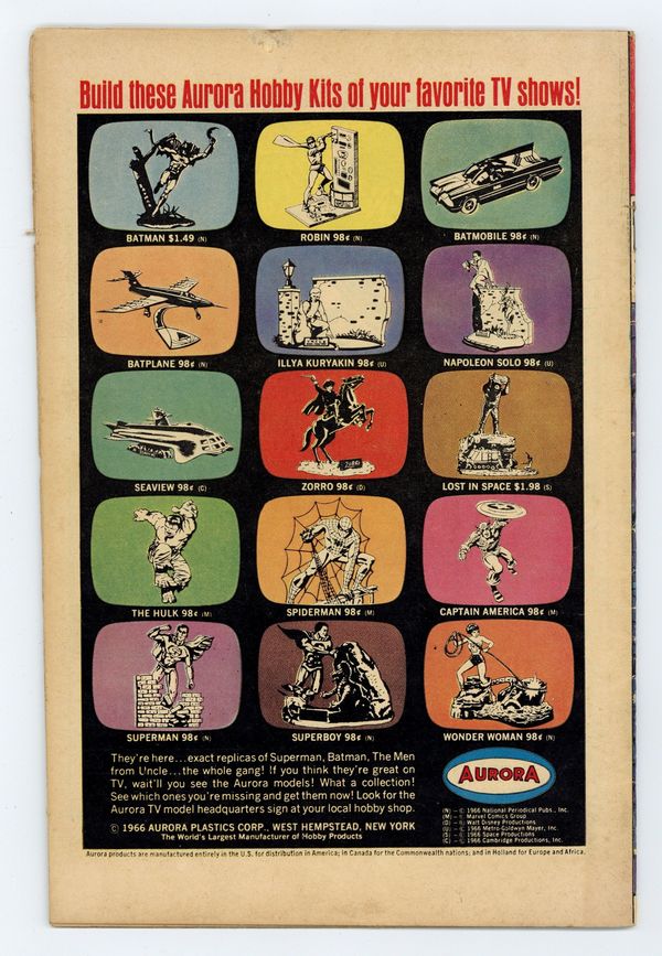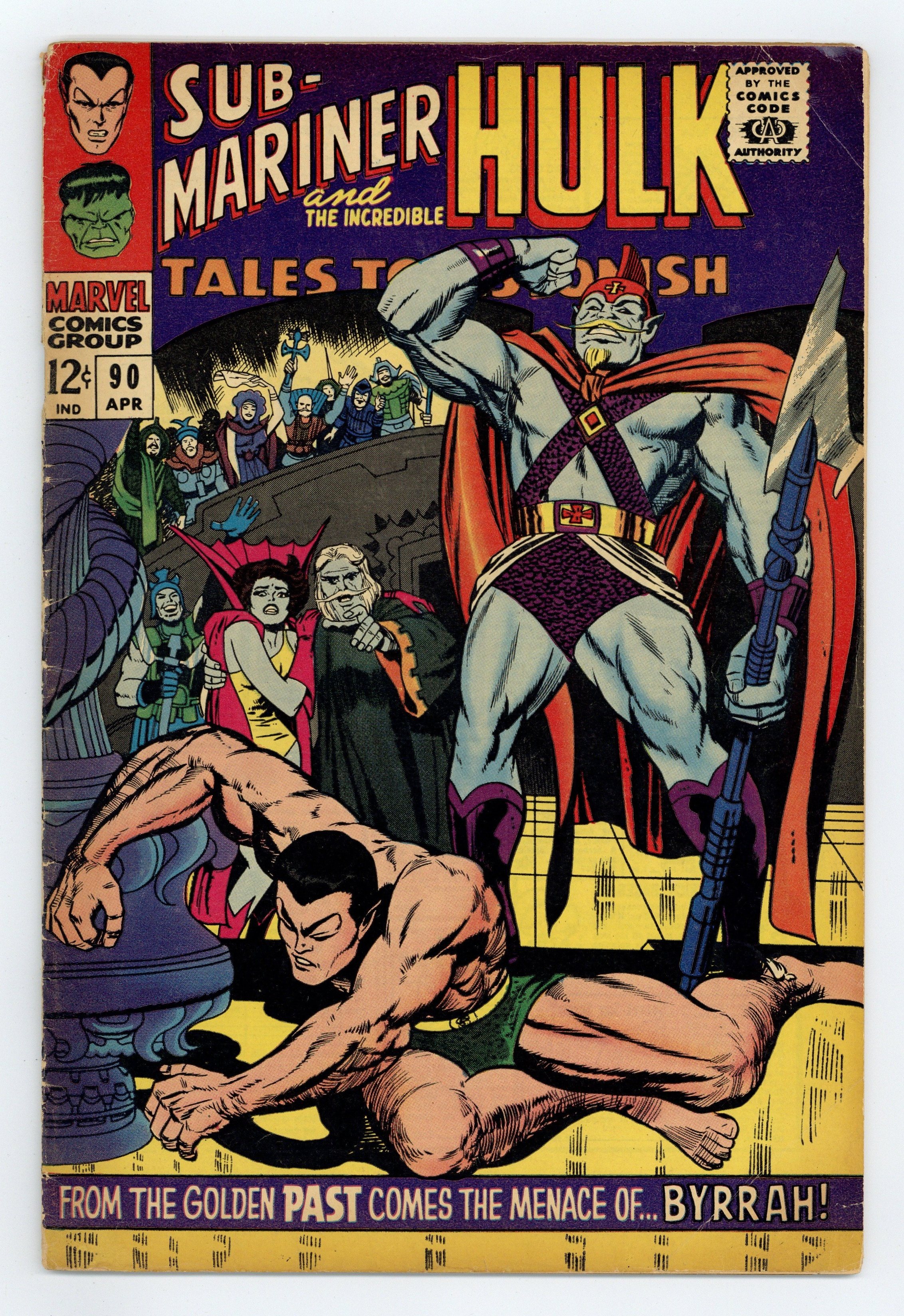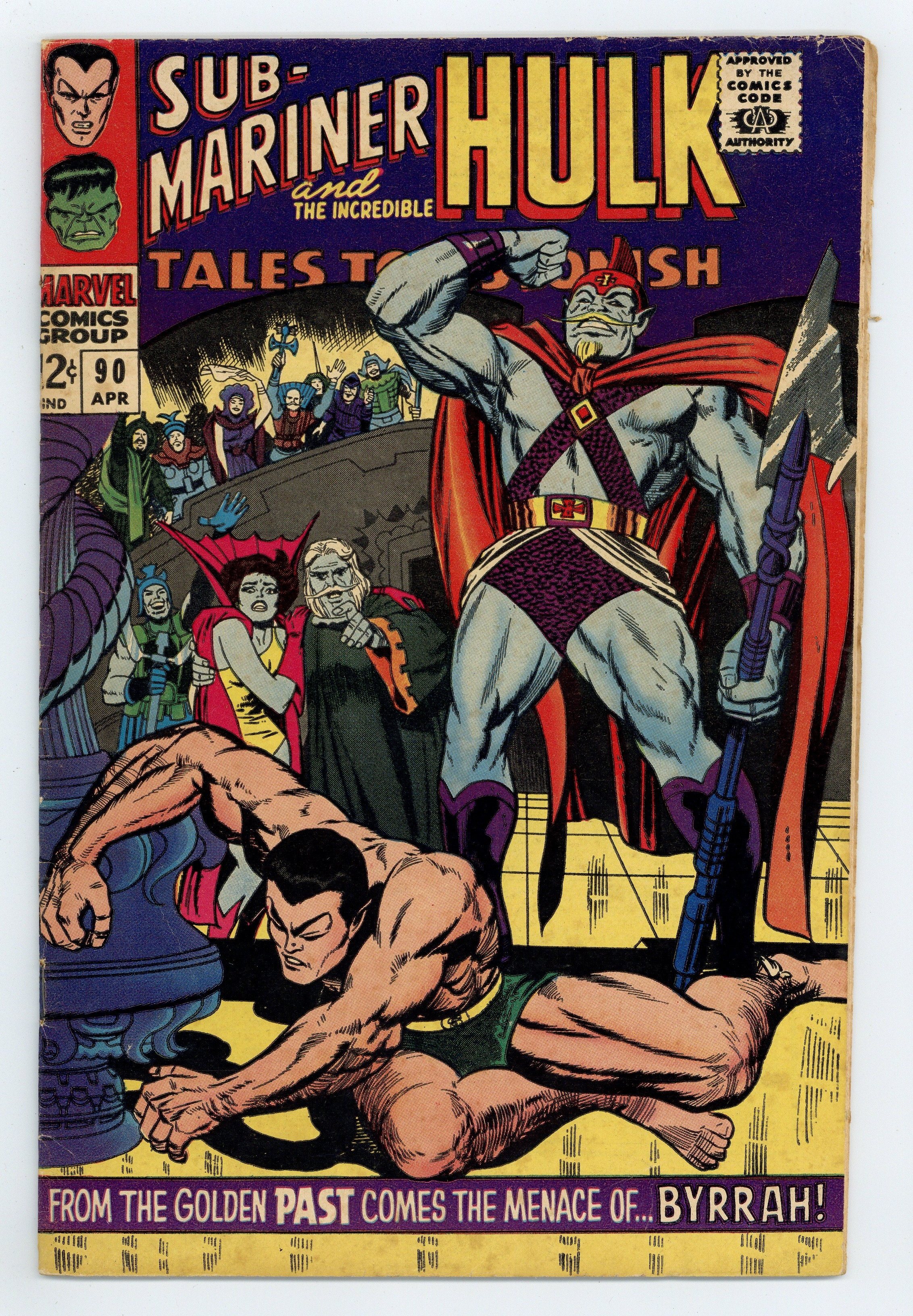 Cover by Jack Kirby and Vince Colletta. To Be Beaten by Byrrah!, script by Stan Lee, art by Bill Everett and Marie Severin; Namor's cousin wins the favor of the populace of Atlantis as well as the Atlantean council by belittling the regime of the Sub-Mariner as violent and unstable; He challenges Namor to single combat for the right to rule and no one is more surprised than the avenging son when his powers desert him during the fight and Byrrah handily wins. The Abomination!, script by Stan Lee, art by Gil Kane; The Stranger leaves earth with the rampaging Hulk left behind to wreak destruction on his behalf; Turning back into his alter ego, Banner surrenders himself to Gamma base and tries to kill himself with radiation to stop the Hulk's destruction; Stopped before he can use his gamma machine, the machine is instead used by a foreign spy who is transformed into the Abomination; More powerful than even the Hulk, Abomination beats the jade giant down and kidnaps Betty as he escapes from the base. Letter from Bill Mantlo. 36 pgs., full color. $0.12. Cover price $0.12.