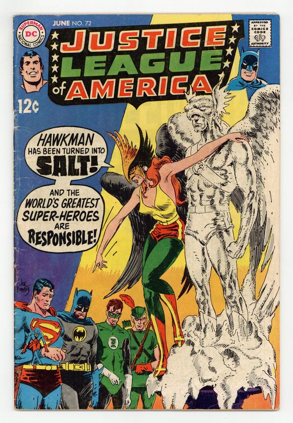 Last 12c cover-priced issue. Cover art by Joe Kubert. 13 Days to Doom!, script by Denny O'Neil, pencils by Dick Dillin, inks by Sid Greene; Red Tornado comes to Earth-1 to warn the League of impending trouble; Hawkman is turned into a salt statue; amateur sorcerer Marmaduke Mantick accidentally conjures up demons with the philosopher's stone. Last 12c cover-priced issue. 36 pgs. $0.12. Cover price $0.12.