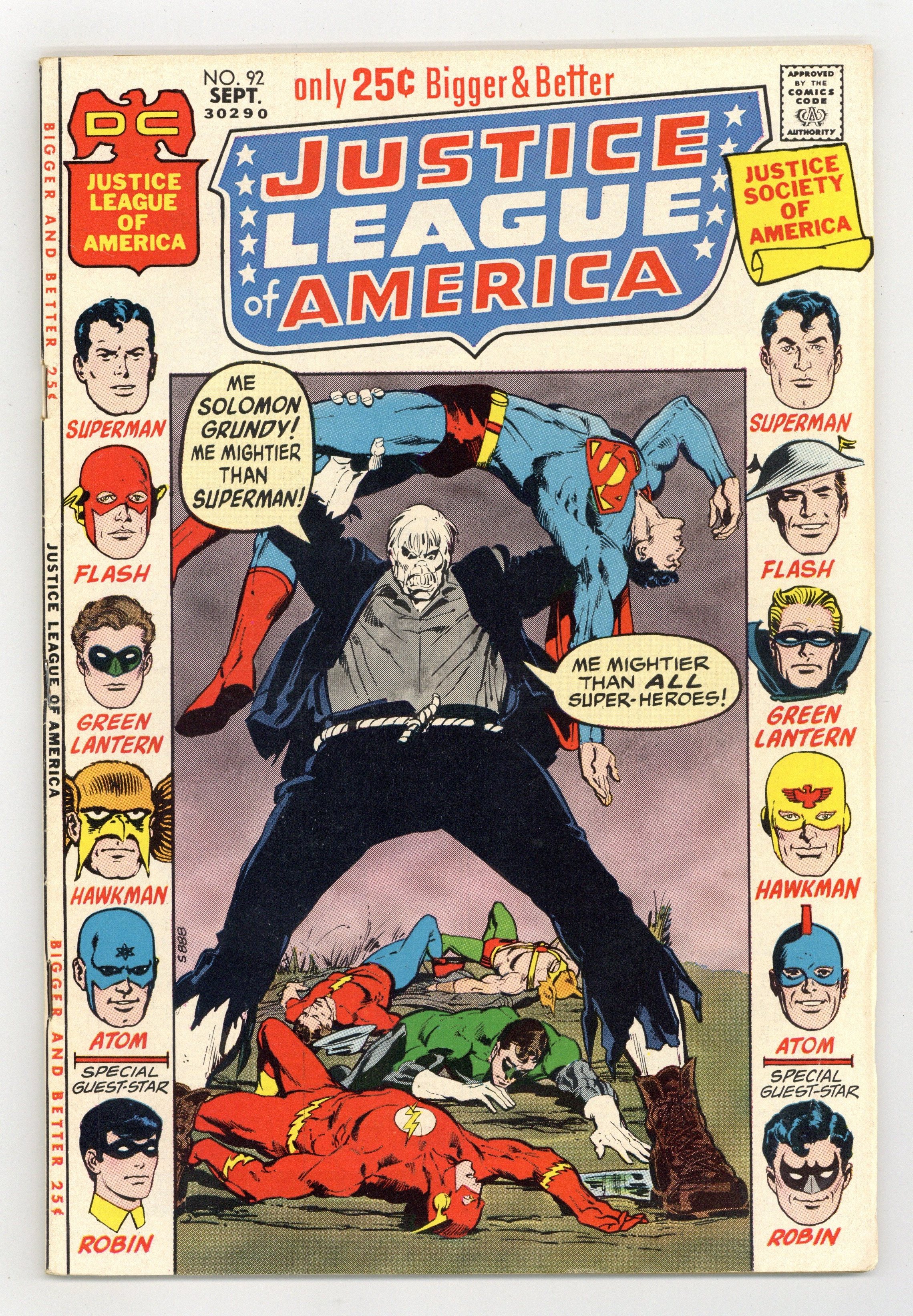 Cover pencils by Neal Adams, inks by Dick Giordano. Solomon Grundy.. The One and Only, script by Mike Friedrich, pencils by Dick Dillin, inks by Joe Giella; As A-Rym meets up with Solomon Grundy on Earth-2, the JLA meets up with the JSA to try and stop A-Rym's rampage; The Earth-2 Hawkman sends both Robins to the batcave to stay out of the way; While there, the Earth-2 Robin gives his Earth-1 doppelganger a new costume to replace his damaged one; Both teams learn that if A-Rym and Teppy aren't reunited soon, they'll both die, and both teams scramble to reunite them, which succeeds. As A-Rym and Teppy return to the other 2 aliens, the aliens' parents scold them for joyriding; Both teams then leave on their separate ways, as Batman awaits for the League to return to aid him on his case as the Earth-1 Robin wonders if he should continue to wear his new costume; Annual JLA-JSA team-up conclusion; story dedicated to Jerry Bails and Roy Thomas. The One-Man Justice League! starring the Flash, script by Gardner Fox, pencils by Carmine Infantino, inks by Joe Giella. Space-Enemy Number One!, script by John Broome, art by Carmine Infantino. 52 pgs. $0.25. Cover price $0.25.
