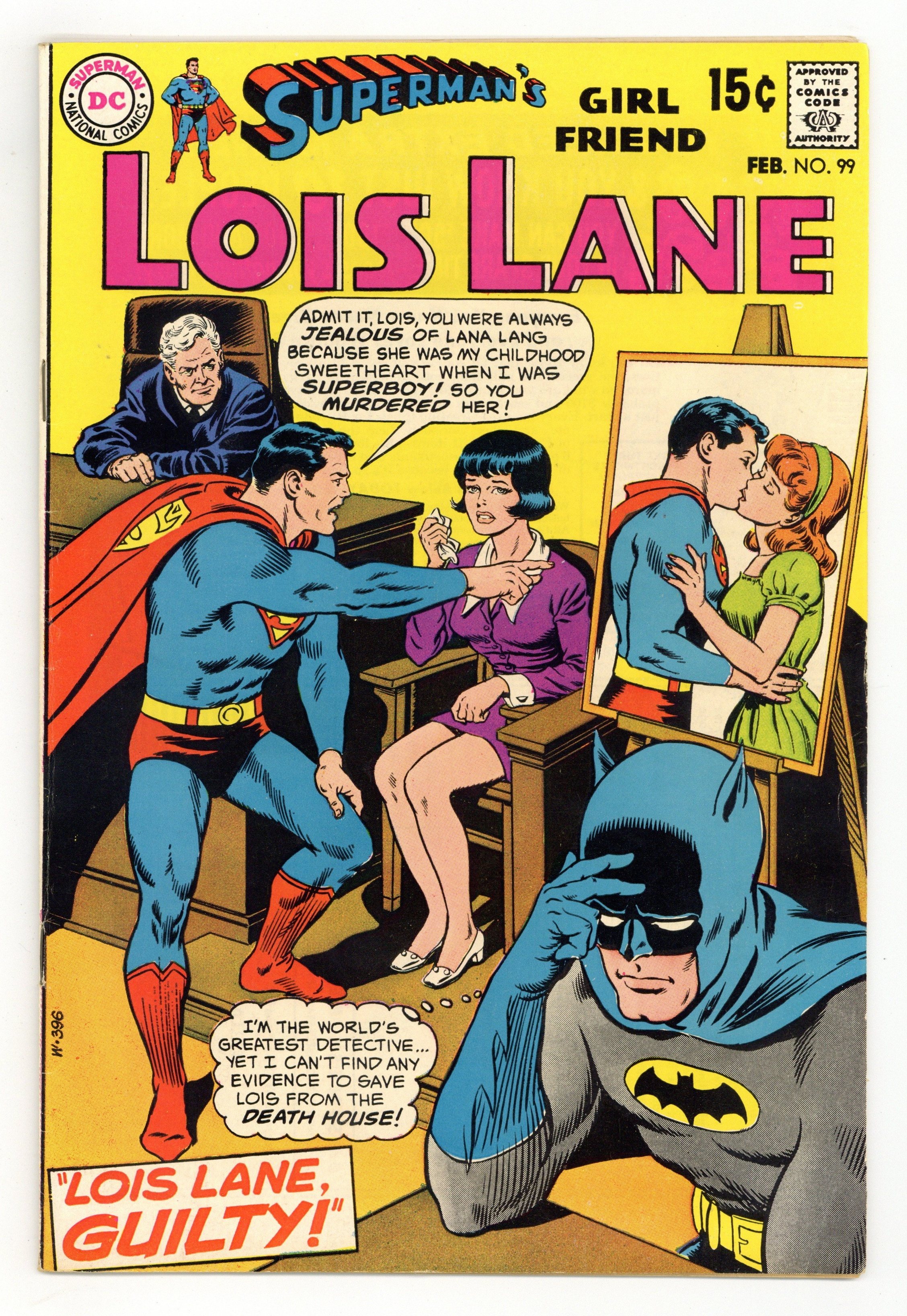 $15.75Cover pencils by Curt Swan, inks by Murphy Anderson. Is Lois Lane Guilty?, script by Robert Kanigher, pencils by Irv Novick, inks by Mike Esposito; Following an argument seen by millions on television, Lois and Lana are in a car accident and Lana is apparently drowned; story continued in the following issue. The Man Who Was Clark Kent's Double, script by Jerry Coleman, art by Kurt Schaffenberger; Lois is on the trail of a modern-day Robin Hood when she meets Mark Benton, who is a double for Clark Kent. House ad for Our Army at War #216, art by Joe Kubert. 36 Pages, Full Color. Cover price $0.15.