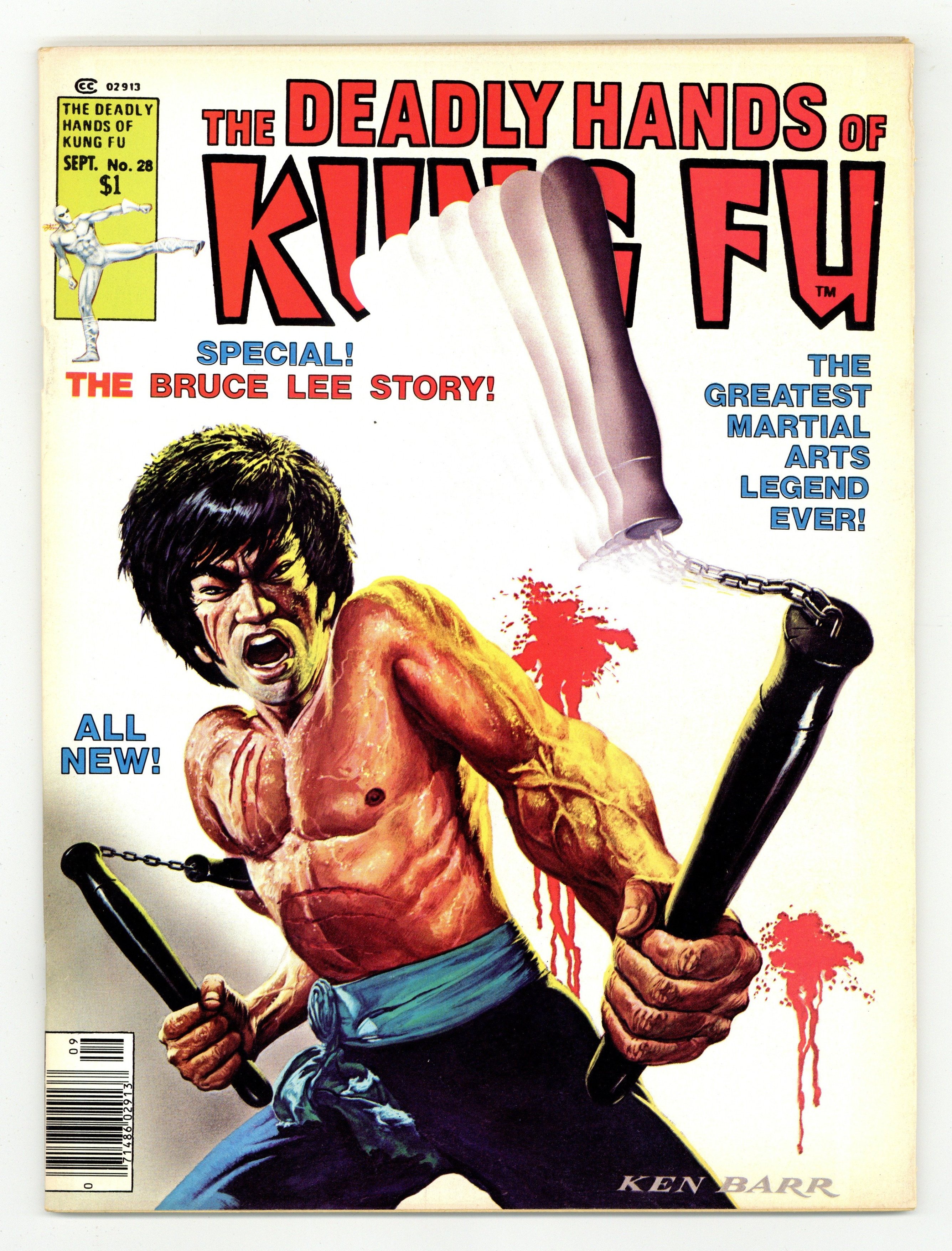 Stan Lee Presents: The Deadly Hands of Kung Fu. Special Bruce Lee issue. Cover by Ken Barr. Includes: "Enter the Letters!" A letters page with readers' thoughts on previous issues. An editorial by John Warner. Bruce Lee: Part 1. "Legend of the Dragon!" Story by Martin Sands. Art by Joe Staton, Tony DeZuniga, and the Tribe. "The Tao of Many Ways!" Jim Whitmore takes a look at the fighting philosophies of Bruce Lee and Shinmen Musashi. Fighting Arts Review!" A column by David Kraft. "The Tao of Stunt Work!" An interview with Pat Johnson, the stunt coordinator on the film Bruce Lee: Life and Legend, by Jim Whitmore. Bruce Lee: Part 2. "The Hong Kong Connection!" Story by Martin Sands. Art by Joe Staton, Tony DeZuniga, and the Tribe. Includes a B&W poster by Mike Nasser featuring Bruce Lee. Black and white. Cover price $1.00.