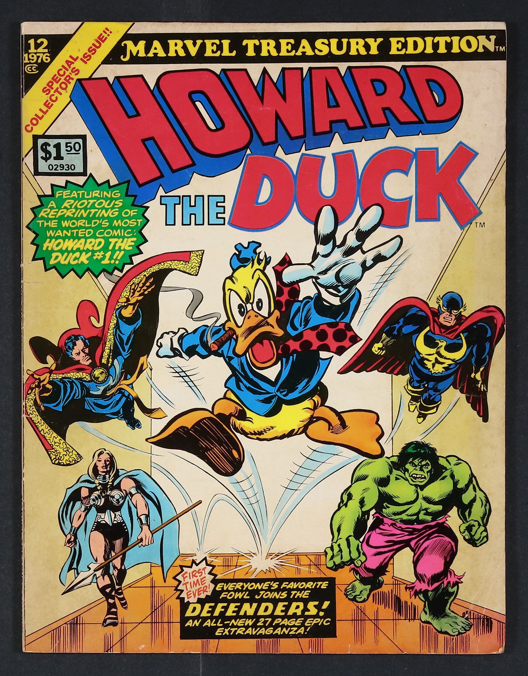 Tags: Treasury Sized Editions, Hulk$10.50Marvel Treasury Edition (1974) #12 features Howard the Duck. Includes the all-new adventure "The Duck and the Defenders" by Steve Gerber, Sal Buscema, and Klaus Janson. Also, reprints Fear #19 and Giant-Size Man-Thing #4-5 featuring "The Way it All Began" by Steve Gerber, Val Mayerik, and Sal Trapani, "Frog Death" by Steve Gerber and Frank Brunner, and "Hellcow" by Steve Gereber, Frank Brunner, and Tom Palmer. Guest-starring the Defenders (Valkyrie, Nighthawk, Dr. Strange, and the Hulk) and the Man-Thing. Plus, a special reprinting of Howard the Duck #1 by Steve Gerber, Frank Brunner, and Steve Leialoha. 82 pages. Cover price $1.50.
