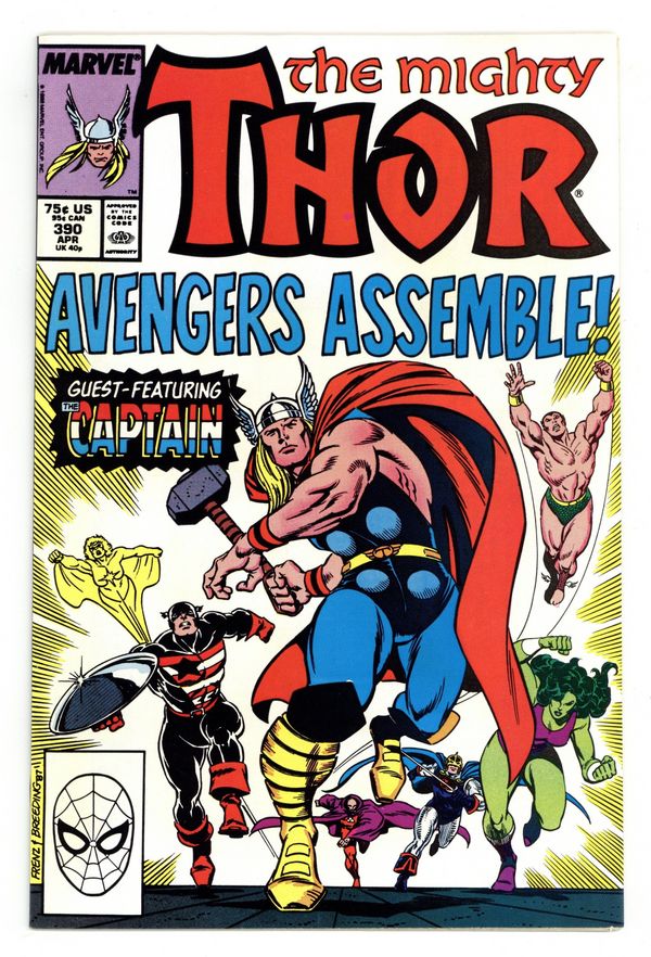 War of Gods: Prelude - The Avengers guest star in "The Hero and the Hammer!", script by Tom DeFalco, pencils by Ron Frenz, inks by Brett Breeding; Thor arrives on Hydrobase, and learns of the many changes to the Avengers; Asgard is once again attacked by Seths legions, while Grog and more Demons of Death attack Thor and the Captain; During the battle, the Captain lifts Mjolnir and sends it back to Thors grasp; Thor then easily defeats Grog and the soldiers, sending them back through the gate. Brief appearances by Hogun, Fandrall, Volstagg, and Balder. The letters page contains a statement of ownership: average print run 314,440; average paid circulation 190,600. 36 pgs., full color.