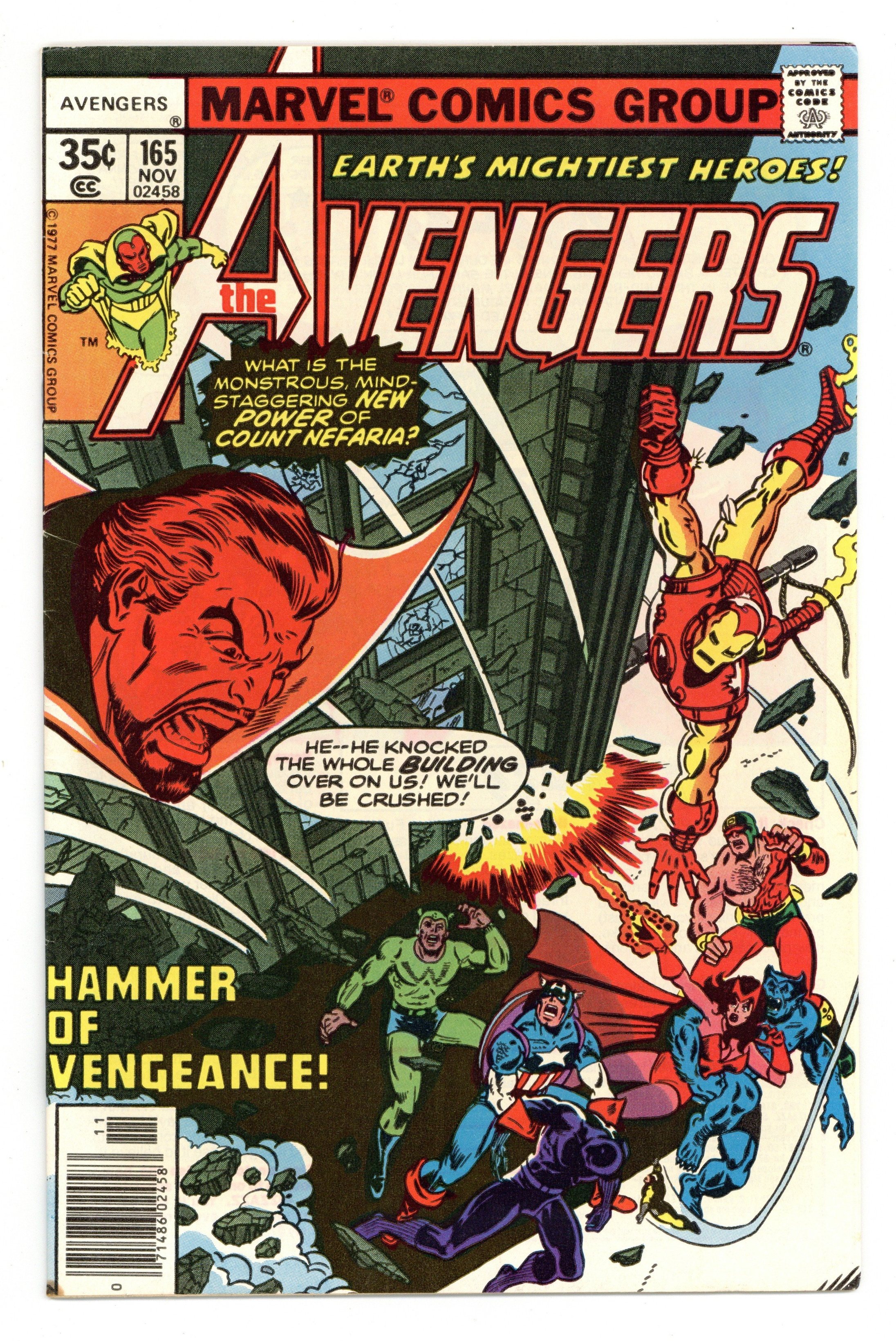 "Hammer of Vengeance!" Part 2 of 3. Script by Jim Shooter. Pencils by John Byrne. Inks by Pablo Marcos. Cover by George Perez and Mike Esposito. Earth's Mightiest Heroes are in dire straits after the super-charged Count Nefaria dumps a 40-story building on top of them! And now the count is free to wreak havoc in the city as the Beast, Black Panther, Captain America, Scarlet Witch, Yellowjacket, and Wonder Man lie buried under tons of rubble! Fortunately though, the golden avenger arrives on the scene and digs out his teammates! But that only sets the stage for round two against the all-powerful Count Nefaria! The Avengers need help desperately! Is anyone else available? First appearance of Peter Gyrich. Cameo appearances by the Vision, Whizzer, and Thor. First 35¢ issue. (Note: This issue includes a full-page ad for Hostess Cupcakes featuring Spider-Man and Mary Jane Watson vs. the Legal Eagle.) 36 pgs. Cover price $0.35.
