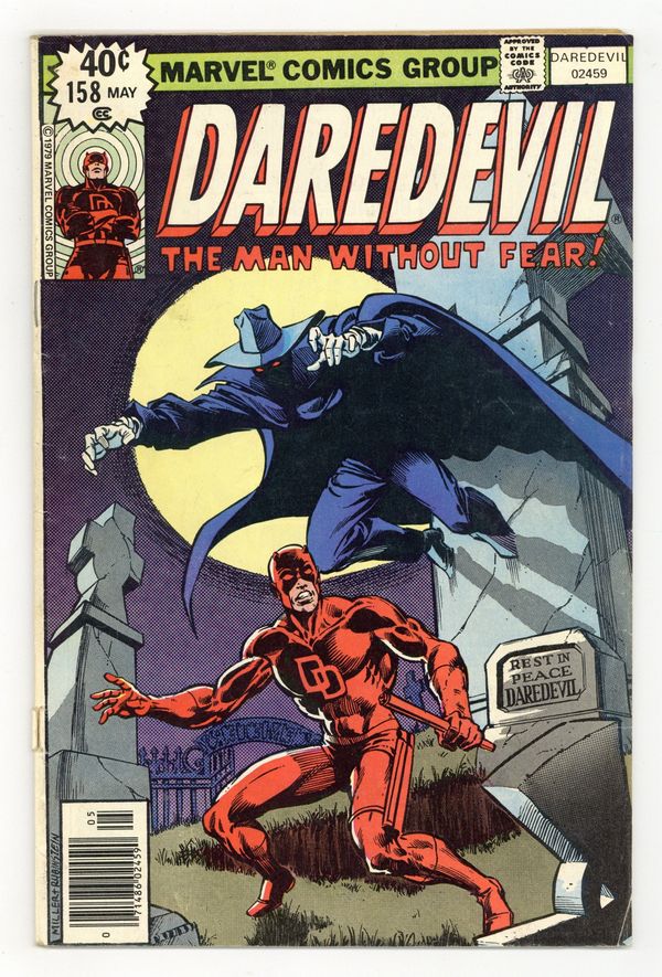 First Frank Miller Daredevil. First 40-cent cover price. Cover pencils by Frank Miller, inks by Joe Rubinstein. A Grave Mistake!, script by Roger McKenzie (Death-Stalker origin on page 7 plotted by Marv Wolfman), pencils by Frank Miller , inks by Klaus Janson.; Matt is captured by the Ani-Men and has a final showdown with Death-Stalker in a graveyard; the Unholy Three (Ape Man, Bird Man, Cat Man) appear. This issue contains a statement of ownership--average print run 393,978; average paid circulation 111.559. Miller/Joe Rubinstein cover. 36 pgs. Cover price $0.40. Cover price $0.40.