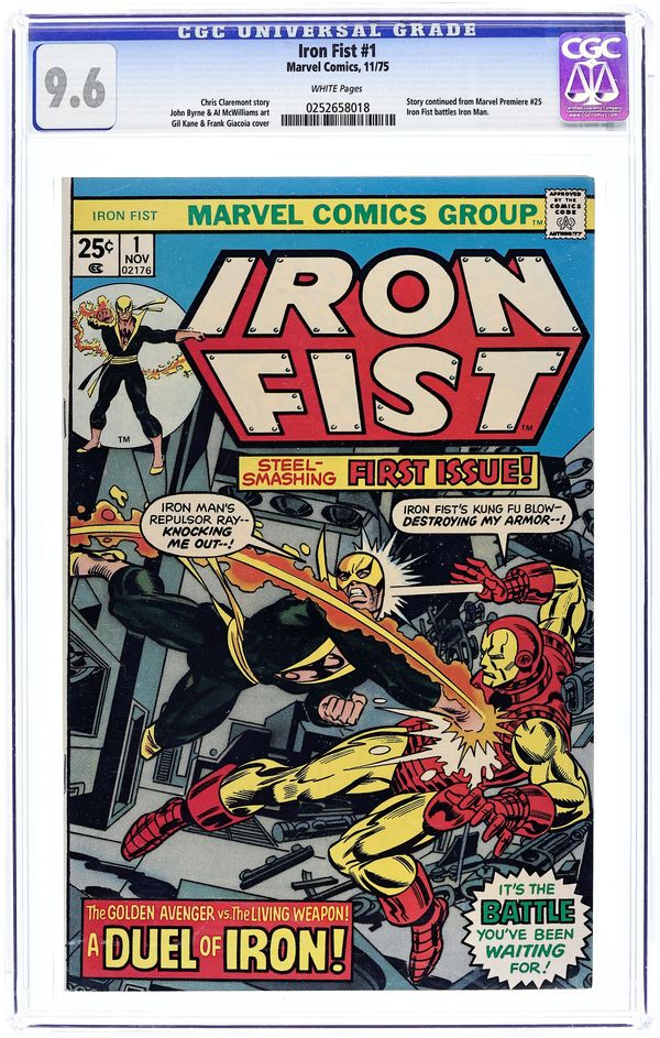 "A Duel of Iron!" Guest-starring Iron Man and Misty Knight. Story by Chris Claremont. Art by John Byrne and Al Williams. Story continued from Marvel Premiere #25. Daniel Rand was reborn in the fires of a dragon's heart in the mystical land of K'un Lun. Now, he is the living weapon known as Iron Fist, finally in his own series. Hot on the trail of Colleen Wing's kidnappers, Iron Fist has come to Stark International seeking answers. Wanted by the police for a murder he did not commit, Danny comes face-to-face with the Invincible Iron Man, and Shell Head is in no mood to give a wanted man the benefit of the doubt. It's the Golden Avenger vs. the Living Weapon. Marvel Value Stamp. Cover price $0.25.