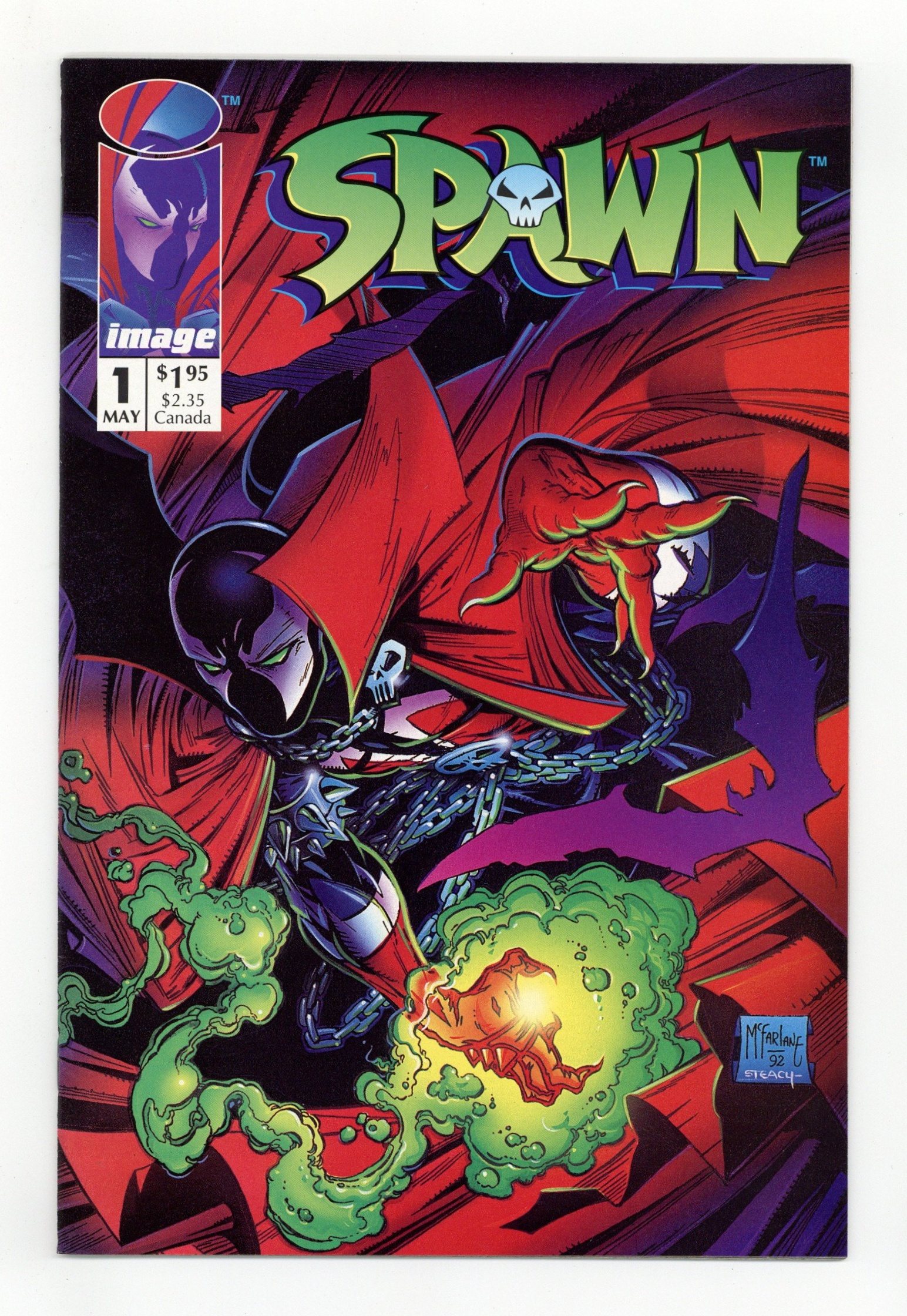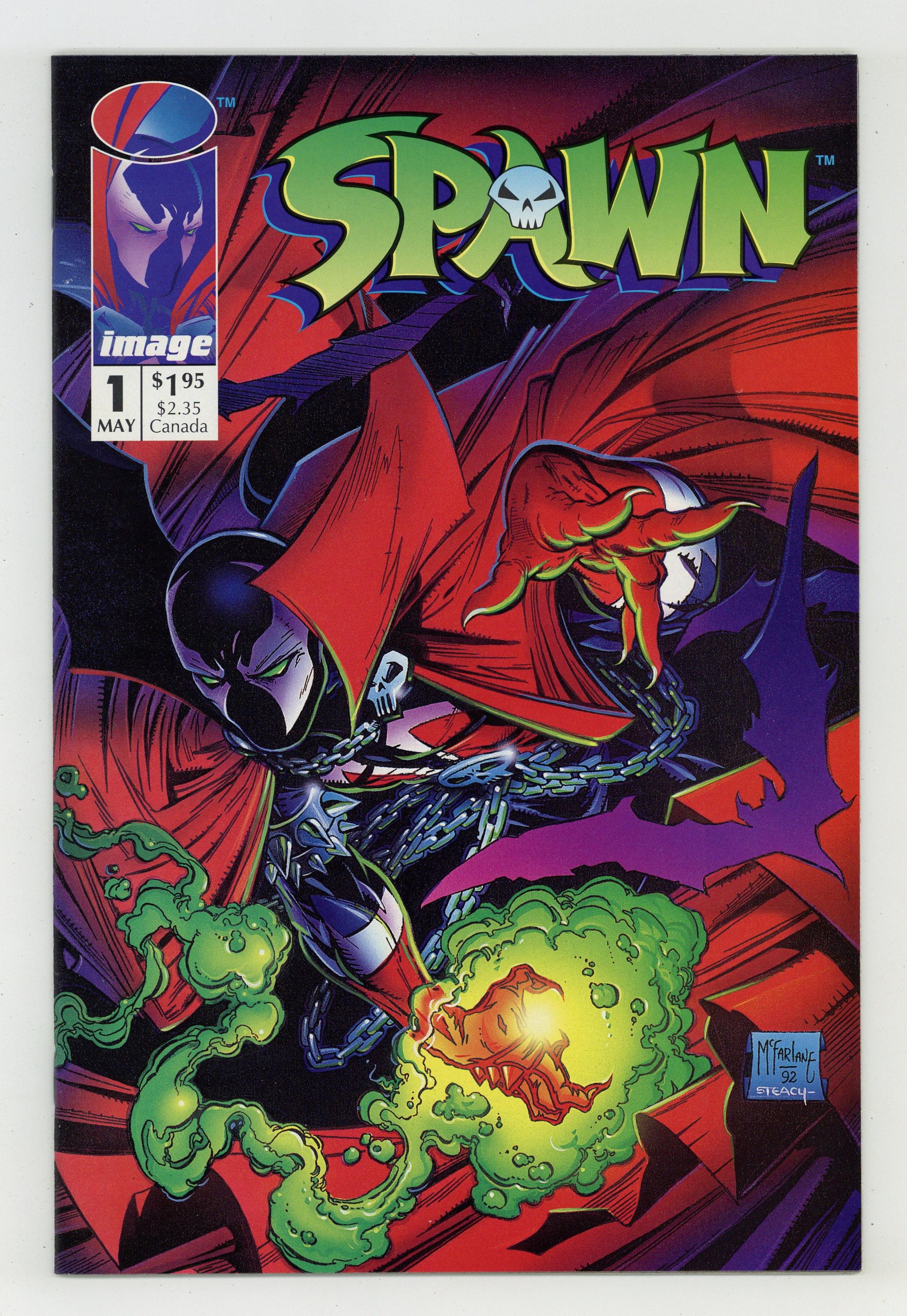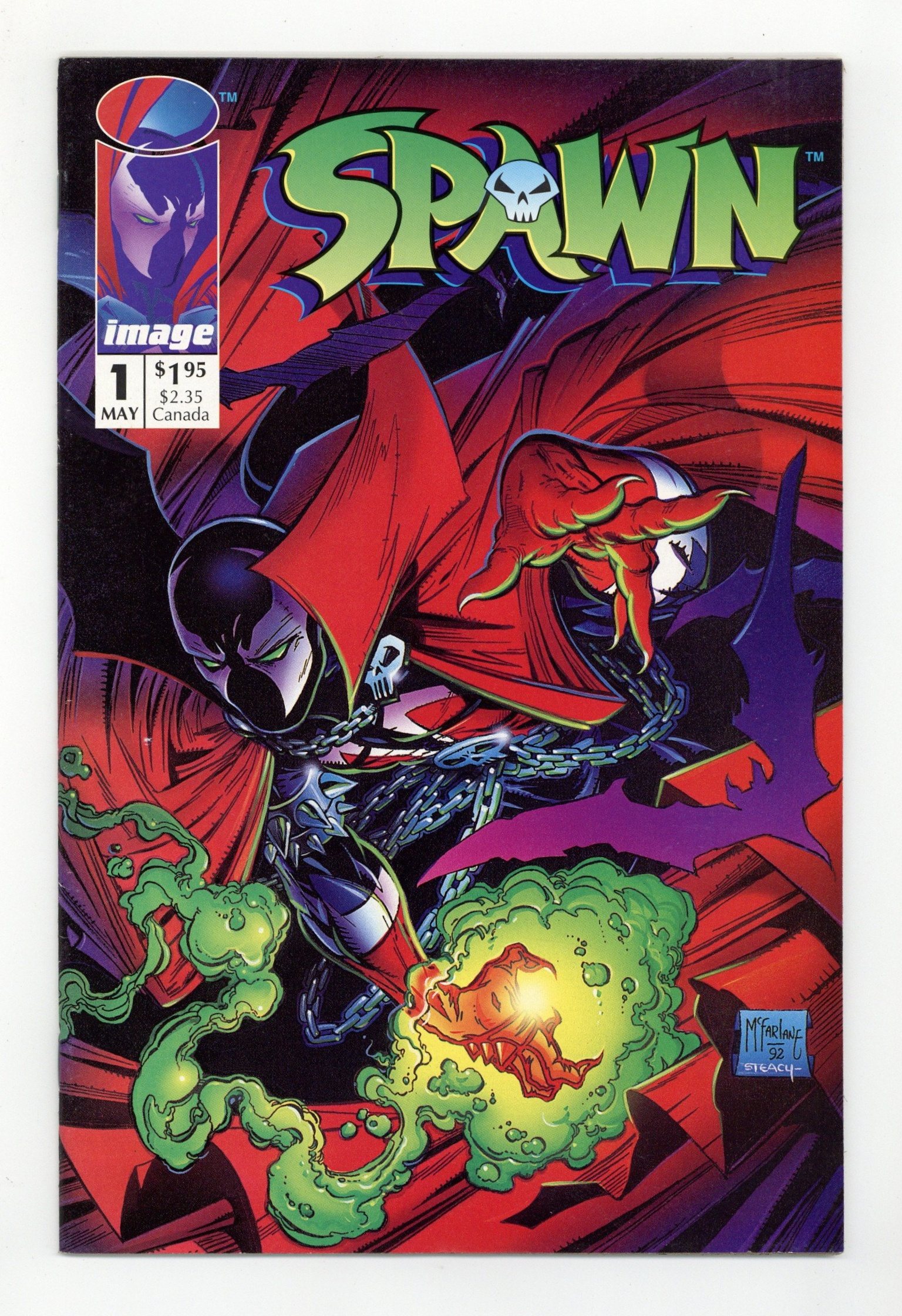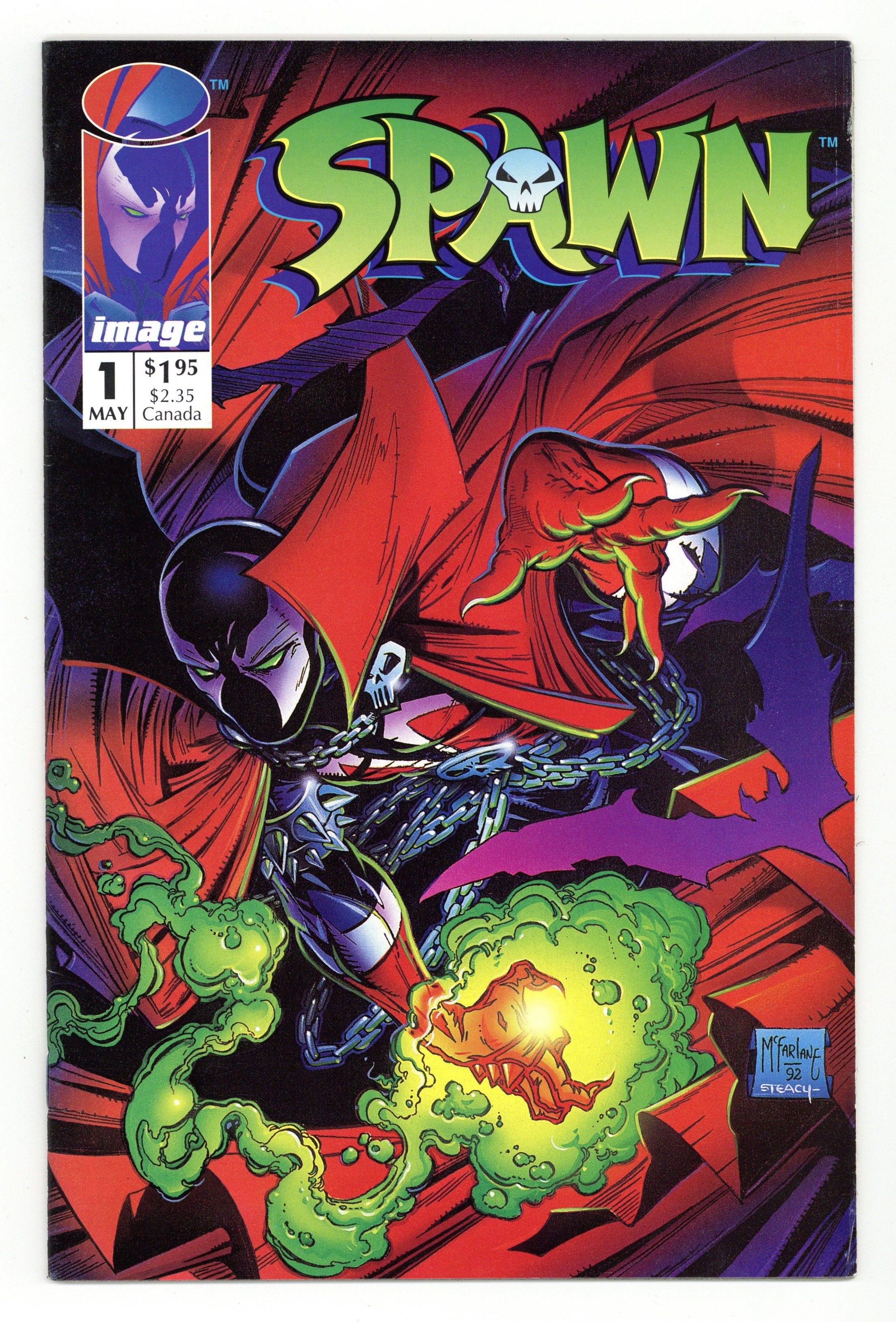 Direct edition. "Questions!" Part 1 of 4. Created, story, and art by Todd McFarlane. When government assassin Al Simmons is murdered, a deal with the devil brings him back to the realm of the living. But now he walks the shadows as the disfigured soldier of hell known as Spawn. Armed with unimaginable, but finite, magical abilities, Spawn is destined to play an important role in the upcoming Armageddon. But, what happens when this rebellious anti-hero decides he won't fight for either side? Superstar artist and Image co-founder, Todd McFarlane, creates a character who has gone on to inspire a major motion picture, an HBO animated series, numerous spin-off comic series, and one of the most successful toylines of all time. Spawn centerfold by Todd McFarlane & Ken Steacy. Pin-up of Spawn by George Perez. Pin-up of PITT by Dale Keown. Cover by McFarlane & Steacy. 1st app of Sam and Twitch Cover price $1.95.