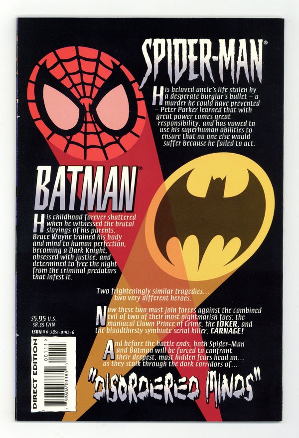 Direct Edition. "Disordered Minds!" Story by J.M. DeMatteis. Art by Mark Bagley, Scott Hanna, and Mark Farmer. Two of comic's biggest icons must team-up to take down two of their craziest villains. Can Batman, the Dark Knight Detective, and the Amazing Spider-Man set aside their differences long enough to stop the maniacal machinations of the psychotic Carnage and the Joker, Clown Prince of Crime? Squarebound edition with embossed cover. Cover price $5.95.