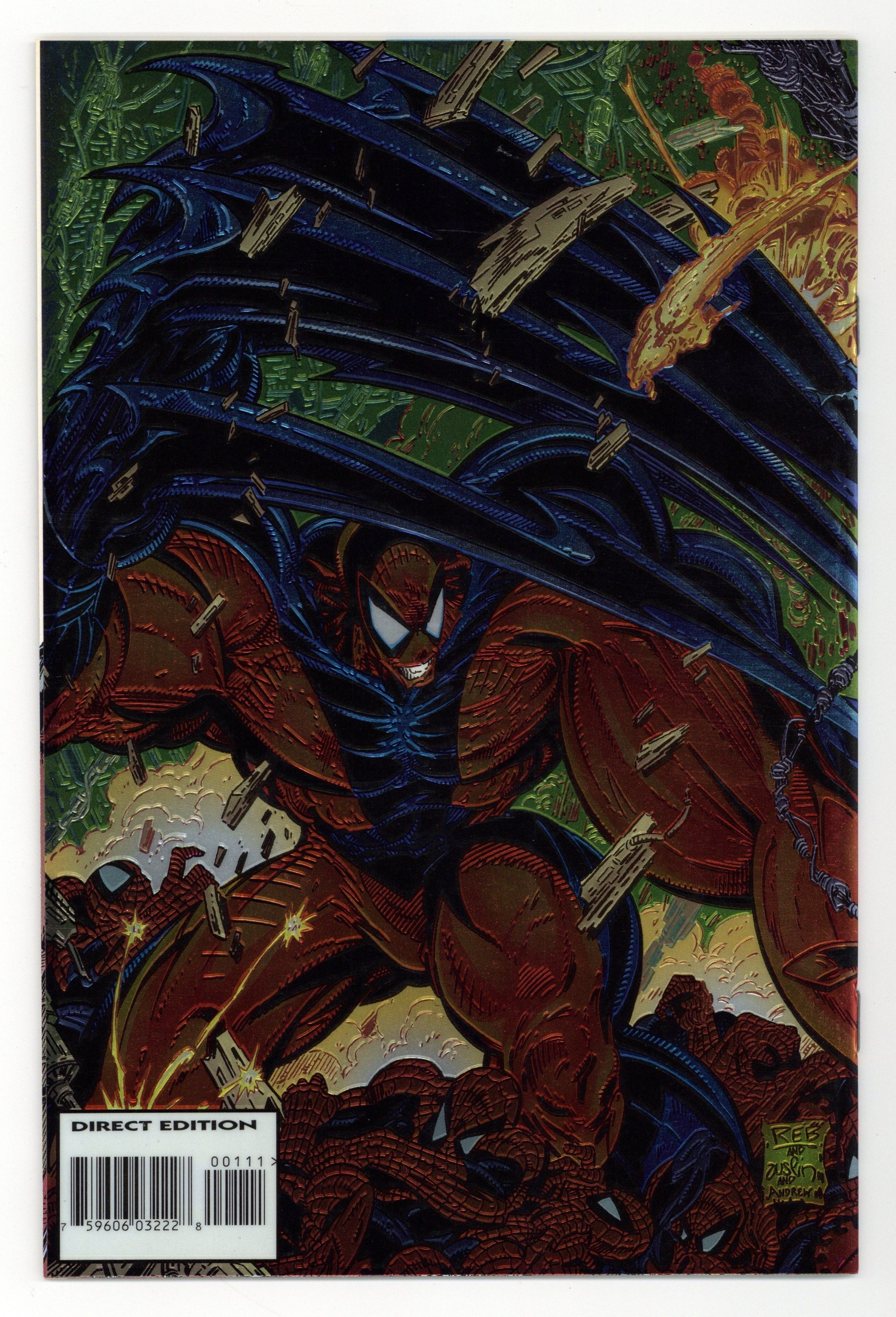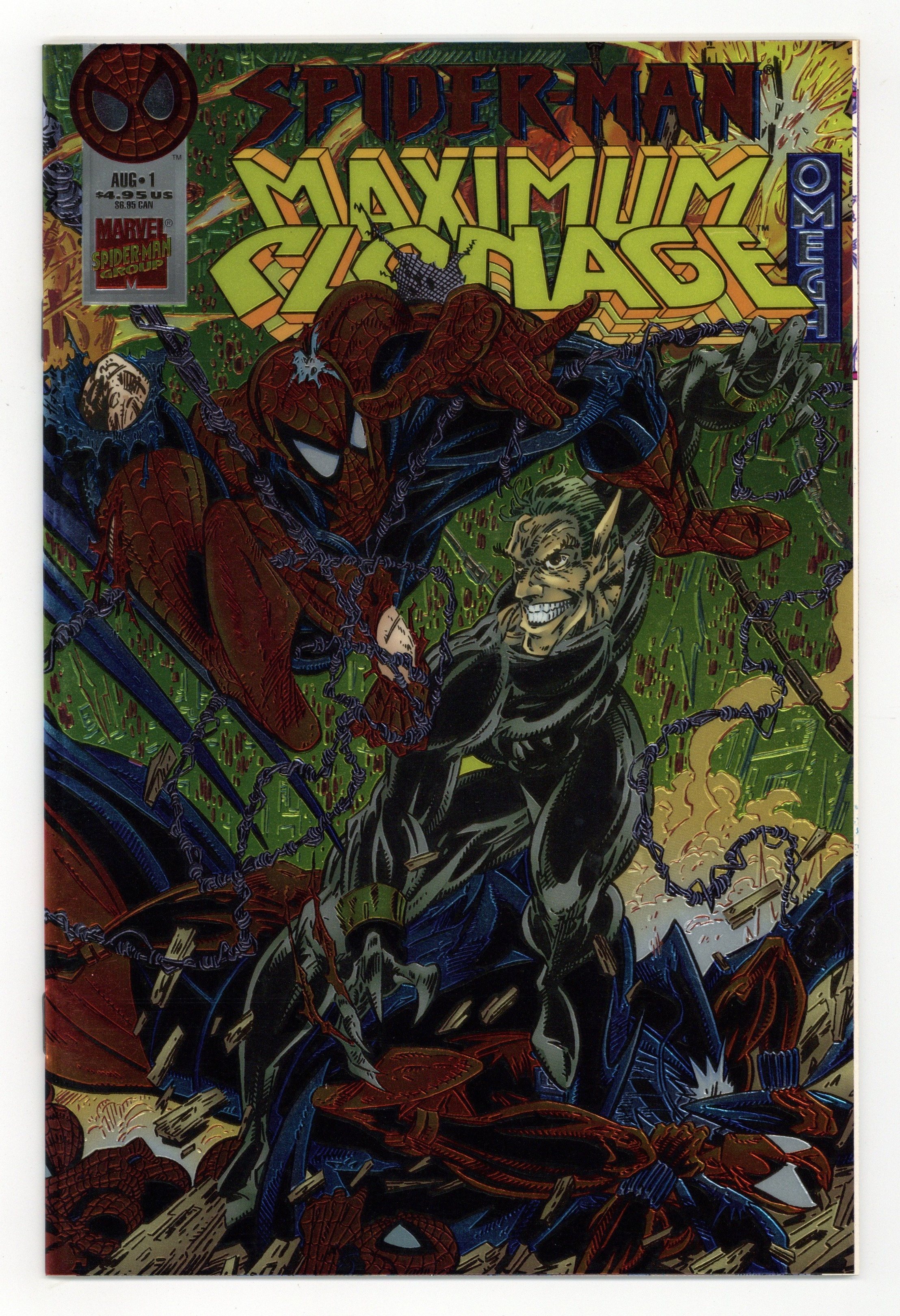 Tags: Maximum Clonage (part 6), Spider-Man$22.00"The End of the Beginning!" Maximum Clonage Part 6 of 6. Script by Tom Lyle. Art by Robert Brown (pp. 1-24, breakdowns), Roy Burdine (pp. 25-38, breakdowns), Mark Bagley (pp. 39-42, breakdowns), Tom Lyle (pp. 43-48, breakdowns), Sam de la Rosa (pp. 1-27, finishes); Randy Emberlin (pp. 28-38, finishes); Al Milgrom (pp. 39-42, finishes); and Scott Hanna (pp. 43-48, finishes). Wraparound foil cover by Robert Brown and Terry Austin. Story continues from Spectacular Spider-Man 227. The situation has come down to this! Atop the Daily Bugle Building; the Amazing Spider-Man (aka Peter Parker), Mary Jane, the Scarlet Spider (aka Ben Reilly), and the Gwen Stacy clone lay it all on the line to eradicate the evil of the Jackal once and for all! Can the combined might and determination of the foursome, both the clones and the non-clones, finally silence the Jackal (and defuse his carrion virus bomb)? Or will Professor Miles Warren's devious alter-ego continue to haunt Peter and Ben and their loved ones forever? An epic conclusion! Cameo appearances by J. Jonah Jameson, Joe Robertson, Scrier, and Spidercide. (Notes: Elements of the plot continue in Web of Spider-Man 128. Following the Maximum Clonage storyline; the Jackal, Spidercide, and Gwen Stacy clone exit the second clone saga. Printed on glossy paper. There are not any advertisements inside. This story was reprinted in 2010 in the trade paperback: Amazing Spider-Man The Complete Clone Saga Epic #4.) 48 pages. Cover price $4.95.