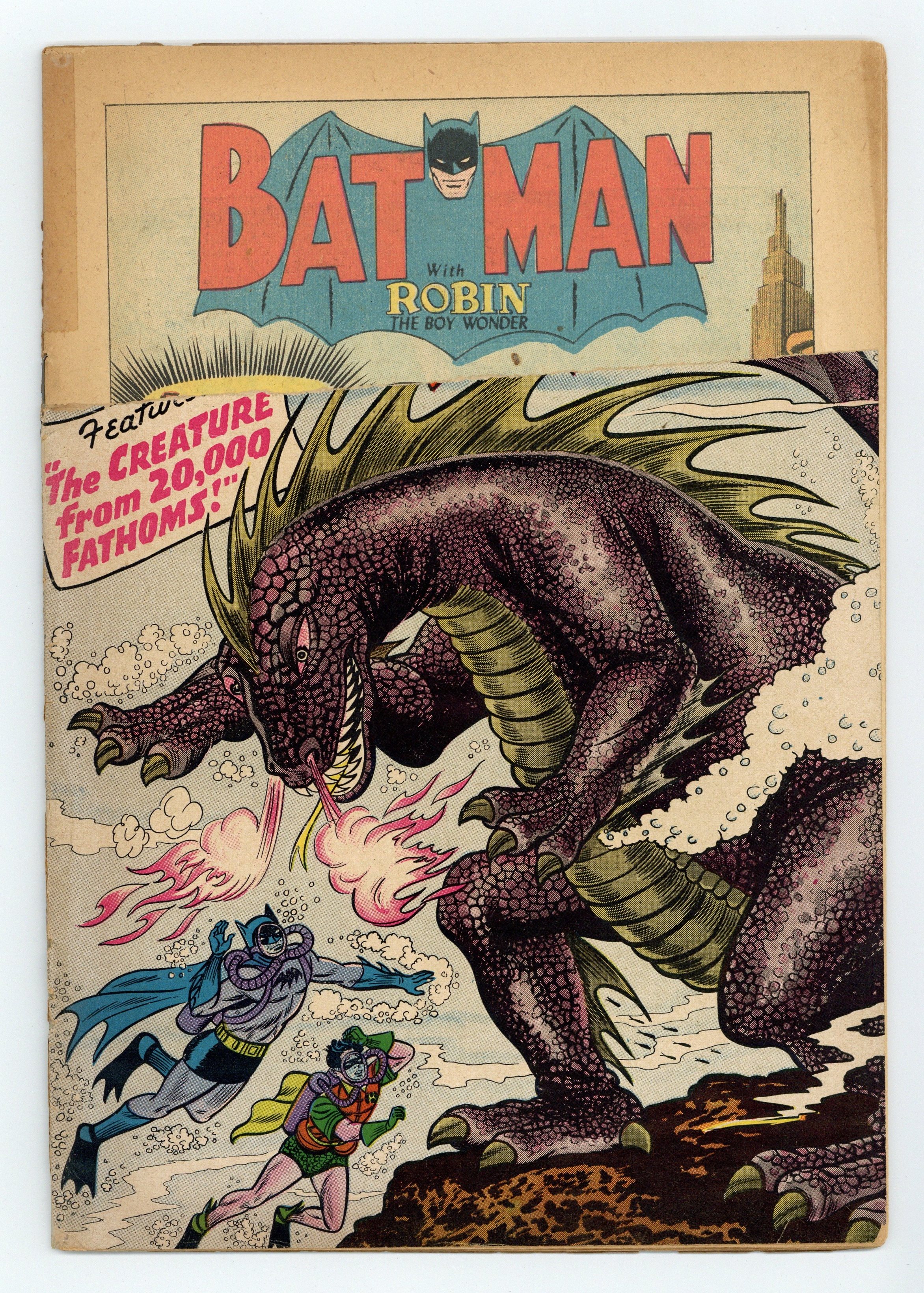 Cover by Sheldon Moldoff. "The Man Who Knew Batman's Secret," script by Edmond Hamilton, pencils by Dick Sprang, inks by Charles Paris; Batman is seeking to capture John Varden, but the wily criminal eludes him. Meanwhile, an out-of-town detective named Crane enters the picture, accidently discovering Batman's true identity, a fact well publicized by the media. Half-page Casey the Cop story by Henry Boltinoff. Gifts to the United Nations! public service announcement, art by Ruben Moreira. "Robin's 50 Batman Partners," script by Bill Finger, pencils by Dick Sprang, inks by Charles Paris; Batman injures his foot, so Robin must fill in for the Caped Crusader at the Batman Exposition, where he is being honored; Unfortunately, the Boy Wonder is attacked there by a mob who seek the diamonds the boy is carrying. 2/3-page Casey the Cop story by Henry Boltinoff. Invisible Detectives article by Jack Miller. "The Creature from 20,000 Fathoms," script by Bill Finger, pencils by Sheldon Moldoff, inks by Charles Paris; A new underwater species is discovered, but a diver seeks to sabotage efforts to study it, so Batman must step in and save the creature and its egg. 36 Pages, Full Color. Cover price $0.10.