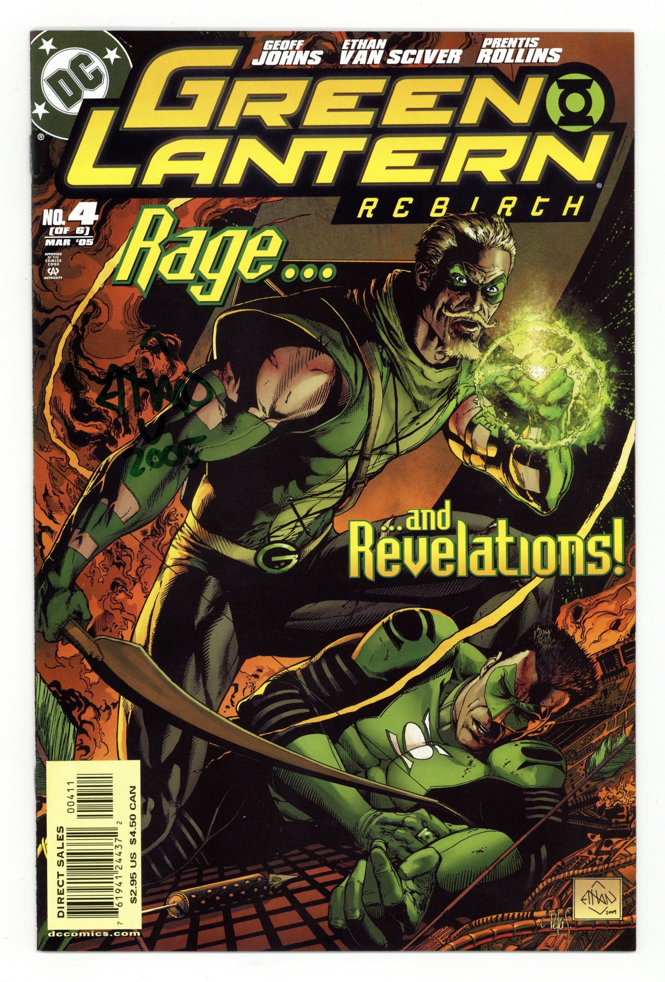 Written by Geoff Johns Art and cover by Ethan Van Sciver Continuing the startling rebirth of Hal Jordan by Geoff Johns (JSA, THE FLASH, TEEN TITANS) and Ethan Van Sciver (BATMAN/CATWOMAN: TRAIL OF THE GUN, New X-Men) with an issue guest-starring three of DC's most powerful teams: the JLA, JSA and Teen Titans! One of the deadliest villains in the DCU returns: Parallax! Things continue to twist and turn for John Stewart, Guy Gardner and Kilowog as they come face-to-face with their greatest enemy ? the man who destroyed the Green Lanterns. Meanwhile, Green Arrow struggles to find a way to stop Parallax as the JLA, the JSA and the Teen Titans join the fight! On sale Jan 26 ? 4 of 6 ? 32 pg, FC, $2.95 US Cover price $2.95.