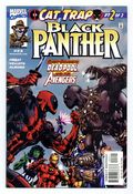 Cover by Sal Velluto & Bob Almond. Written by Christopher Priest, art by Velluto and Almond. CAT TRAP: Part 2 (of 2). Deadpool has stolen Killmonger's leopard, and has nabbed the Avenger named Triathlon as a bonus! Now the new Black Panther and Earth's Mightiest Heroes race to Wakanda for a showdown with the Merc With A Mouth! But with all this going on, where is T'Challa? Find out in the conclusion to the DEADPOOL/BLACK PANTHER crossover! Cover price $2.50.