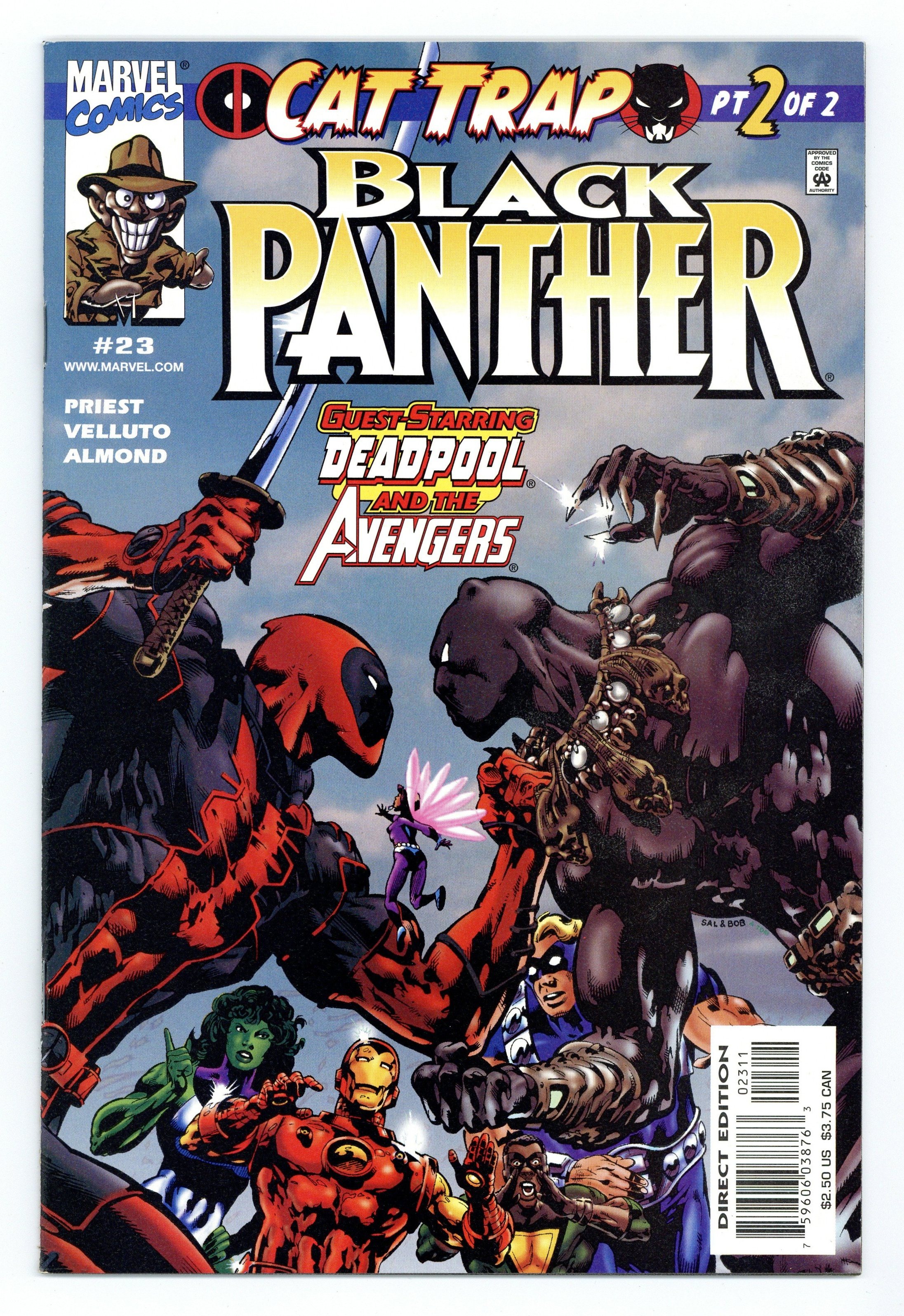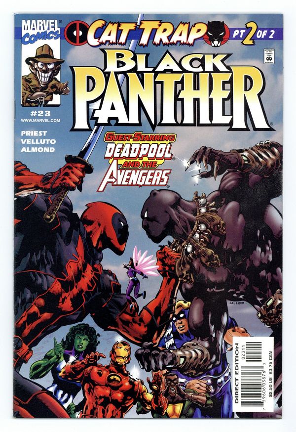 Tags: Cat Trap (part 2), Marvel Legacy Numbering: Black Panther (part 38), Avengers, Black Panther, Deadpool$32.00Cover by Sal Velluto & Bob Almond. Written by Christopher Priest, art by Velluto and Almond. CAT TRAP: Part 2 (of 2). Deadpool has stolen Killmonger's leopard, and has nabbed the Avenger named Triathlon as a bonus! Now the new Black Panther and Earth's Mightiest Heroes race to Wakanda for a showdown with the Merc With A Mouth! But with all this going on, where is T'Challa? Find out in the conclusion to the DEADPOOL/BLACK PANTHER crossover! Cover price $2.50.