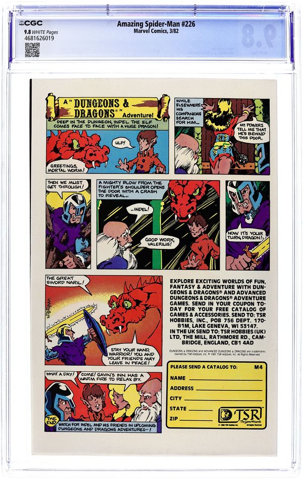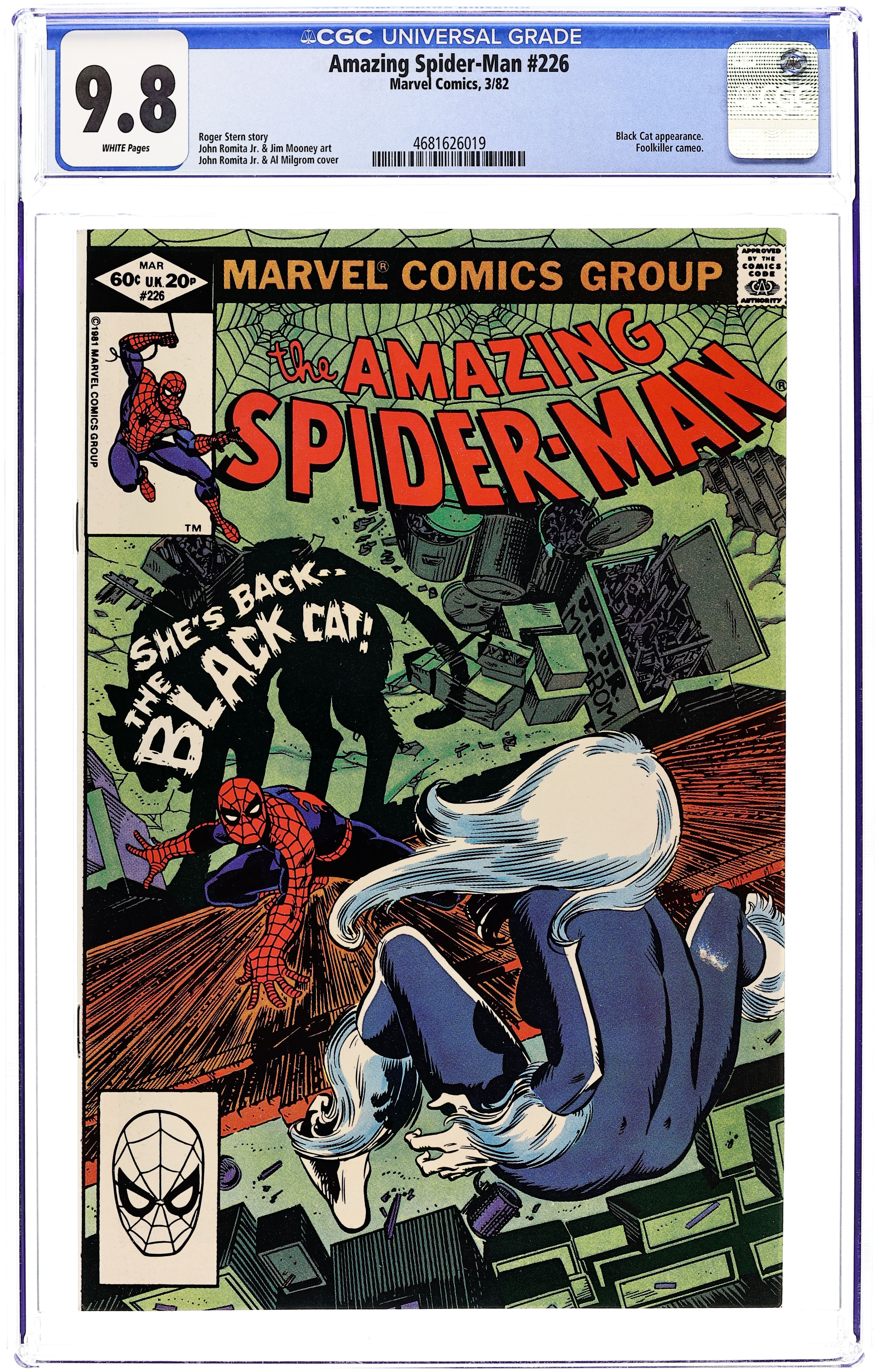 Tags: Marvel Legacy Numbering: Amazing Spider-Man (part 226), Spider-Man$26.00Direct Edition. "But the Cat Came Back" Part 1 of 2. Script by Roger Stern. Art by John Romita Jr. (breakdowns) and Jim Mooney (finishes). Cover by John Romita Jr. and Al Milgrom. Because the fans demanded her, the Black Cat is back! And flirting and fighting with the web-slinger all over again! After Felicia escapes from the psychiatric hospital, she resumes her high-dollar heists! But soon realizes that it's not as much fun without Spider-Man chasing her! So, the cat burglar extraordinaire arranges an evening rendezvous with her favorite wall-crawler at their first date location (from Amazing Spider-Man 194). Will the enchanting cat mesmerize the Spectacular Spider-Man once more? Or can the web-slinger resist her feline charms? An excellent issue! Cameo appearances by the Foolkiller and Captain Jean DeWolff. (Notes: This was a highly anticipated issue for fans of the wall-crawler; and Stern & Romita Jr. did not disappoint. The Black Cat previously appeared in Amazing Spider-Man 205. This story was reprinted in Spider-Man Magazine 2 and also in the trade paperback: Spider-Man vs. the Black Cat (2005). The back cover features a full-page ad for Dungeons & Dragons with art by Bill Willingham.) 36 pgs. Cover price $0.60.