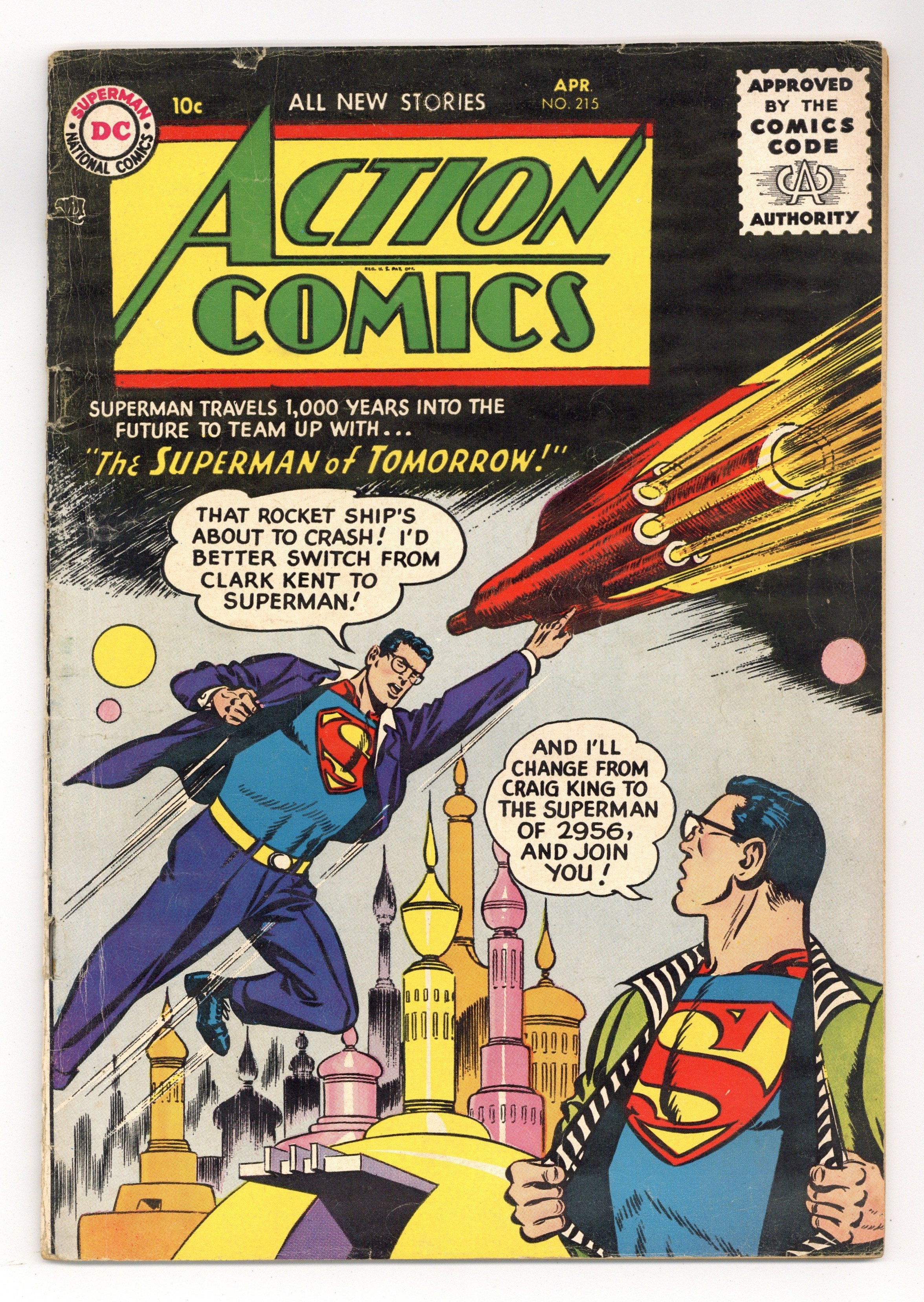 Tags: Superman$175.00Cover pencils by Wayne Boring, inks by Stan Kaye. "The Superman of Tomorrow," pencils by Wayne Boring, inks by Stan Kaye; Craig King uses scientific gadgets in 2956 to duplicate Superman's powers but now he needs help to catch scientific bandits, so he beams a message across time to the Real Superman. "The Big Game Butterfly Hunter," art by Ed Smalle; Hector Doolittle unwittingly risks life and limb to collect rare butterflies. -page Bebe story by Henry Boltinoff. "Flying Rangers" text story by script by Jack Miller (as John Maxton), art by Raymond Perry. "The Mystery of the Stolen Worlds," script by Otto Binder, art by Jim Mooney; Giant hands out of nowhere move things around in space. 36 Pages, Full Color. $.10 Cover price $0.10.