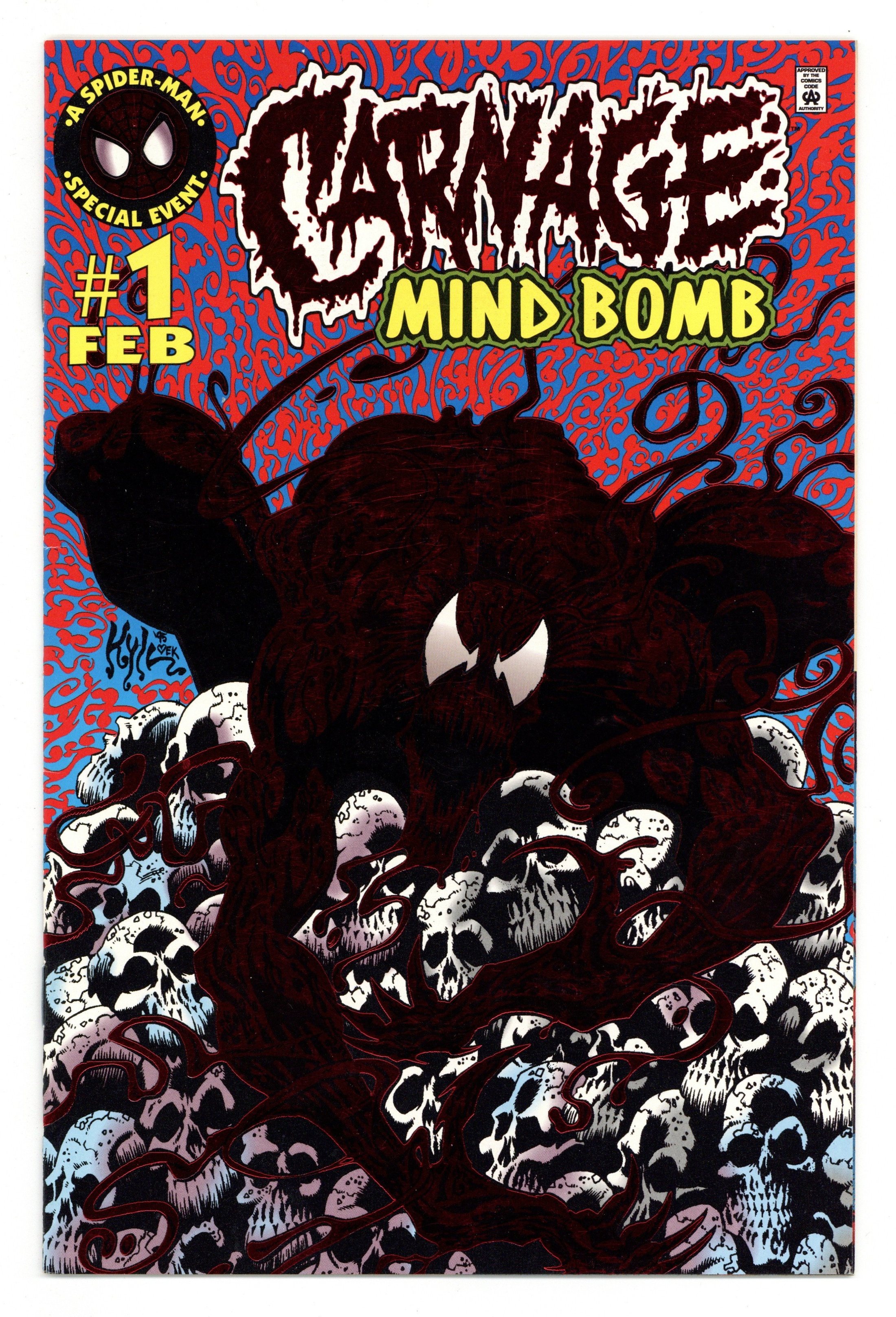 Carnage cuts loose in his own one-shot! Just in time for the Holidays: a warm and cozy look into the mind of a psychopath! It's 32 pages of Spider-Man's most fearsome foe decking the halls with gobs of gore! Written by Warren Ellis. Art and foil-stamped cover by Kyle Hotz. Cover price $2.95.