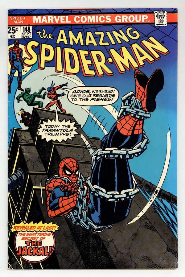 Tags: Marvel Legacy Numbering: Amazing Spider-Man (part 148), Spider-Man Clone Saga (part 00I)$33.00"Jackal, Jackal...Who's Got the Jackal?" Script by Gerry Conway. Pencils by Ross Andru. Inks by Mike Esposito and Dave Hunt (backgrounds). Cover by Gil Kane and John Romita Sr. As shown on the fateful cover, the Tarantula throws the shackled web-slinger off the top of the Brooklyn Bridge! Can the amazing one stop his freefall before slamming into the East River? If not, poor Spidey will sleep with the fishes and never learn the truth behind Gwen's return. Meanwhile at the Daily Bugle, Ned Leeds finally connects the dots about the Gwen Stacy clone! Apparently, Gwen once donated cell tissue samples in Professor Miles Warren's biology class at Empire State University! Hmmm, has the good professor been playing god in his spare time? All will be revealed next issue! Cameo appearance by Mary Jane Watson. Flashback cameos by Anthony Serba and Gwen Stacy. (Note: The letters page includes a letter from Eclipse comics publisher Dean Mullaney. This story was reprinted in Marvel Tales 125.) 36 pages. 25c cover price. Cover price $0.25.