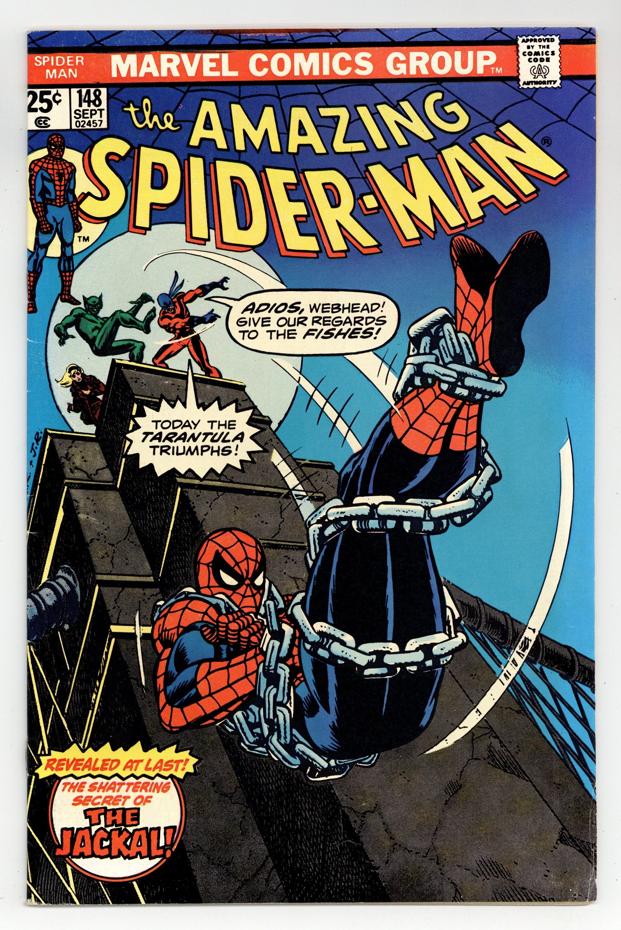 "Jackal, Jackal...Who's Got the Jackal?" Script by Gerry Conway. Pencils by Ross Andru. Inks by Mike Esposito and Dave Hunt (backgrounds). Cover by Gil Kane and John Romita Sr. As shown on the fateful cover, the Tarantula throws the shackled web-slinger off the top of the Brooklyn Bridge! Can the amazing one stop his freefall before slamming into the East River? If not, poor Spidey will sleep with the fishes and never learn the truth behind Gwen's return. Meanwhile at the Daily Bugle, Ned Leeds finally connects the dots about the Gwen Stacy clone! Apparently, Gwen once donated cell tissue samples in Professor Miles Warren's biology class at Empire State University! Hmmm, has the good professor been playing god in his spare time? All will be revealed next issue! Cameo appearance by Mary Jane Watson. Flashback cameos by Anthony Serba and Gwen Stacy. (Note: The letters page includes a letter from Eclipse comics publisher Dean Mullaney. This story was reprinted in Marvel Tales 125.) 36 pages. 25c cover price. Cover price $0.25.
