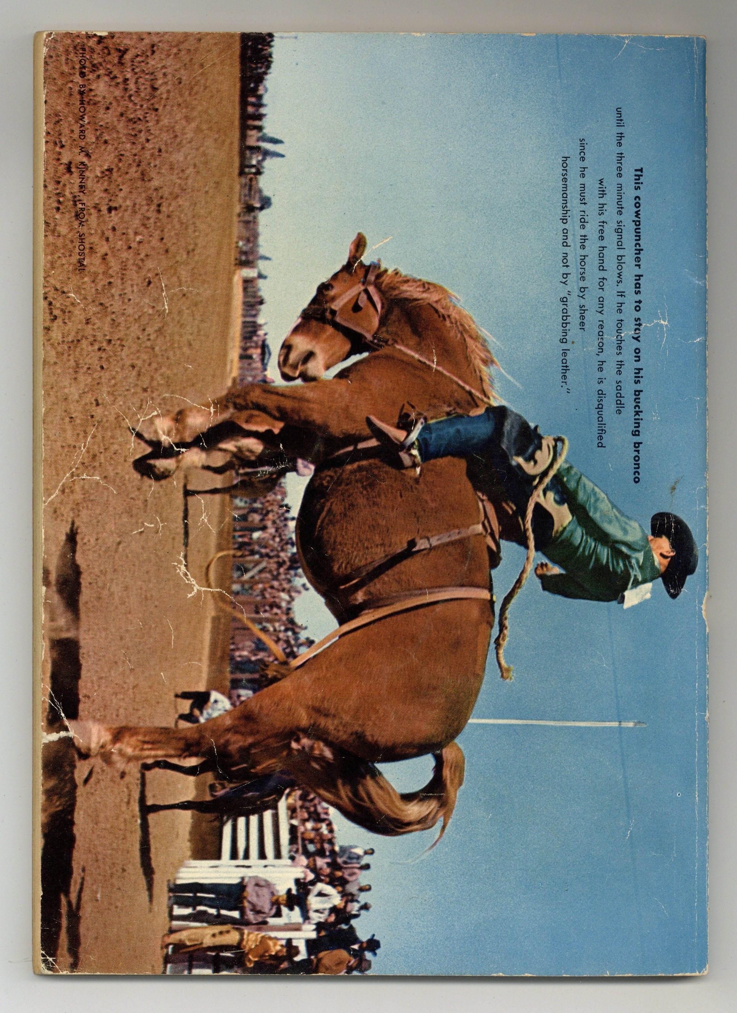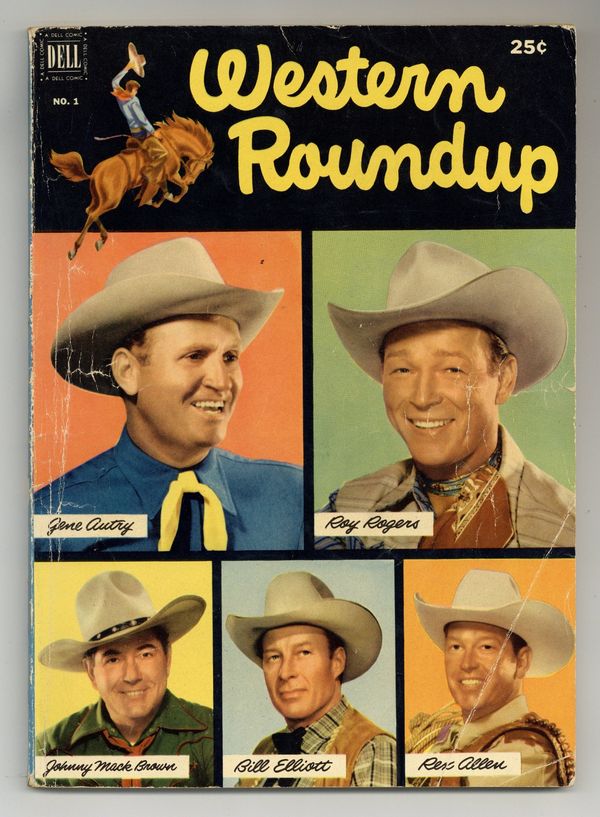 American Edition 25¢ cover price. Photo cover with Gene Autry, Roy Rogers, Johnny Mack Brown, Bill Elliott, and Rex Allen. Gene astride a sitting Champion photo. Gunfighter's Retreat starring Roy Rogers, art by Peter Alvarado; Roy encounters a "retirement" home for old gunfighters. Dictionary of Western Terms. The Mustangers starring Trigger, art by Till Goodan. Short article about various breeds of horses. Nickel Plated Pay-Off starring Gene Autry, art by John Ushler. Words and music to the song Red River Valley. Killer Trouble starring Champion, art by Nicholas Firfires. Articles on rodeo. The Phantom Stage starring Johnny Mack Brown. The Pay-Off Bandit starring Wild Bill Elliott. Double Deception starring Rex Allen, art by Peter Alvarado. 100 Pages, Full Color. Cover price $0.25.