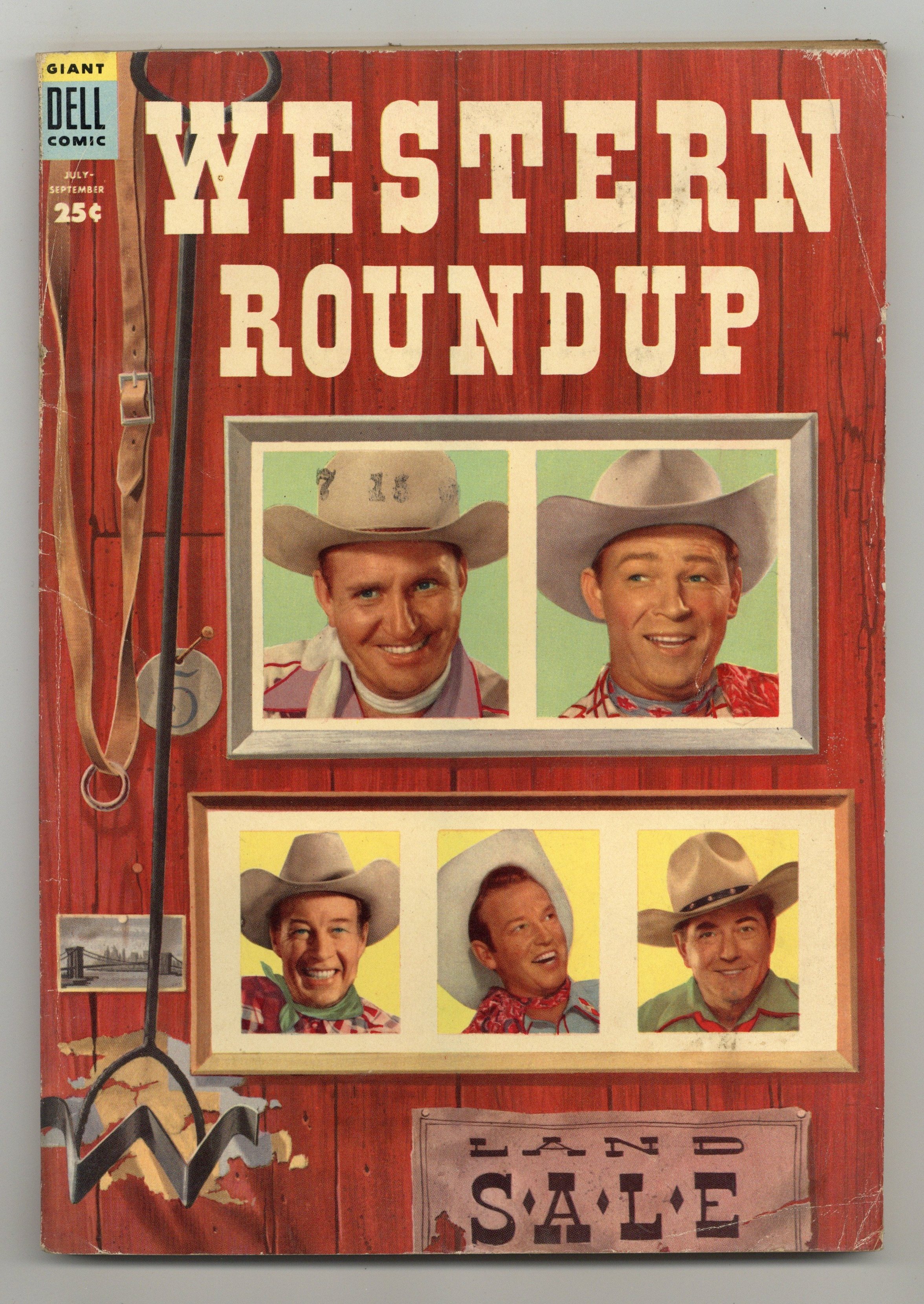 Photo cover of Gene Autry, Roy Rogers, Wild Billiott, Rex Allen, and Johnny Mack Brown. Gene Autry photo. Double for Murder starring Roy Rogers, art by Mike Arens. Trouble in Texas starring Bullet and Trigger, art by John Ushler. The Right Trail starring Gene Autry, art by Nicholas Firfires. Colt Trouble starring Champion, art by Nicholas Firfires. Brief history and description of Yellowstone Park. A Lucky Switch starring Johnny Mack Brown, art by Sparky Moore. The Feather River Gang, art by Wild Bill Elliott. Desert Fury starring Rex Allen. Roy Rogers photo. 100 Pages, Full Color. Cover price $0.25.