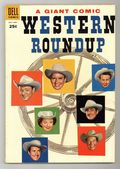 Tags: Dell Giant$19.75Photo cover with Gene Autry, Roy Rogers, Johnny Mack Brown, Bill Elliott, Dale Evans, and Rex Allen. Gene Autry photo. The Riddle of the Prestons starring Roy Rogers; A young man mistaken for his twin brother is framed for robbery; Roy sets out to clear him. Montana Cowboy of 70 Years Ago essay. Last of the Gunmen starring Gene Autry, art by Nicholas Firfires. Double Rescue starring Champion, art by Tony Sgroi. The Telltale Dollars starring Dale Evans, art by Russ Manning. Crisis at Cub Creek starring Rex Allen. The Doctor's Mistake text story. Timber Treachery starring Wild Bill Elliott, art by Al Micale. The Unsuspected Clue starring Johnny Mack Brown. The Come-On starring Flying A's Range Rider, art by Tony Sgroi. 100 Pages, Full Color. Cover price $0.25.