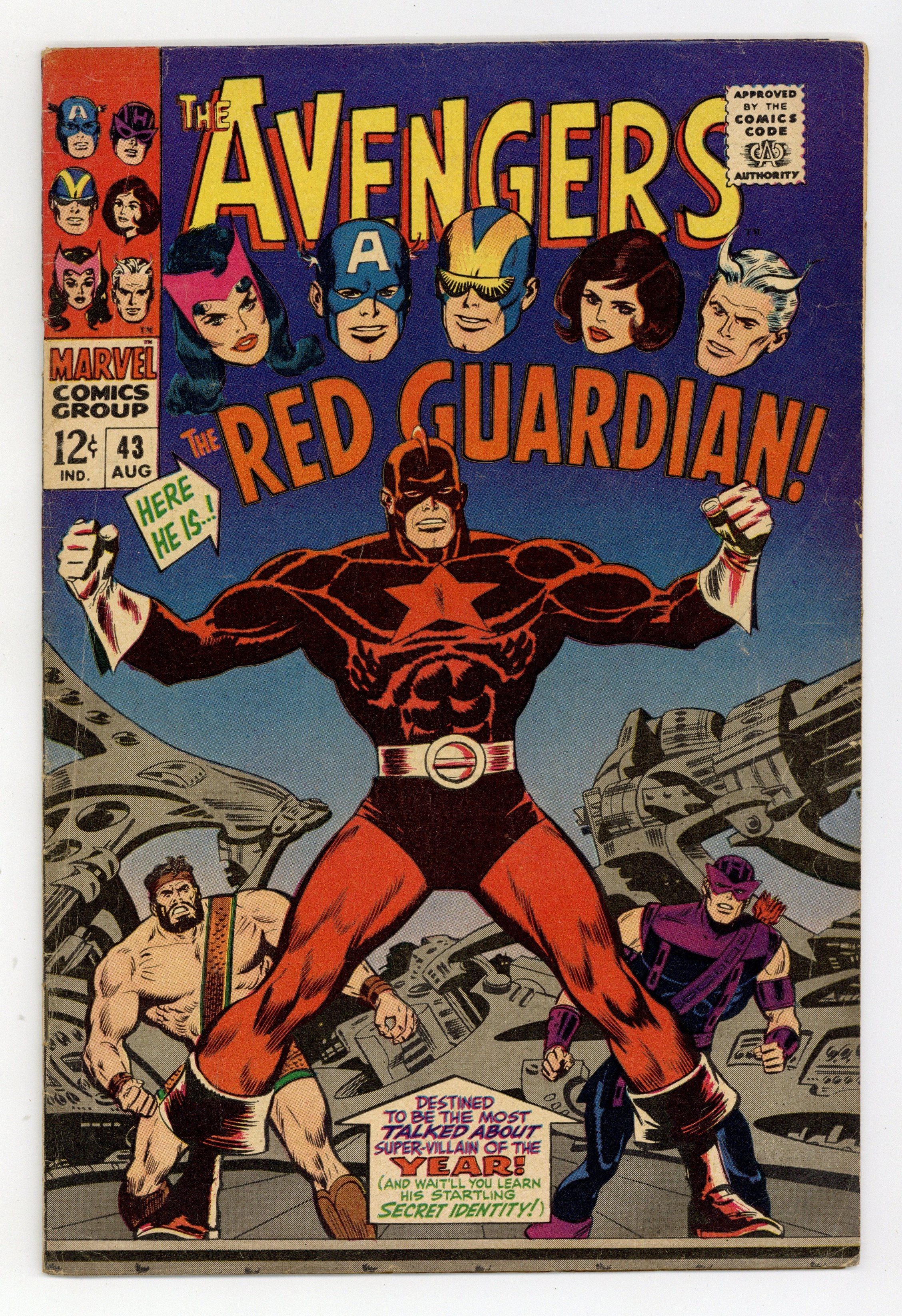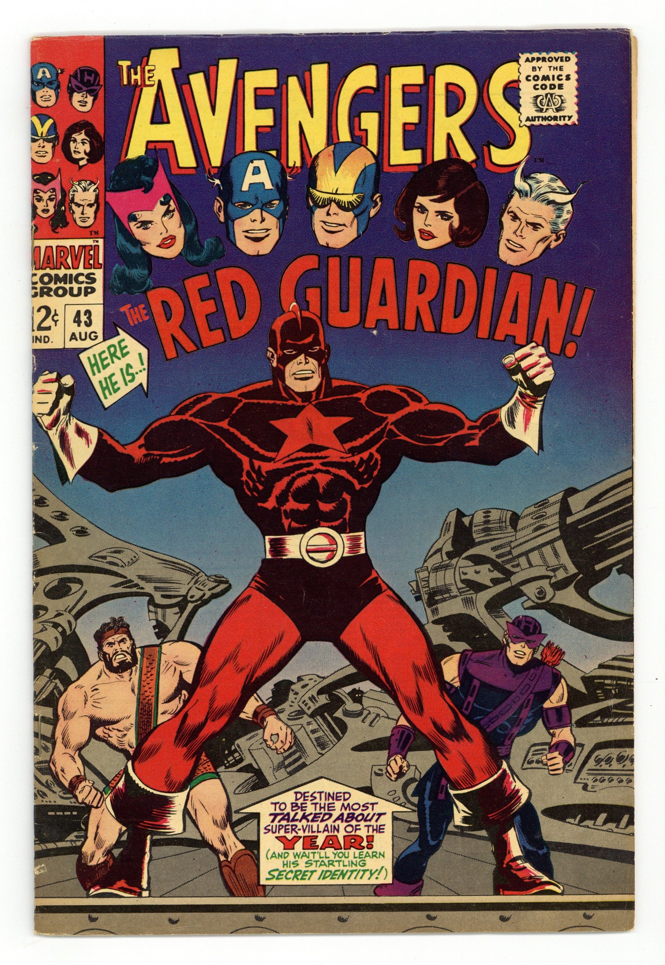 First appearance of the Red Guardian in "Color Him...the Red Guardian!" Part 1 of 2. Script by Roy Thomas. Pencils by John Buscema. Inks by George Roussos (as George Bell). Cover by John Buscema and George Roussos. After receiving a tip concerning the Black Widow's whereabouts, Hawkeye andHercules travel to the Far East to rescue her! But her communist captors have created a super-powered adversary to oppose them: the Red Guardian! Once the Prince of Power and the ace archer arrive in the Middle Kingdom, they defeat the guard force and challenge the Red Guardian! However thecommunist champion is smart and tough! He uses the Psychotron to confuse Hercules -- and next uses his belt weapon to knock out Hawkeye. And then while basking in the glow of his victory, the guardian makes a shocking announcement: Natasha Romanoff is his wife! What a red-letter day for the Red Guardian! Avengers Lineup: Captain America, Goliath, Hawkeye, Hercules, Quicksilver, Scarlet Witch, and the Wasp. (Note: This story was reprinted in Marvel Triple Action #35.) 36 pages. Cover price $0.12.