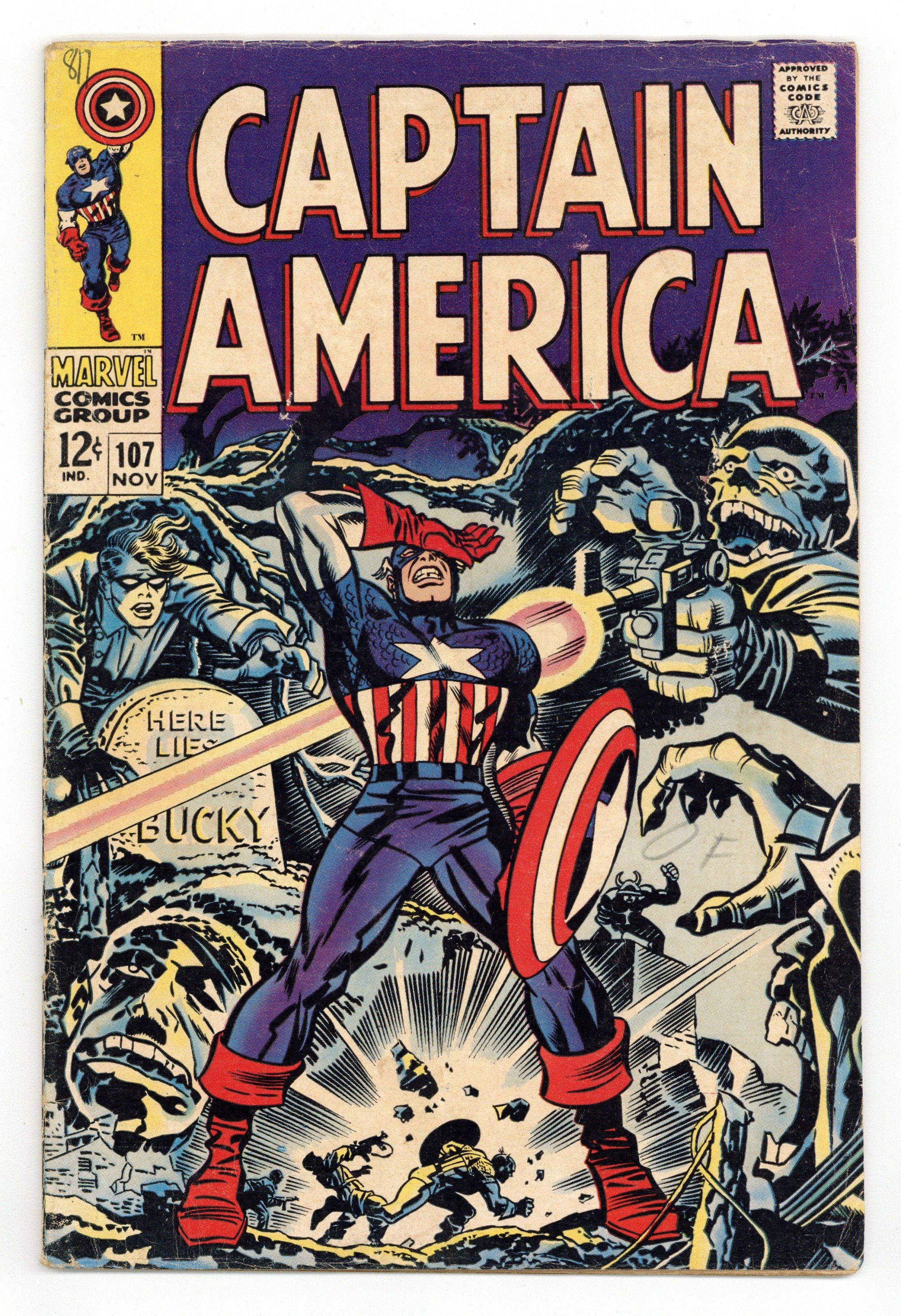 Cover pencils by Jack Kirby, inks by Frank Giacoia. Cap faces Dr. Faustus (first appearance) in "If the Past Be Not Dead," script by Stan Lee, pencils by Jack Kirby, inks by Syd Shores; Captain American keeps dreaming that hes being chased by demonic looking Nazi soldiers; Cap comes across the grave of his old sidekick Bucky Barnes; Cap calls his psychiatrist Dr. Faustus to tell him that he keeps having the same dream; Cap battles Dr. Faustus; Cameos by the Red Skull and Bucky Barnes. Letter to the editor from comics historian Peter Sanderson Jr. 36 pgs., full color. $0.12. Cover price $0.12.