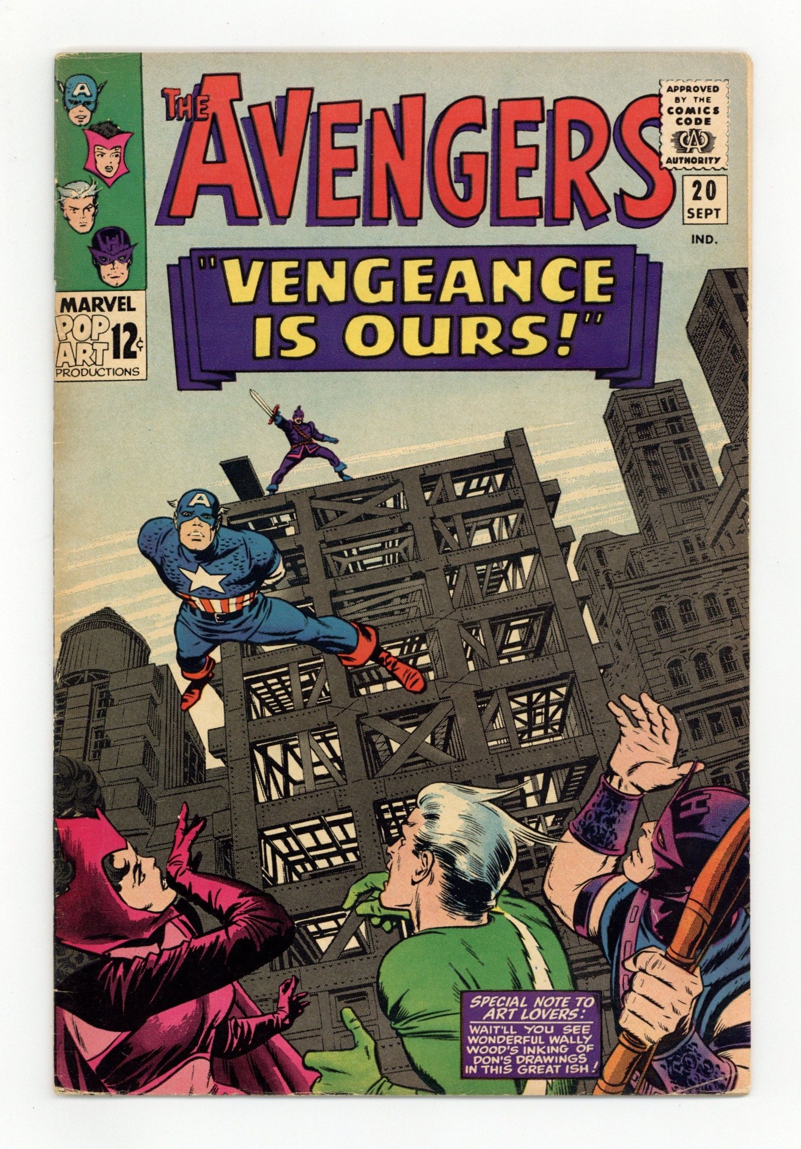 Tags: Marvel Legacy Numbering: Avengers (part 20), Avengers$16.00Cover pencils by Jack Kirby, inks by Wally Wood. "Vengeance Is Ours!", script by Stan Lee, pencils by Don Heck, inks by Wally Wood; After jumping over the edge last issue, the Avengers have very little time to rescue Captain America, but with quick thinking they manage it; The Swordsman is outraged and attacks them. During the battle he starts to vanish mysteriously; He awakens in the lair of the Mandarin; The Mandarin allies himself with the Swordsman, giving him a more powerful sword; He then creates an image of Iron Man which he sends to the Avengers, vouching for the Swordsman's membership; Once in the Avengers HQ he plants bombs to destroy them; He later has a change of heart and tries to remove the bombs, but is caught by Captain America, who believes he is attaching them. Avengers Roll Call: Captain America, Hawkeye, Quicksilver, and the Scarlet Witch. Cameo by Iron Man. Reprinted in Marvel Triple Action #14. 36 pgs., full color. $0.12. Cover price $0.12.