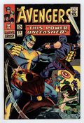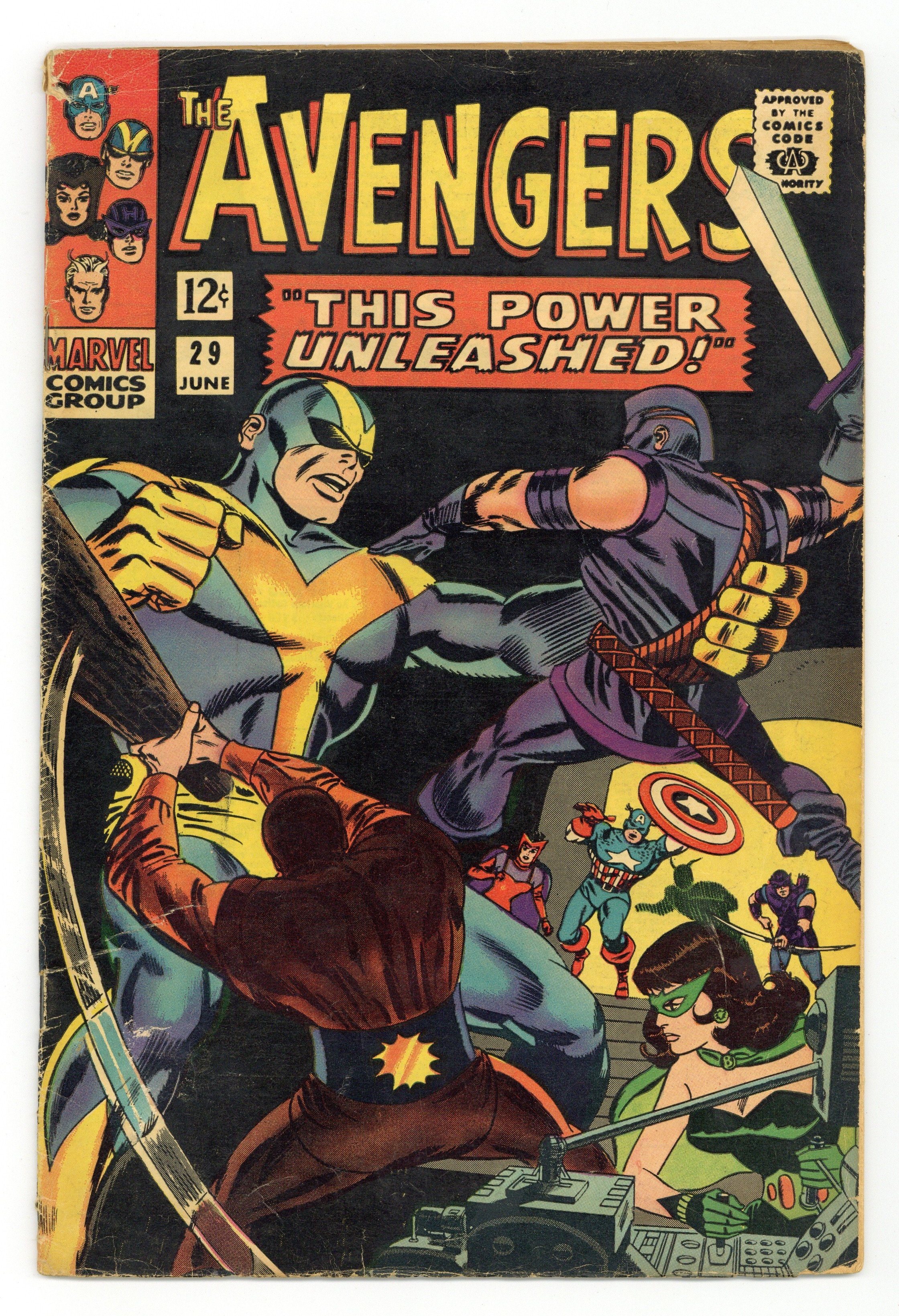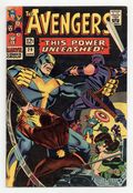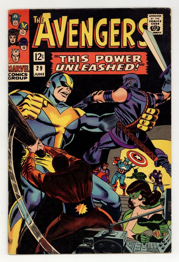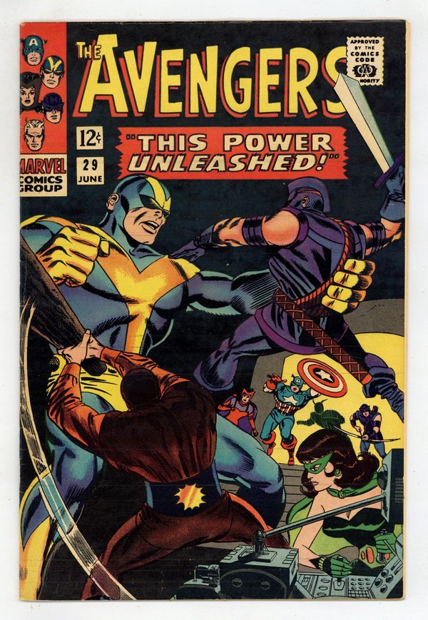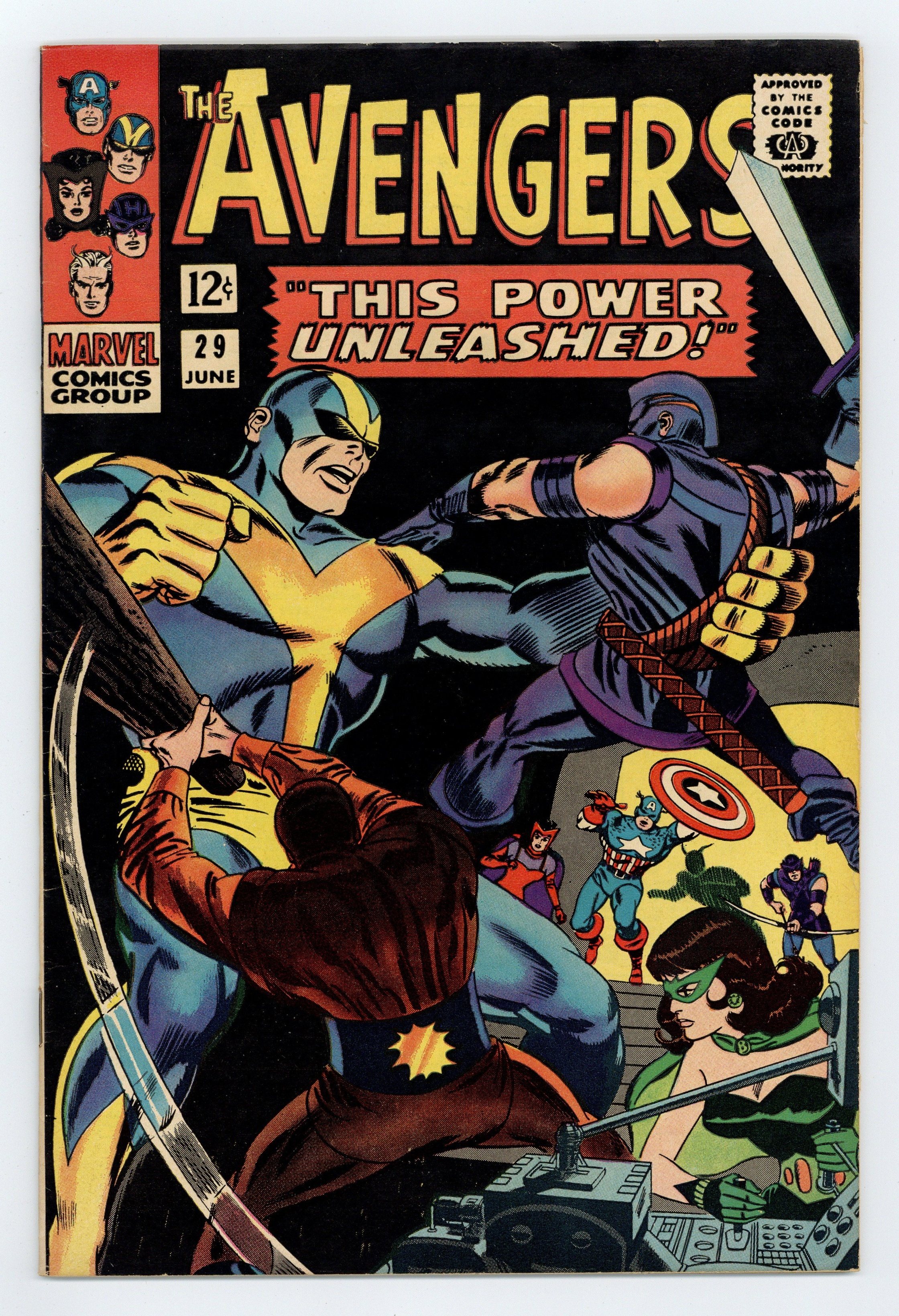 Cover pencils by Don Heck, inks by Frank Giacoia. "This Power Unleashed!", script by Stan Lee, pencils by Don Heck, inks by Frank Giacoia; The Avengers find themselves unable to revive the fallen Goliath; A doctor informs them that he will recover but must never attempt to shrink any further than his present 10-foot size; Goliath storms out in anger; Black Widow is captured by Russians, brainwashed and sent to destroy the Avengers; She enlists the help of the Swordsman and Power Man; The Avengers are all captured with the exception of Goliath and the Wasp; They free the captive Avengers, and after a brief battle, the Black Widow, the Swordsman and Power Man all escape. Avengers roll call: Captain America, Hawkeye, Goliath, the Wasp, Quicksilver, and the Scarlet Witch. Letter to the editor from comics writer Mike Friedrich. Reprinted in Marvel Triple Action # 23. 36 pgs., full color. $0.12. Cover price $0.12.
