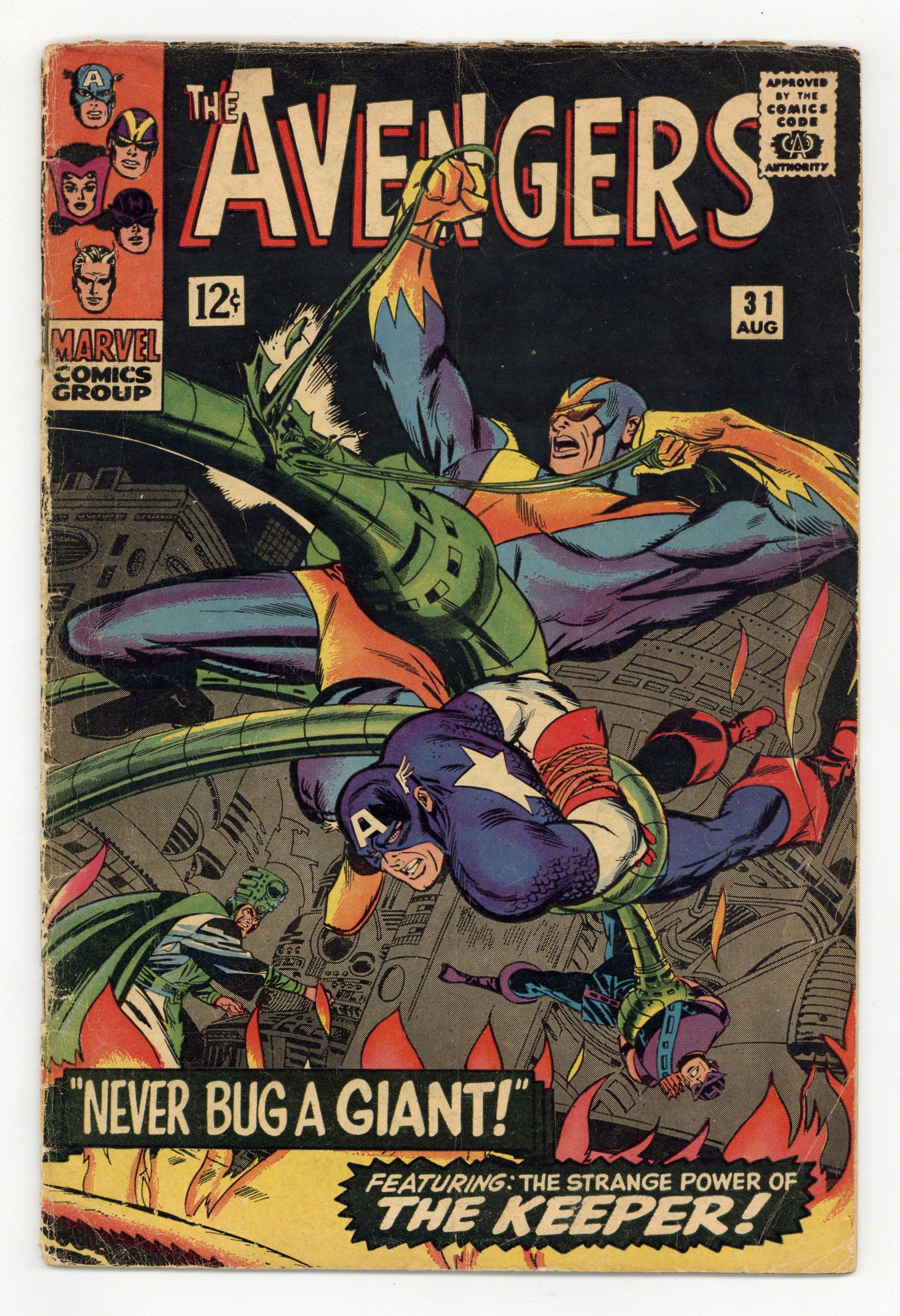 Tags: Marvel Legacy Numbering: Avengers (part 31), Avengers$22.50Cover by Don Heck. "Never Bug a Giant!", script by Stan Lee, pencils by Don Heck, inks by Frank Giacoia; Captain America, The Wasp and Hawkeye leave for South America to help Goliath; Meanwhile, Quicksilver and the Scarlet Witch realise how badly they like being Avengers and hope their powers return soon; Goliath and Prince Rey escape to Prince Rey's rebel hideout; He explains how the Keeper controls a powerful cobalt flame, capable of destroying the world; Goliath realizes Prince Rey only wants the flame for his own desires and leaves him; Goliath attacks the Keeper and gets captured; The other Avengers attack and also get captured with the exception of the Wasp; Prince Rey's forces attack the Keeper's, while at the same time, the Wasp frees all the Avengers; Hawkeye smothers the flame with explosive arrows, destroying it. Avengers roll call: Captain America, Hawkeye, Goliath, the Wasp, and, briefly, Quicksilver,and the Scarlet Witch. Reprinted in Giant-Size Marvel Triple Action #1. 36 pgs., full color. $0.12. Cover price $0.12.