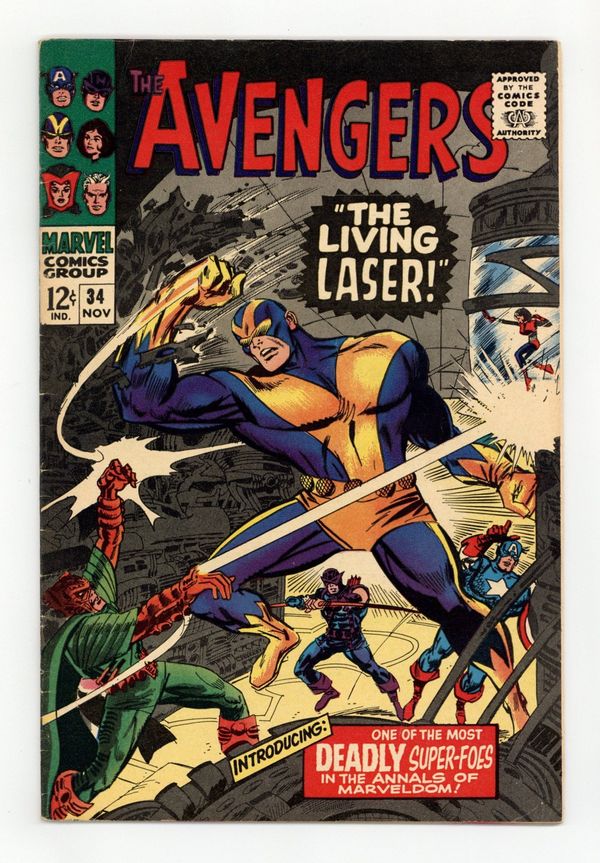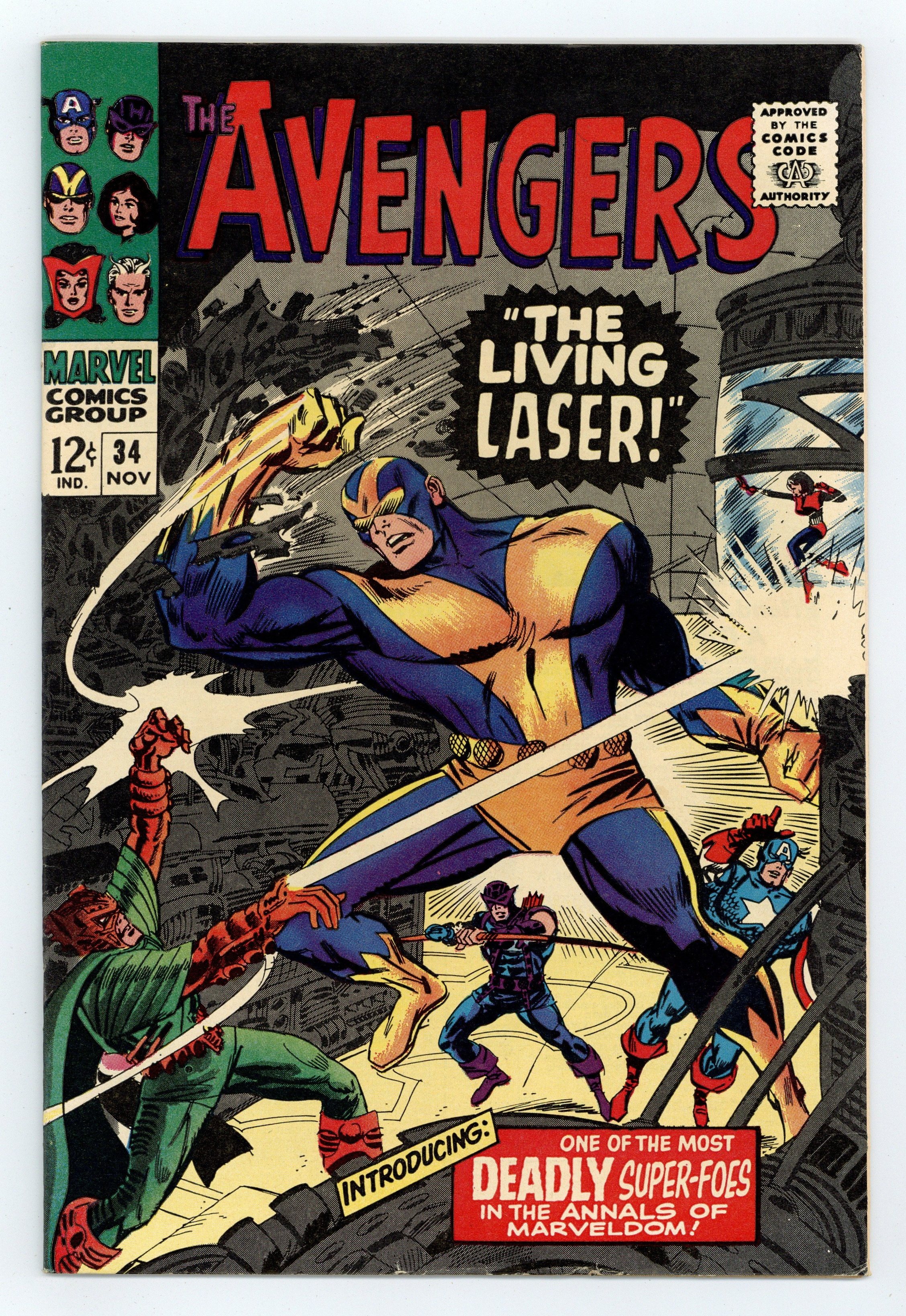First appearance of the Living Laser in "The Living Laser!" Part 1 of 2. Script by Stan Lee. Art by Don Heck. Cover by Don Heck. A new super-villain bursts on the scene! And he's using -- light amplification by stimulated emission of radiation -- as his primary weapon! After robbing a bank, Arthur Parks (aka the Living Laser) has a chance encounter with Janet van Dyne...and he is immediately smitten by her beauty. But the Living Laser's attraction to the Wasp is twisted -- and he attacks Goliath in order to eliminate him from Jan's life! Hank Pym defeats the Living Laser, and itseems like the episode is over. However Arthur Parks escapes and begins a new crime spree across the city! So now the Avengers have to find and defeat the Living Laser again! Cameo appearance by Dr. Bill Foster. Avengers Lineup: Captain America, Goliath, Hawkeye, and the Wasp. (Notes: This story completes Stan Lee's excellent scripting run on the Avengers title -- which began with issue #1 in 1963. This story was reprinted in Marvel Triple Action #26.) 36 pages. Cover price $0.12.