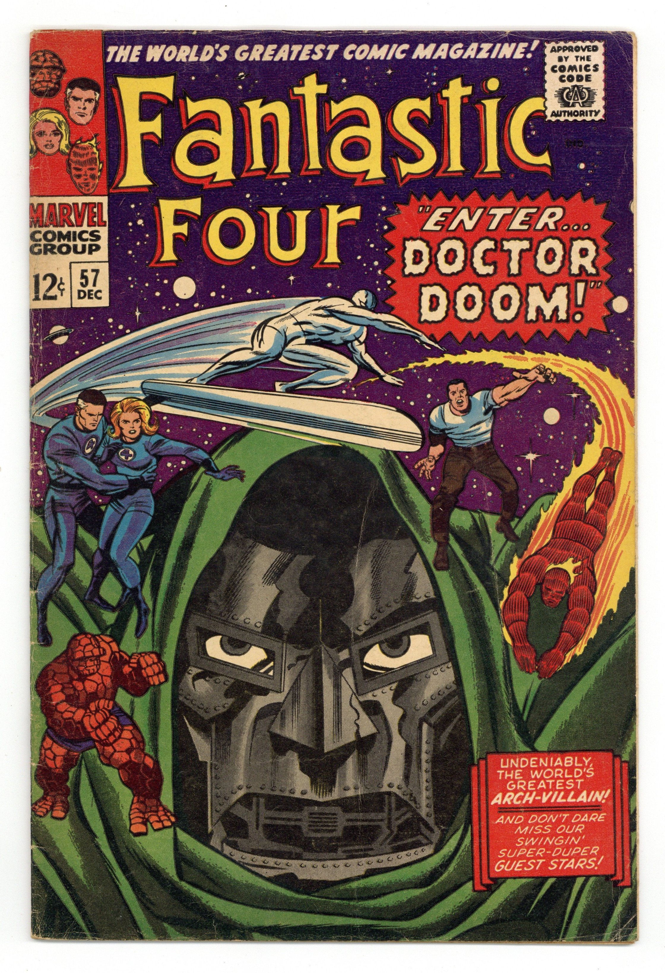 Cover pencils by Jack Kirby, inks by Joe Sinnott. Enter... Dr. Doom!, script by Stan Lee and Jack Kirby (co-plot), pencils by Jack Kirby, inks by Joe Sinnott; While Sandman attempts to free the Wizard, Dr. Doom steals the Surfer's Power Cosmic (part 1 of 4). Appearances by the Inhumans, the Sandman, and the Wizard. Captain America cameo. 36 pgs. $0.12. Cover price $0.12.
