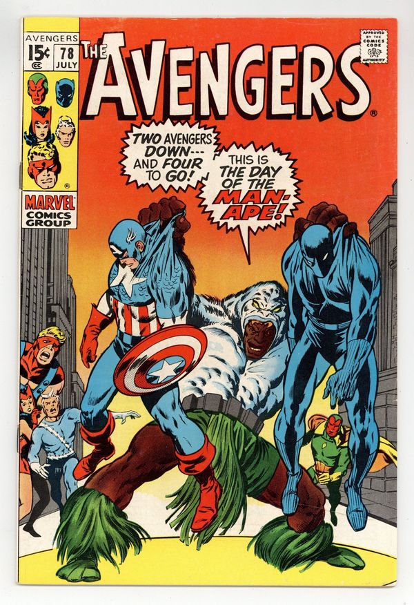 "The Man-Ape Always Strikes Twice!" Part 1 of 2. Script by Roy Thomas. Pencils by Sal Buscema. Inks by Tom Palmer. Cover by John Buscema and Tom Palmer. On a quiet evening atop Avengers Mansion, the Man-Ape ambushes the star-spangled avenger! But thankfully Cap's teammates quickly join the fight and drive off the African super-villain! Why did the Man-Ape strike out at the Avengers all alone? Seems like a tall order for a low-level lackey! Later on after abducting Monica Lynne, the Man-Ape picks a fight with another avenger, the Black Panther! The Prince of Wakanda bravely battles his larger adversary, but does not prevail. However at the end of the struggle, T'Challa learns who is masterminding the Man-Ape's operation…the Grim Reaper! And the scythe-wielding scoundrel will be gunning for the rest of Earth's Mightiest Heroes next issue! Cameo and first appearance of the Lethal Legion. Second appearance of the Grim Reaper. Avengers Lineup: Black Panther, Captain America, Goliath, Quicksilver, Scarlet Witch, and the Vision. (Notes: The Grim Reaper previously appeared in Avengers 52. The reaper dons his traditional purple and black costume for the first time in this issue.) 36 pages. Cover price $0.15.