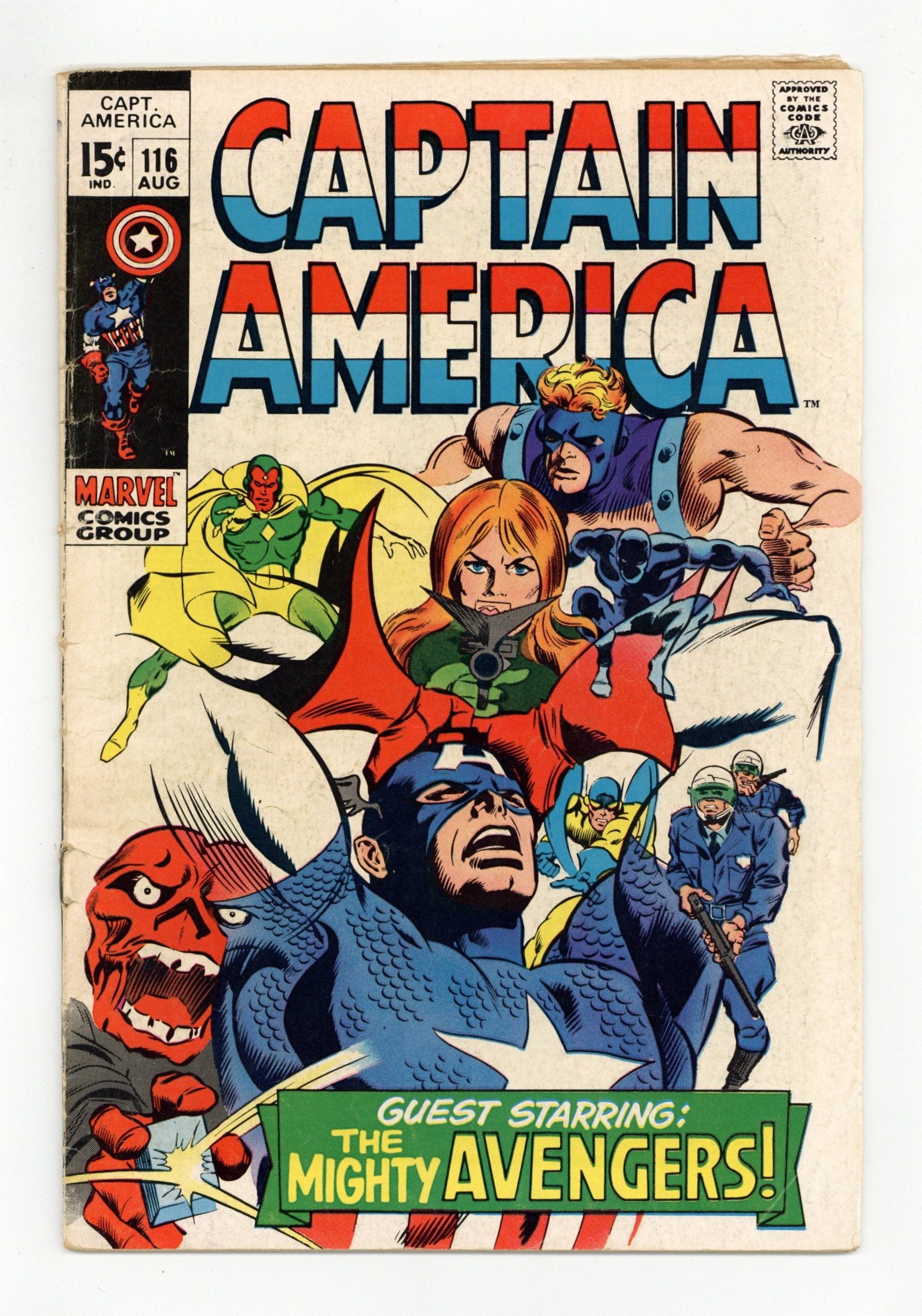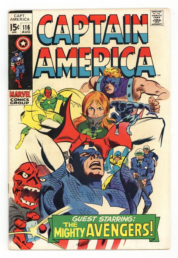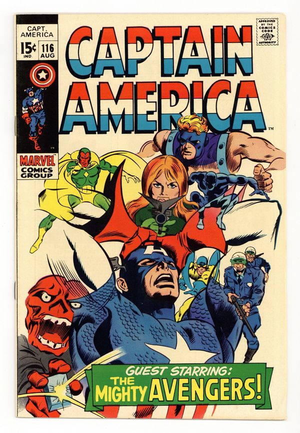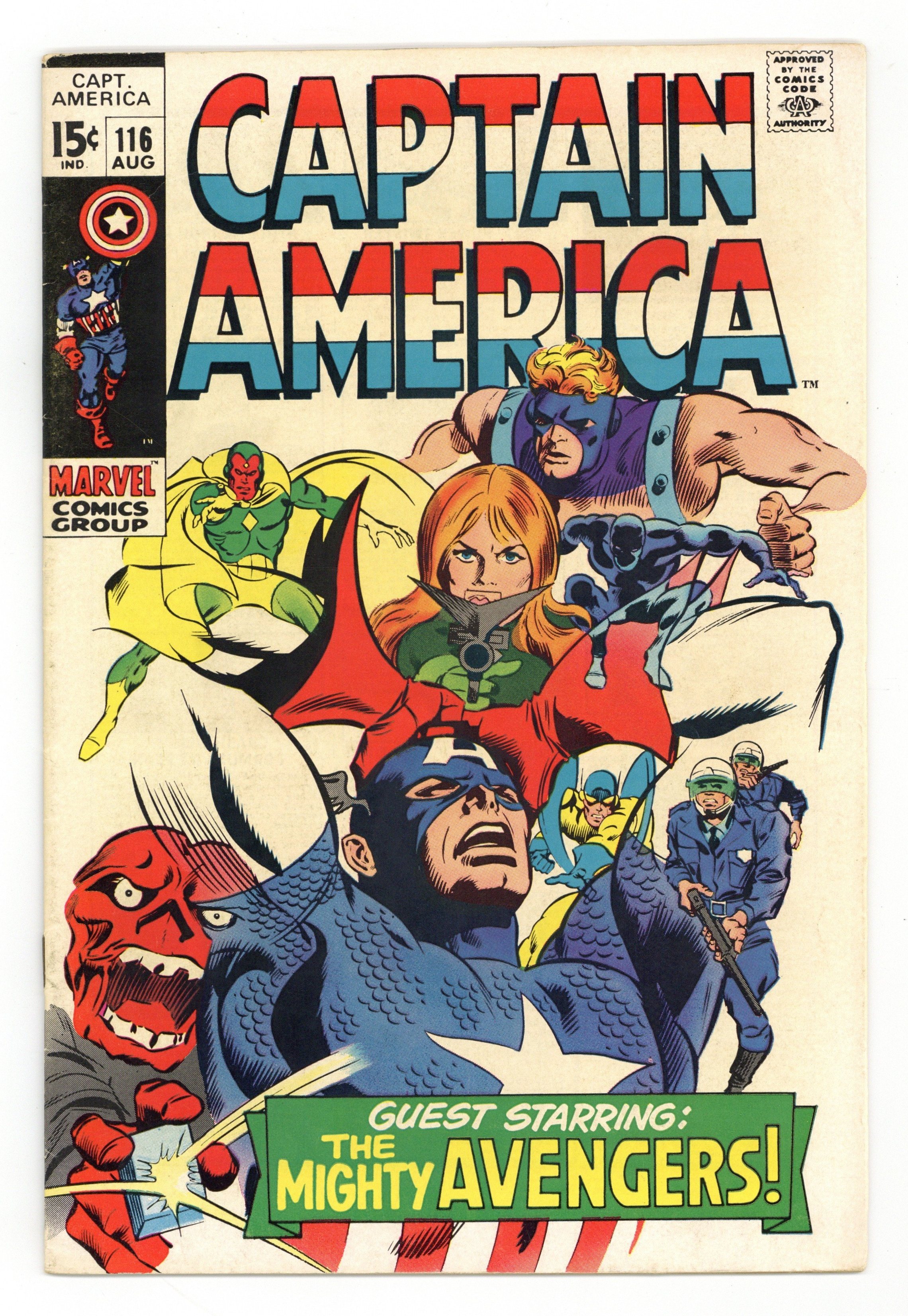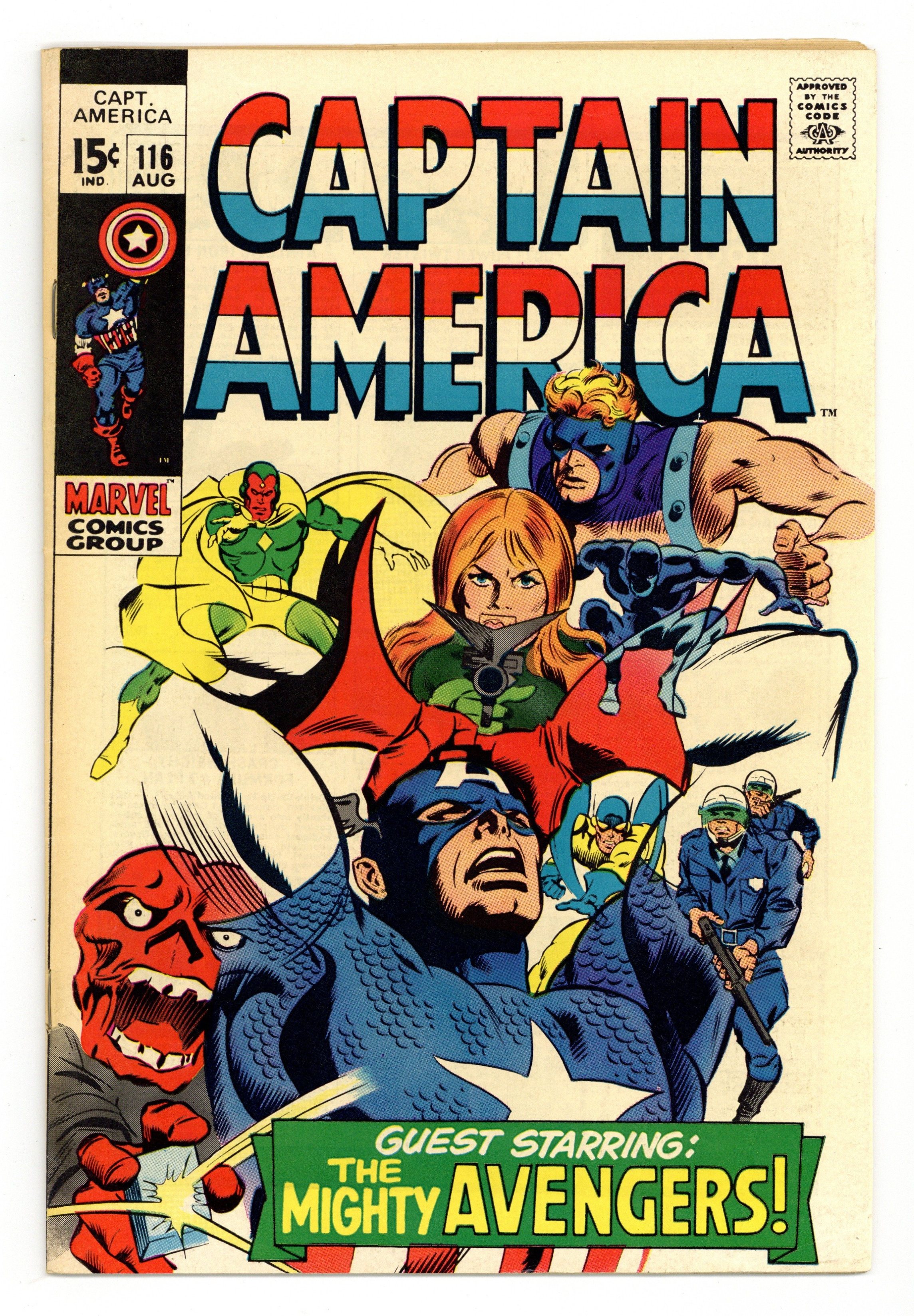 Tags: Marvel Legacy Numbering: Captain America (part 116), Captain America$34.50First 15-cent cover price. Cover pencils by Gene Colan, inks by Joe Sinnott. The Red Skull is still in Cap's body in "Far Worse Than Death!", script by Stan Lee, pencils by Gene Colan, inks by Joe Sinnott; Red Skull transports Captain America outside a government testing lab, wheres hes shot at; Red Skull is disgusted that people admire him since they think he is Captain America, wondering why he doesnt lord it over the people who worship him; Cap, in the Red Skulls body, gets in a high speed chase with the police and then battles the Avengers; The Red Skull uses the Cosmic Cube make Sharon Carter try to kill Captain America. The Black Panther appears on the cover but is not in the story. The Black Panther appears on the cover but is not in the story. 36 pgs., full color. $0.15. Cover price $0.15.