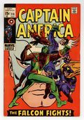 Tags: Marvel Legacy Numbering: Captain America (part 118), Captain America$24.00Cover pencils by Gene Colan and John Romita (alterations), inks by Joe Sinnott and John Romita (alterations). "The Falcon Fights On!", script by Stan Lee, pencils by Gene Colan, inks by Joe Sinnott; Captain America and the Falcon battle the Exiles, who are unaware that their former leader has used the Cosmic Cube to switch bodies with Cap; Rick Jones gives up the identity of Bucky; The Red Skull prepares for a battle with Cap. Letter to the editor from comics writer Steve Gerber. 36 pgs., full color. $0.15. Cover price $0.15.