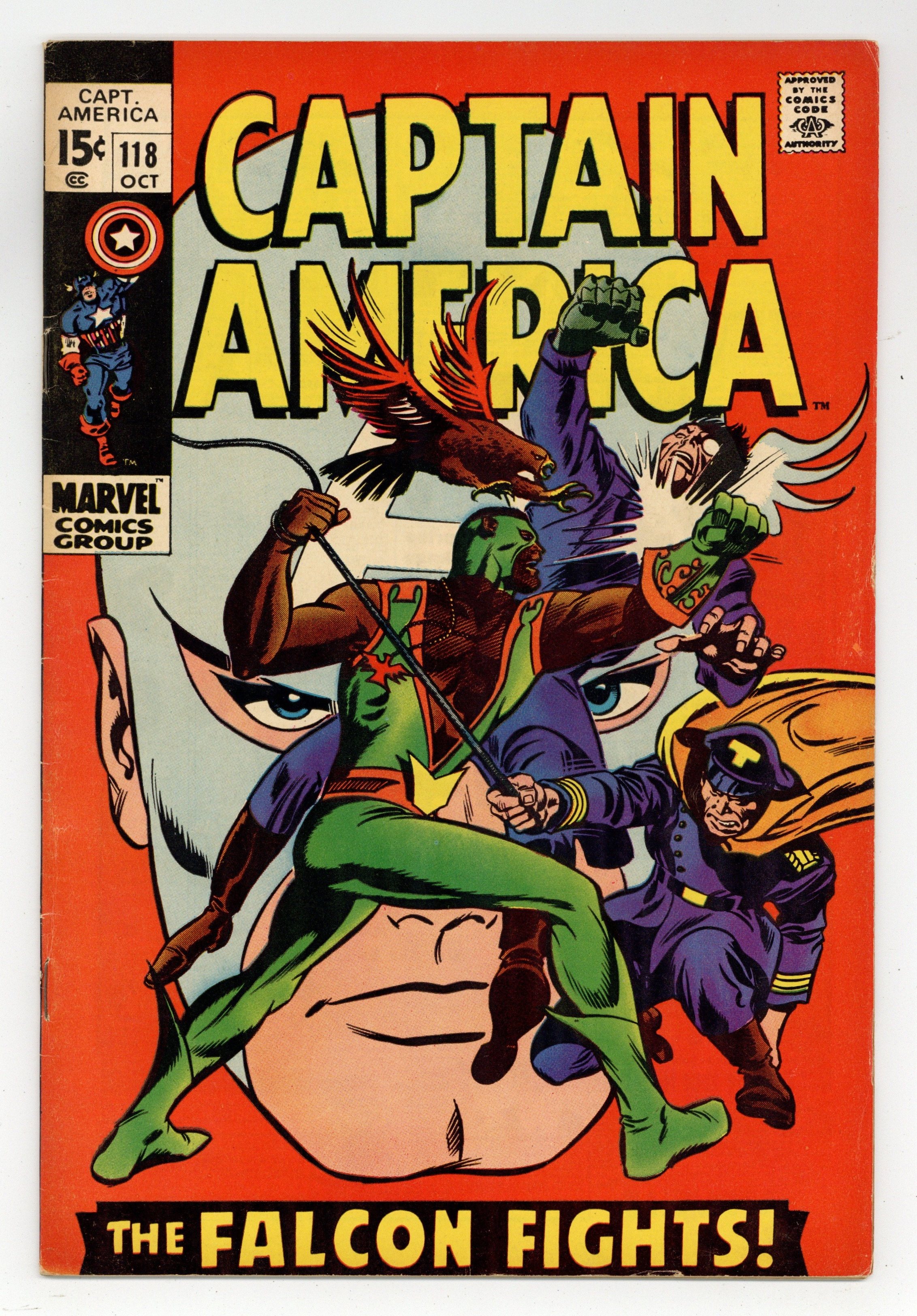 Cover pencils by Gene Colan and John Romita (alterations), inks by Joe Sinnott and John Romita (alterations). "The Falcon Fights On!", script by Stan Lee, pencils by Gene Colan, inks by Joe Sinnott; Captain America and the Falcon battle the Exiles, who are unaware that their former leader has used the Cosmic Cube to switch bodies with Cap; Rick Jones gives up the identity of Bucky; The Red Skull prepares for a battle with Cap. Letter to the editor from comics writer Steve Gerber. 36 pgs., full color. $0.15. Cover price $0.15.