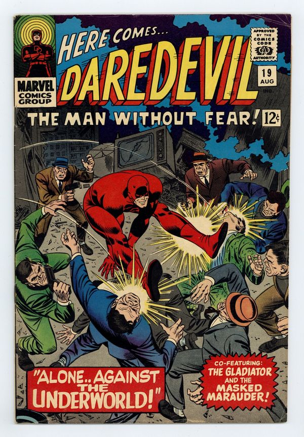 Cover pencils by John Romita, inks by Frank Giacoia. Alone--Against the Underworld!, script by Stan Lee, pencils by John Romita, inks by Frank Giacoia; The Masked Marauder busts Gladiator out of jail and the two fight over the privilege of taking Foggy Nelson, a.k.a. Daredevil, down; Everything is going as planned until the real DD shows up to save Foggy's chubby butt; cameos by Dr. Strange, Captain America, and Dr. Doom (as costumes in the Gladiator's costume shop). Cover price $0.12.