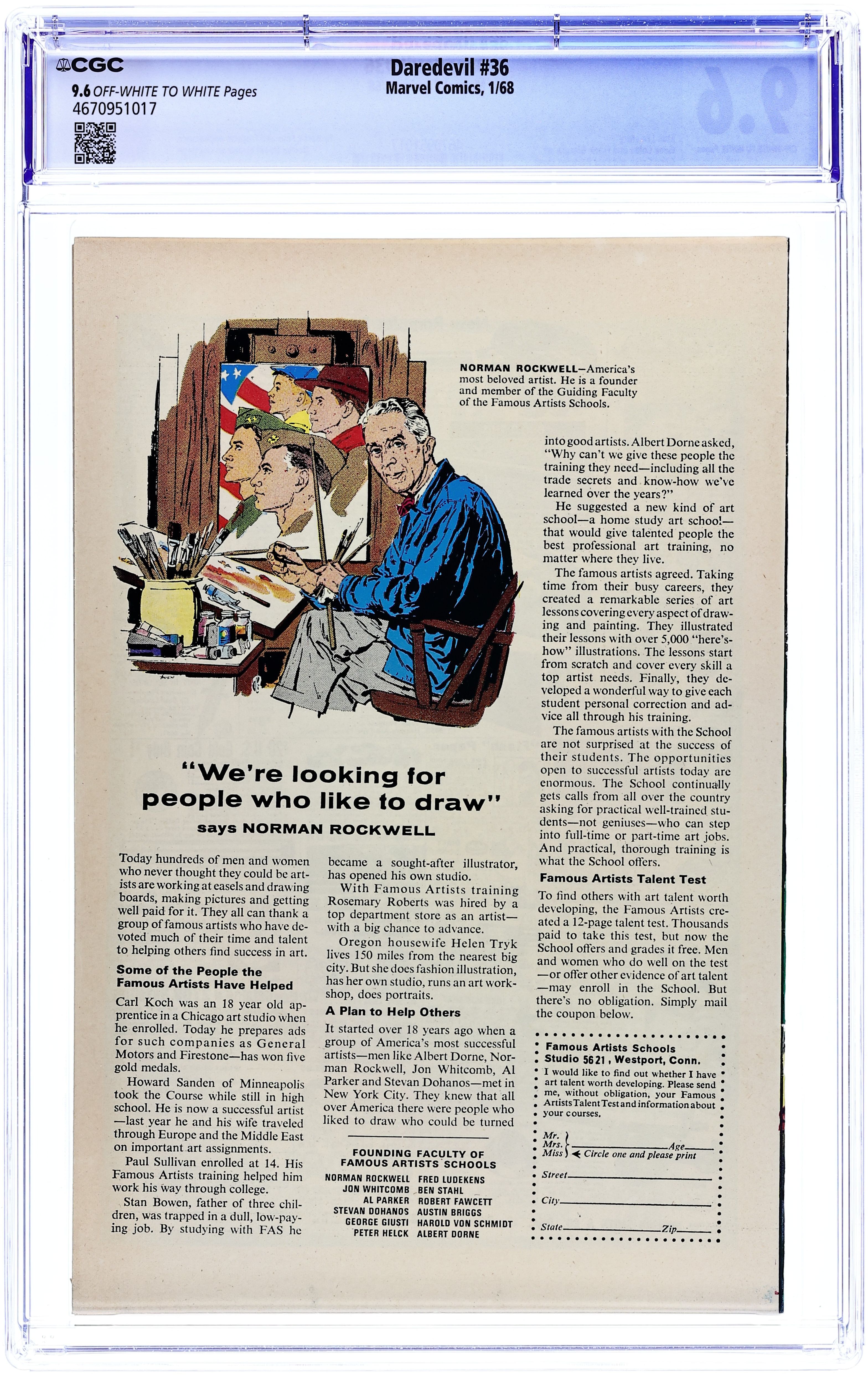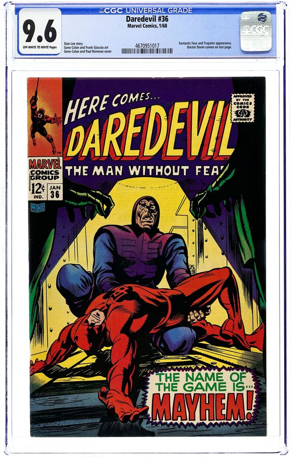 Tags: Marvel Legacy Numbering: Daredevil (part 36), Daredevil$21.00Cover pencils by Gene Colan, inks by Paul Reinman. The Name of the Game Is Mayhem!, script by Stan Lee, pencils by Gene Colan, inks by Frank Giacoia; DD saves the Invisible Girl from the Trapster, but in the ensuing battle, hurts his back as he takes down the villain; Foggy is asked to run for District Attorney; Debbie Harris is paroled from prison and contacts Foggy; Dr. Doom shows up. Cover price $0.12.