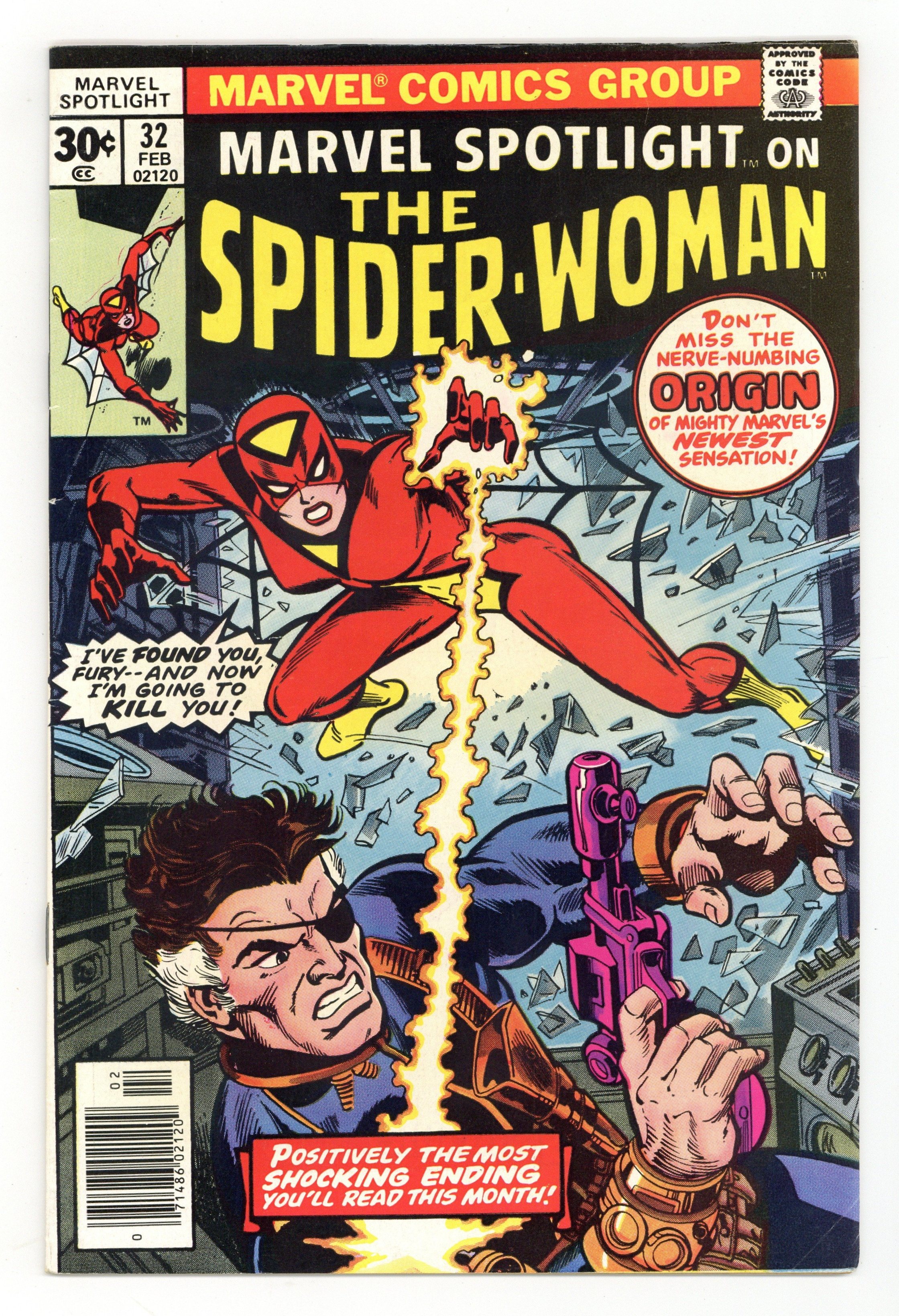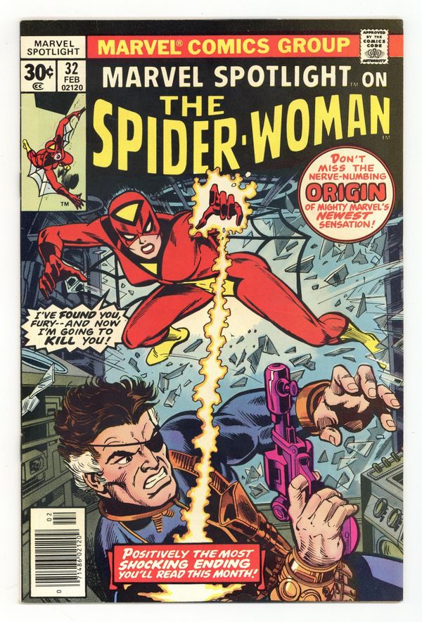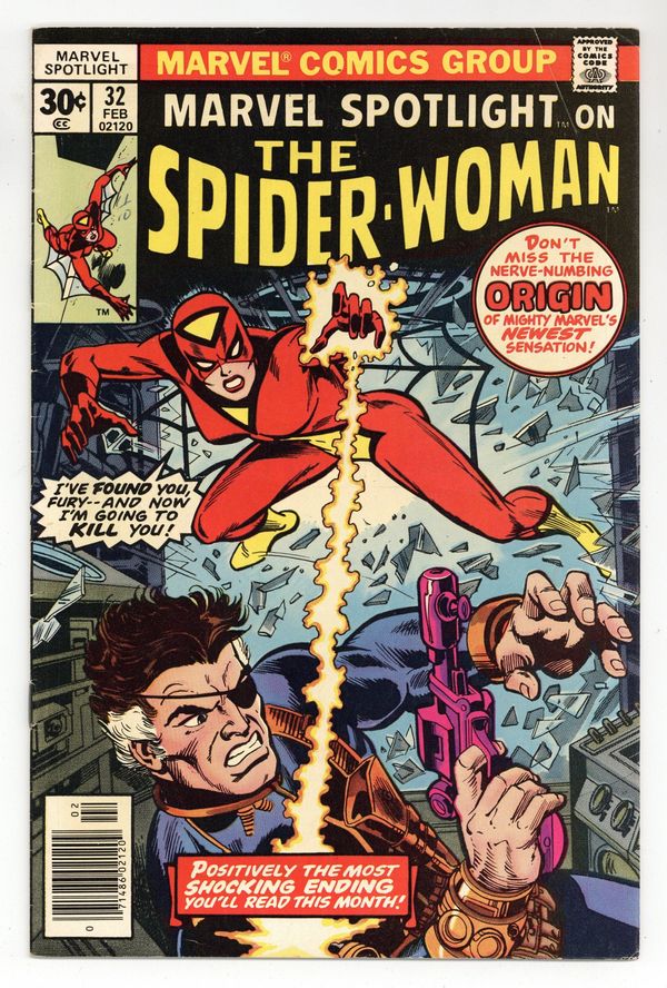 Origin and 1st appearance of Spider-Woman. Cover pencils by Gil Kane and John Romita (alterations), inks by Dick Giordano (?) and John Romita (alterations). Dark Destiny!, script by Archie Goodwin, pencils by Sal Buscema (breakdowns) and Jim Mooney (finished art), inks by Jim Mooney; the mysterious Spider-Woman is tricked by Hydra into trying to kill Nick Fury. Continued in Spider-Woman #1. 36 pages, full color. Cover price $0.30.