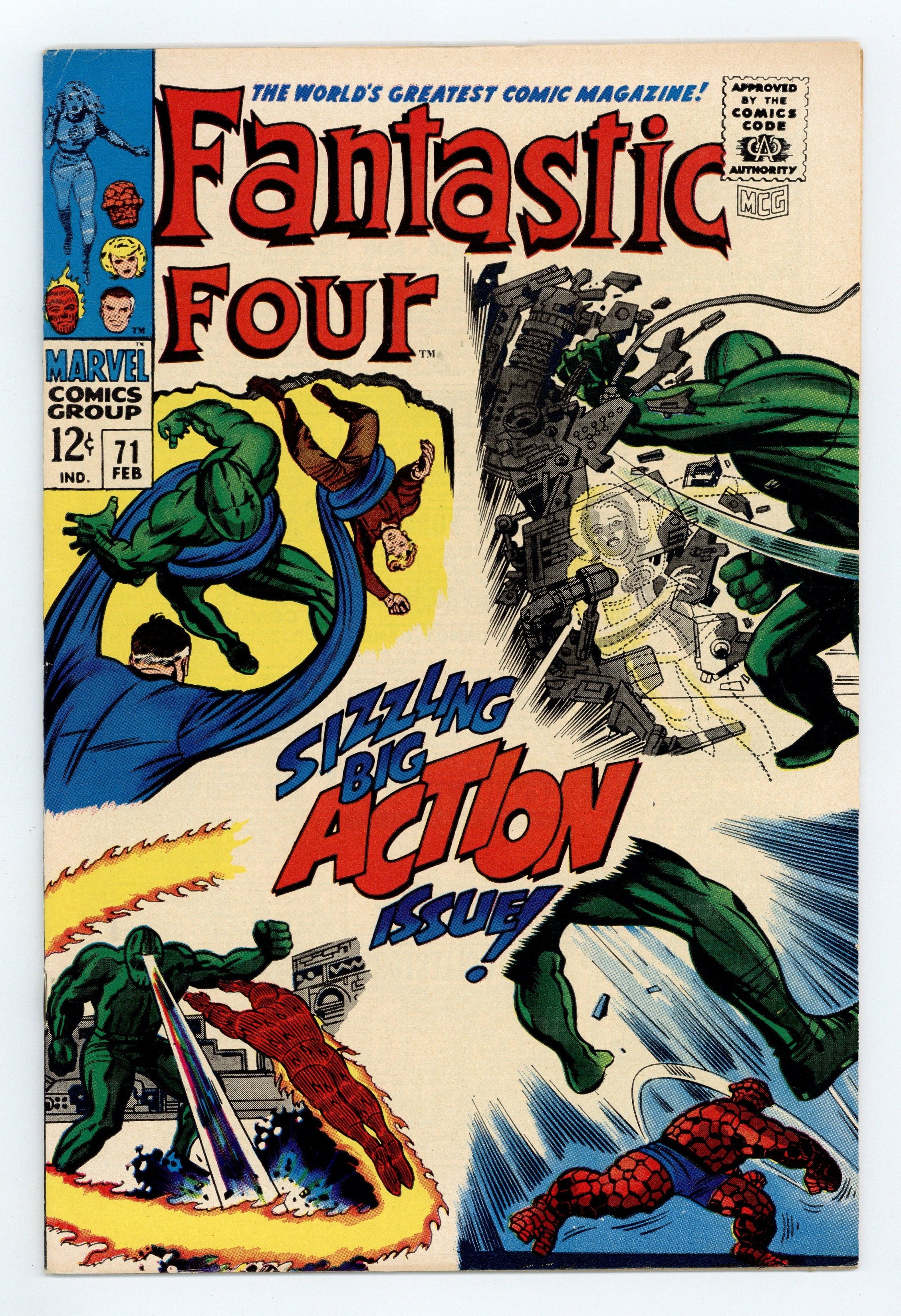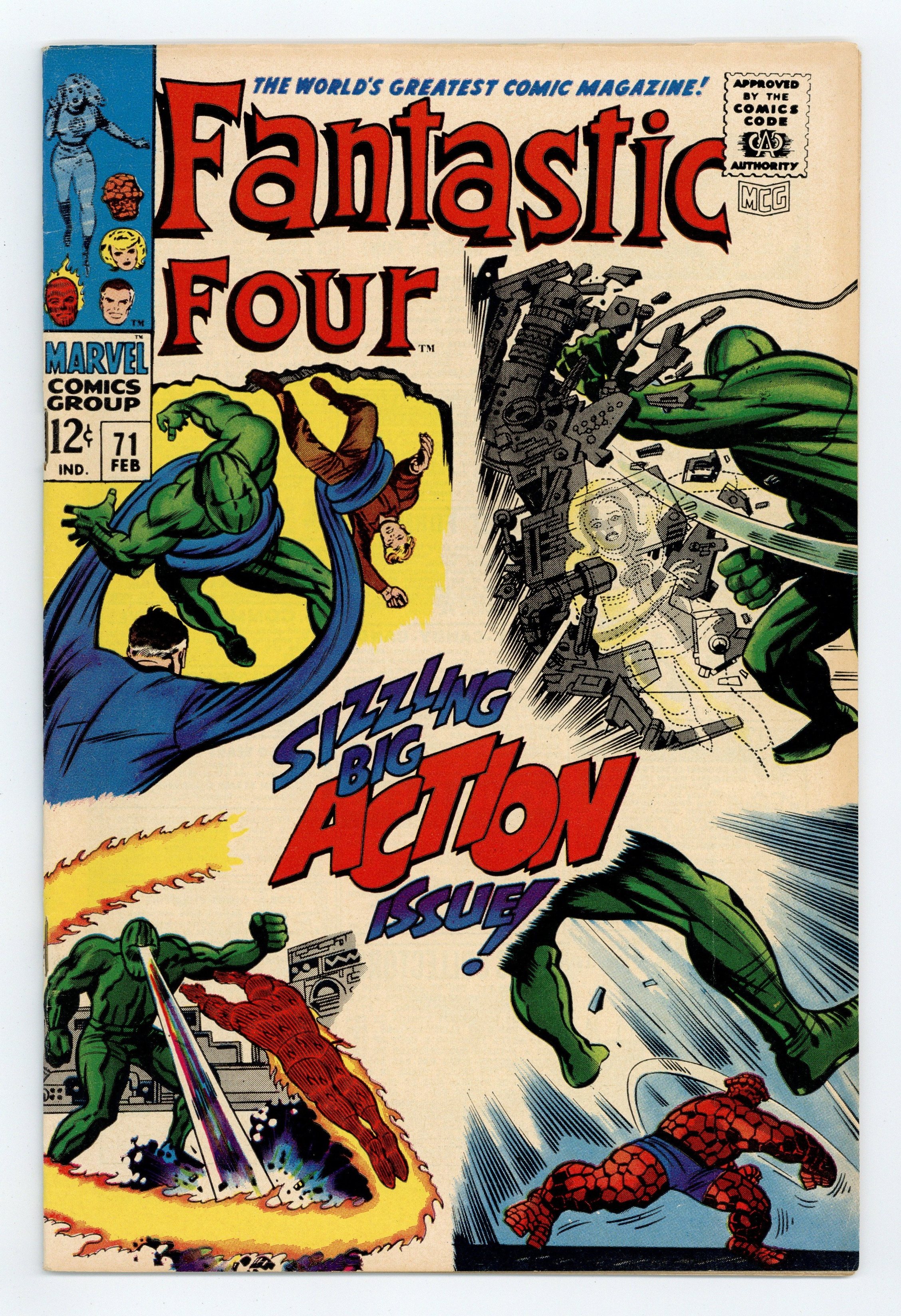 Cover pencils by Jack Kirby, inks by Joe Sinnott. ...and So It Ends..., script by Stan Lee; Jack Kirby (co-plot), pencils by Jack Kirby, inks by Joe Sinnott; Ben, with his mind restored helps the others defeat the Thinker's android. Crystal (of the Inhumans) appearance. 36 pgs. $0.12. Cover price $0.12.