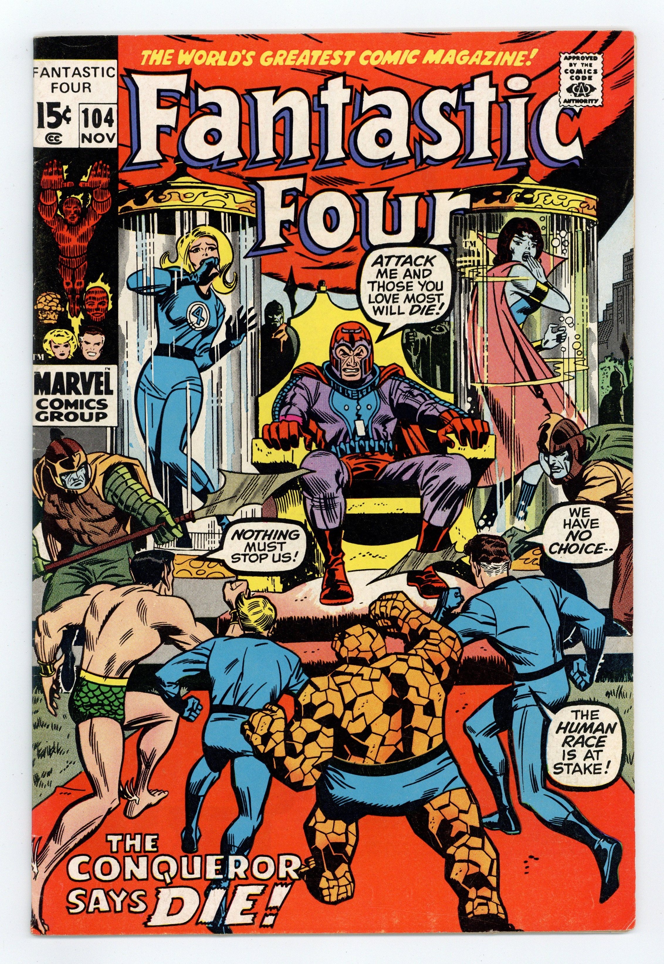 "Our World Enslaved!" Part 3 of 3. Guest-starring the Sub-Mariner. Script by Stan Lee. Pencils by John Romita. Inks by John Verpoorten. Cover by John Romita and John Verpoorten. After capturing both the Invisible Girl and Lady Dorma, the Master of Magnetism is in complete control! Magneto has neutralized the United States armed forces and cleared the way for the legions of Atlantis to storm New York City! In a matter of minutes, the X-Men's long-time foe captures the city and sets up his base of operations in Central Park! Unbelievable! Where in the world are the Fantastic Four?!? That's what President Nixon would like to know! Fortunately, one piece of real estate in Manhattan is still free...the Baxter Building! Inside Mr. Fantastic feverishly works on a special weapon to stop Magneto; but Ben, Johnny, and Crystal must buy him time against the attacking Atlanteans! Can Reed's electromagnetic energy converter repulse the Master of Magnetism? It looks like America's final hope! (Note: Magneto returns to battle the Inhumans in Amazing Adventures (2nd series) 9.) 36 pages Cover price $0.15.